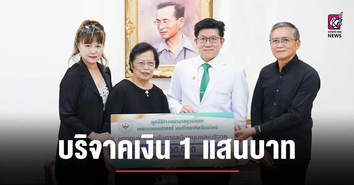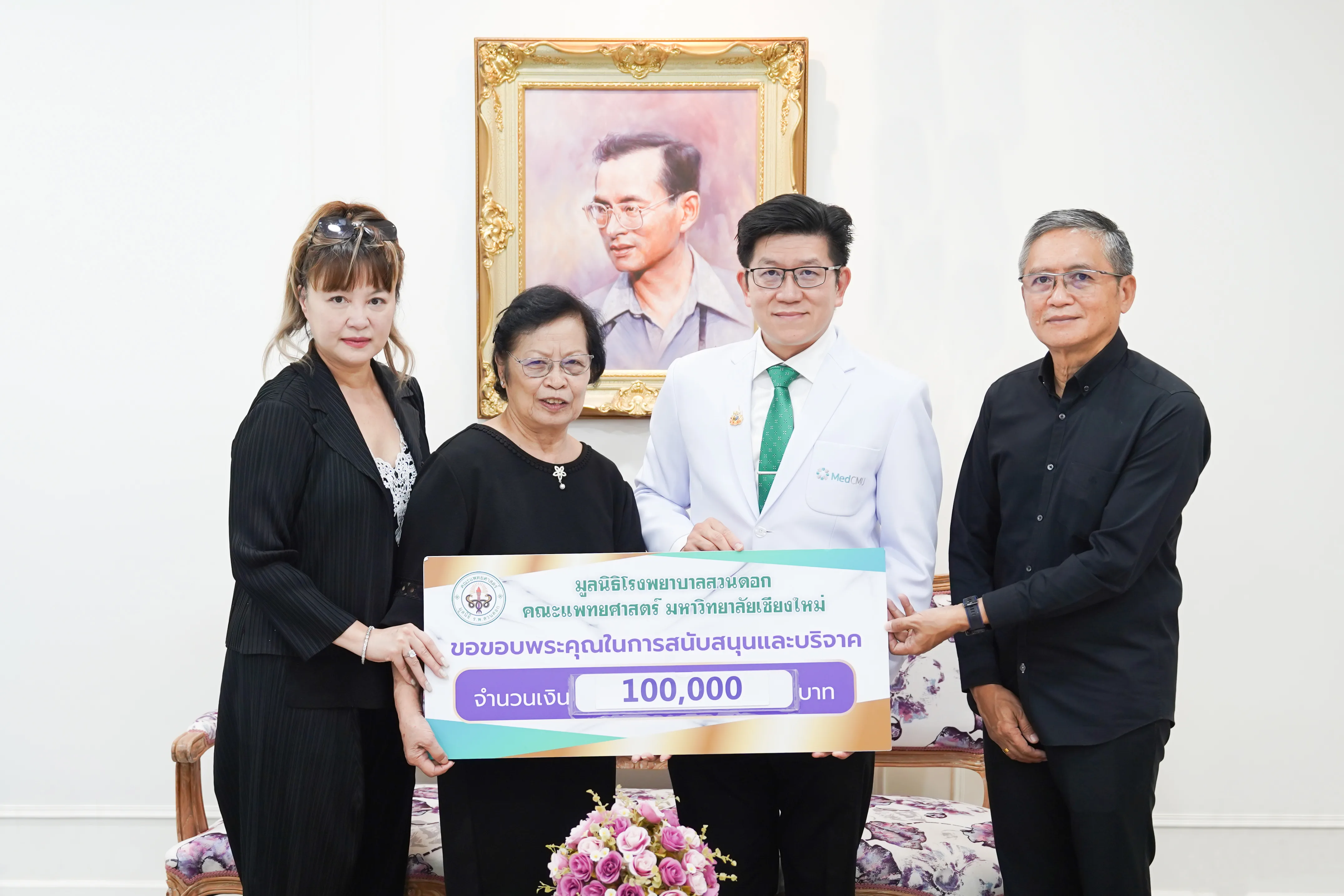 รศ.นพ.นเรนทร์ โชติรสนิรมิต ผู้อำนวยการโรงพยาบาลมหาราชนครเชียงใหม่ รับมอบเงินบริจาค จำนวน 100,000 บาท จากคุณทัศนีย์ ศรีโกไสย พร้อมครอบครัว เพื่ออุทิศส่วนกุศลให้แก่ คุณพ่อประสิทธ์ ศรีโกไสย สมทบทุนมูลนิธิโรงพยาบาลสวนดอก เพื่อจัดซื้อครุภัณฑ์ทางการแพทย์อาคารสุจิณฺโณ จำนวน 50,000 บาท และ สมทบทุนมูลนิธิโรงพยาบาลสวนดอก คณะแพทยศาสตร์ มช. จำนวน 50,000 บาท ในวันที่ 9 ตุลาคม 2567 ณ ศาลาใต้ร่มพระบารมี ชั้น 1 อาคารสุจิณฺโณ คณะแพทยศาสตร์ มหาวิทยาลัยเชียงใหม่