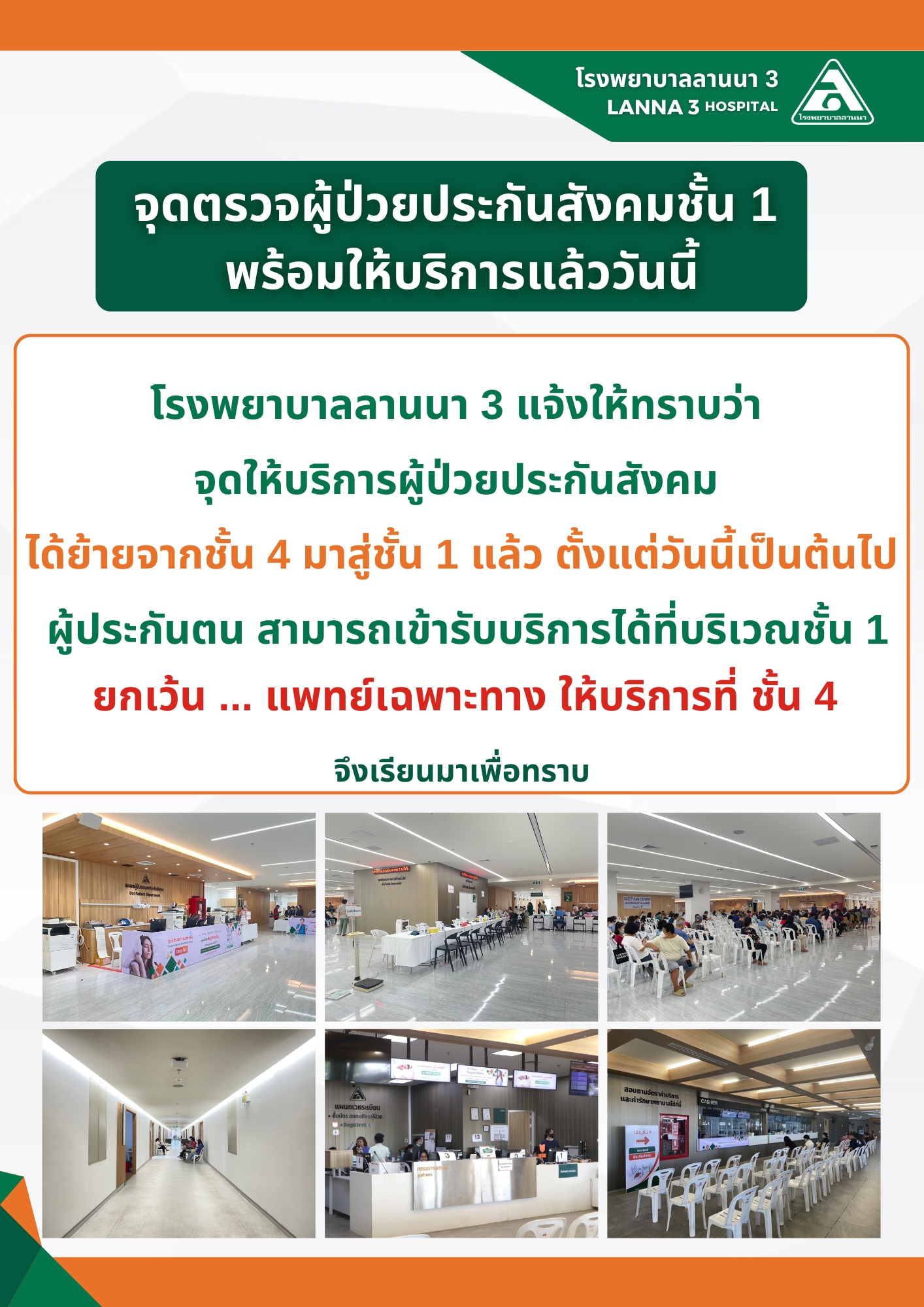 เพื่ออำนวยความสะดวกให้แก่ผู้มาใช้บริการทุกท่าน โรงพยาบาลลานนา 3 ขอแจ้งให้ทราบว่า จุดให้บริการผู้ป่วยประกันสังคม ได้ย้ายจากชั้น 4 ลงมาชั้น 1 แล้ว ตั้งแต่วันนี้เป็นต้นไป ผู้ประกันตนสามารถเข้ารับบริการได้ที่ชั้น 1 ซึ่งมีความสะดวกสบายมากยิ่งขึ้น ทั้งทางเข้า-ออกที่สะดวกสบาย และพื้นที่บริการที่กว้างขวาง พร้อมให้บริการทุกท่าน