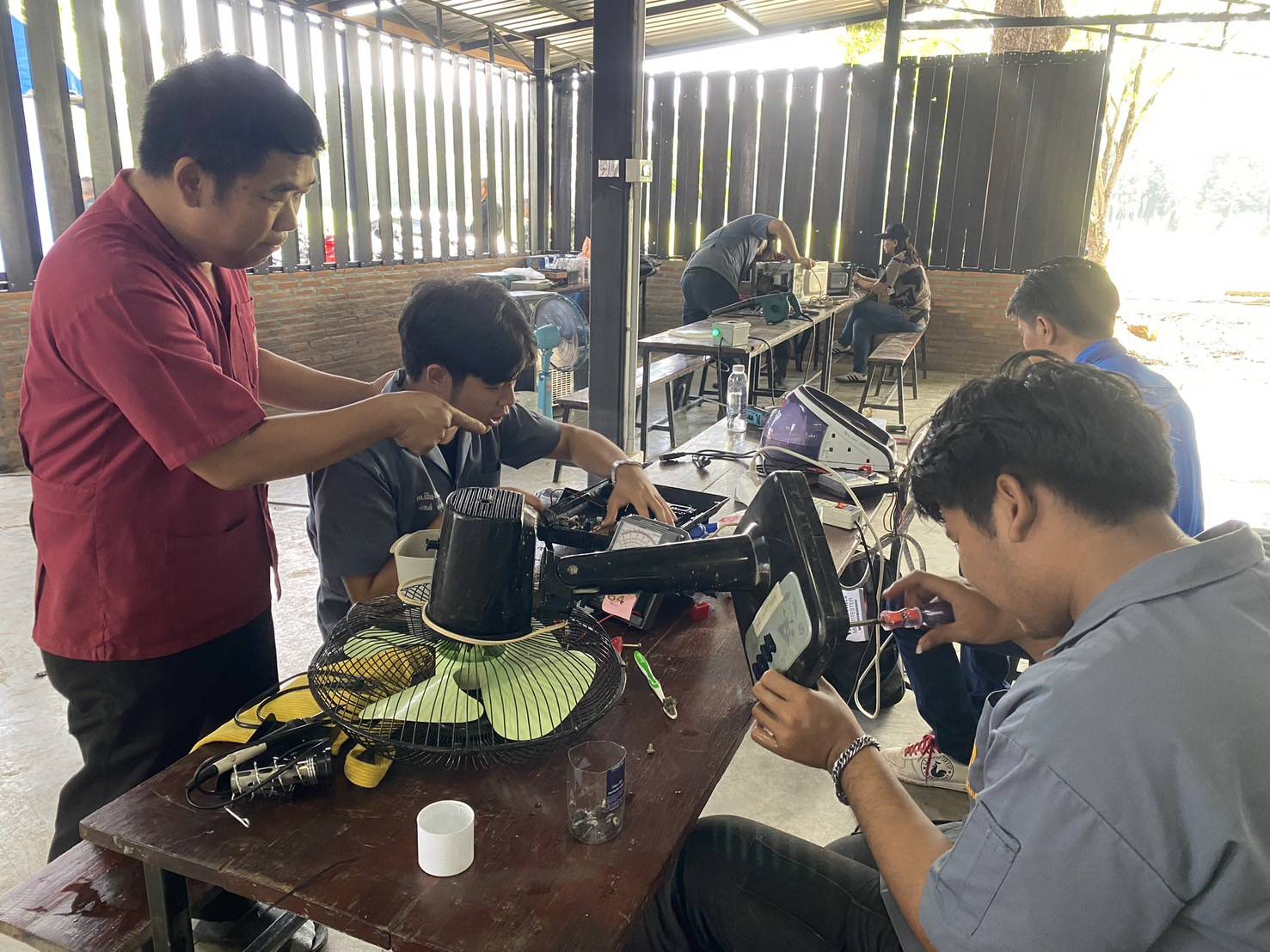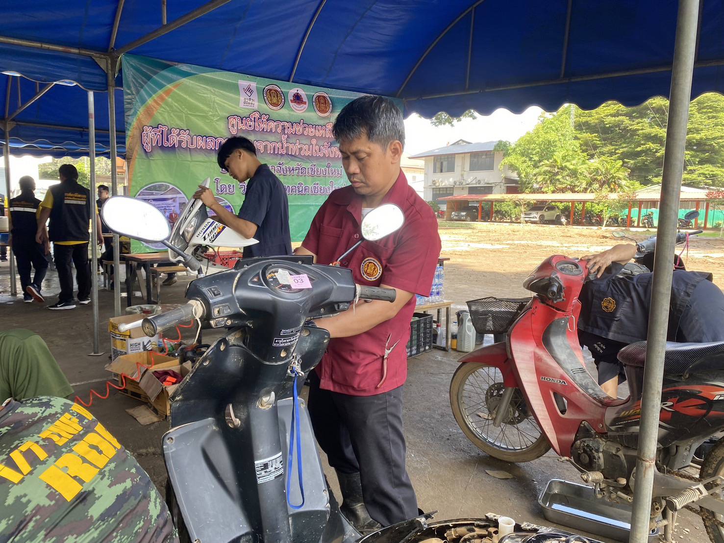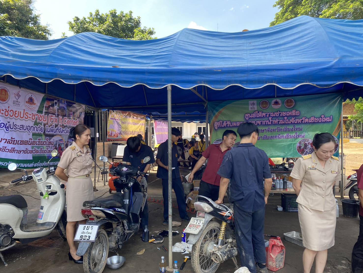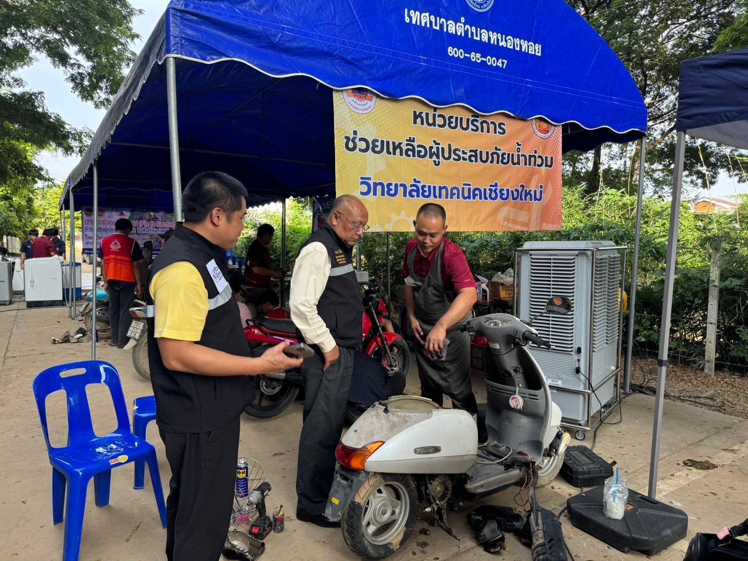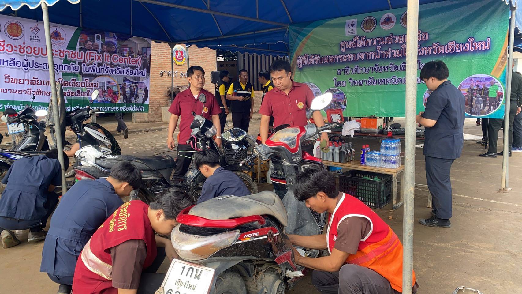 ระหว่างวันที่ 15 – 18 ตุลาคม 2567 ดร.วัชรพงศ์ ฝั้นติ๊บ ผู้อำนวยการวิทยาลัยเทคนิคเชียงใหม่ ปฏิบัติหน้าที่ ผู้อำนวยการสำนักงานอาชีวศึกษาจังหวัดเชียงใหม่ มอบหมายให้ทีมงานโครงการพิเศษฯและการบริการชุมชน พร้อมด้วยคณะครูแผนกวิชาช่างยนต์ แผนกวิชาช่างไฟฟ้า และแผนกวิชาช่างอิเล็กทรอนิกส์ ออกตั้งศูนย์ Fix It Center ช่วยเหลือผู้ประสบอุทกภัยจังหวัดเชียงใหม่ โดยให้บริการซ่อมเครื่องใช้ไฟฟ้าอิเล็กทรอนิกส์ ยานพาหนะ และอุปกรณ์ทางการเกษตร ของประชาชนในเขตพื้นที่จังหวัดเชียงใหม่ จำนวน 3 จุดบริการ ได้แก่