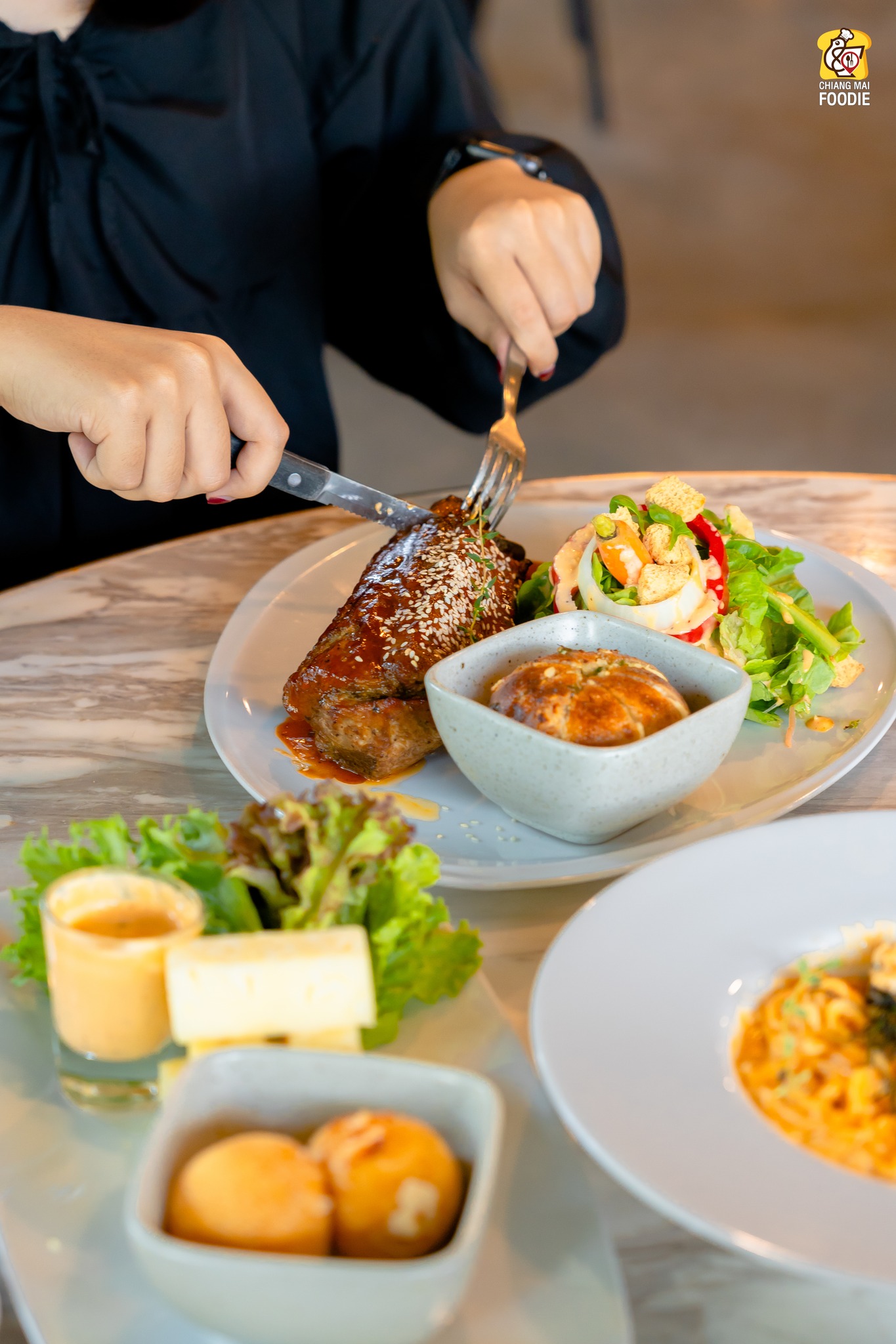 ที่ร้านมีเมนูหลากหลาย ทั้งสลัด สเต็ก พาสต้า เหมาะกับทุกเพศทุกวัย ร้านกว้างขวาง มีมุมให้เด็กๆ ได้เล่น