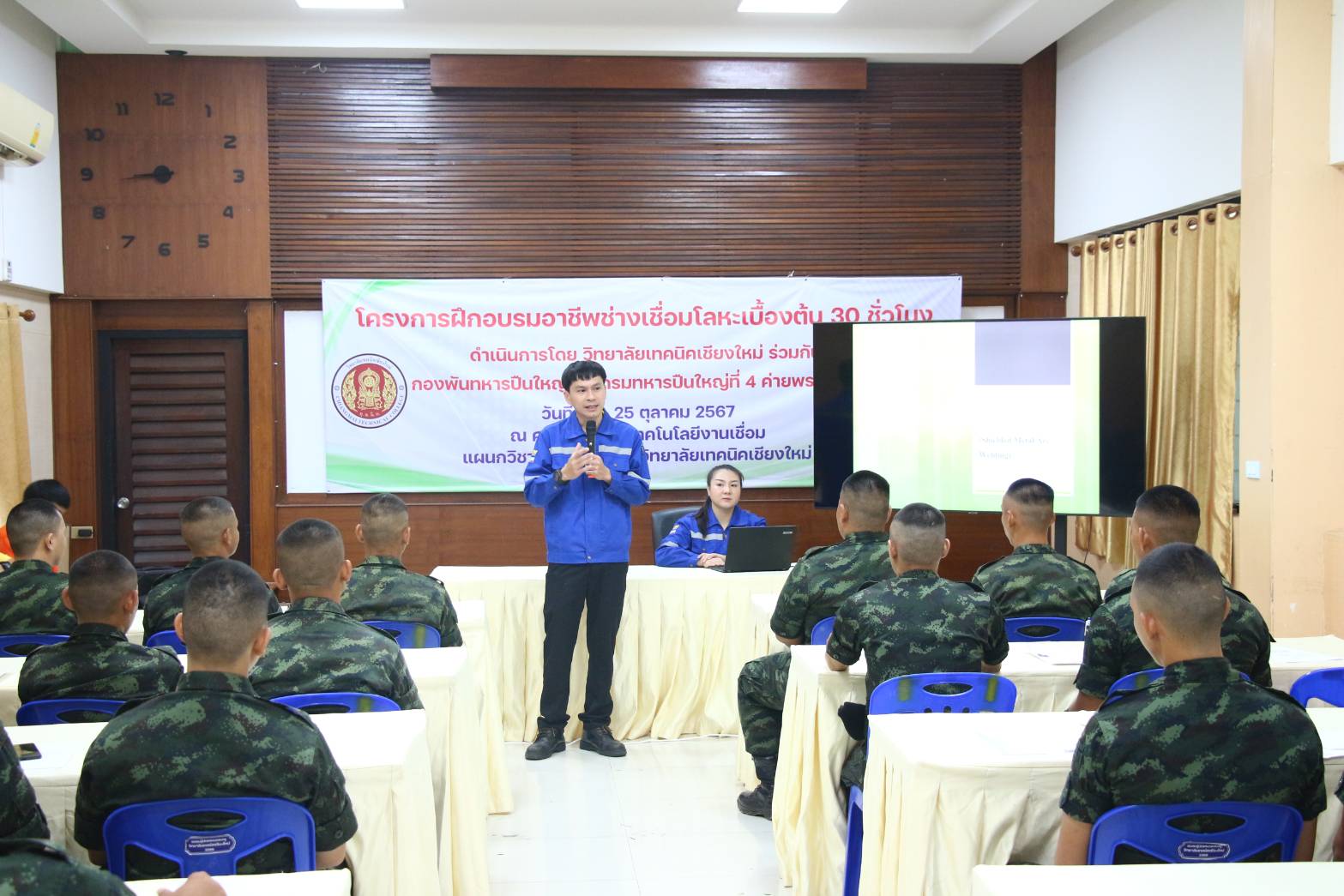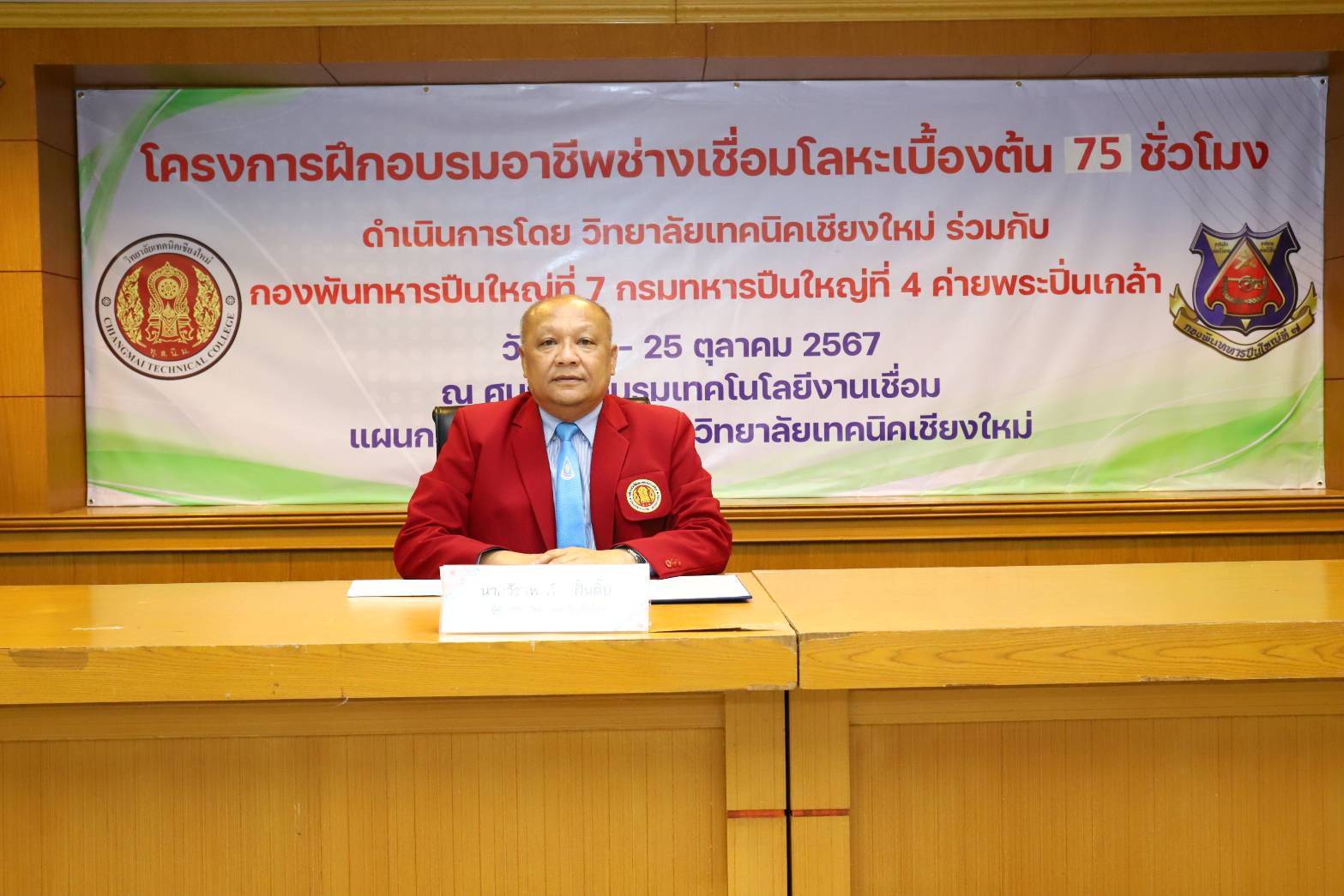 พร้อมด้วย ชรันต์ยุทธ์ บุญยง รองผู้อำนวยการฝ่ายวิชาชาการ นางศศิกาญจน์ เรือนศาสตร์ รองผู้อำนวยการ ฝ่ายพัฒนากิจการนักเรียน นักศึกษา และนางสาวอรณี จริยา รองผู้อำนวยการฝ่ายแผนงาน และความร่วมมือ คณะครูแผนกวิชาช่างเชื่อมโลหะ เข้าร่วม ดำเนินการโดย วิทยาลัยเทคนิคเชียงใหม่ ร่วมกับ กองพันทหารปืนใหญ่ที่ 7 กรมทหารปืนใหญ่ที่ 4 ค่ายพระปิ่นเกล้าระหว่างวันที่ 21-25 ตุลาคม 2567 ณ ศูนย์ฝึกอบรมเทคโนโลยีงานเชื่อม แผนกวิชาช่างเชื่อมโลหะ วิทยาลัยเทคนิคเชียงใหม่