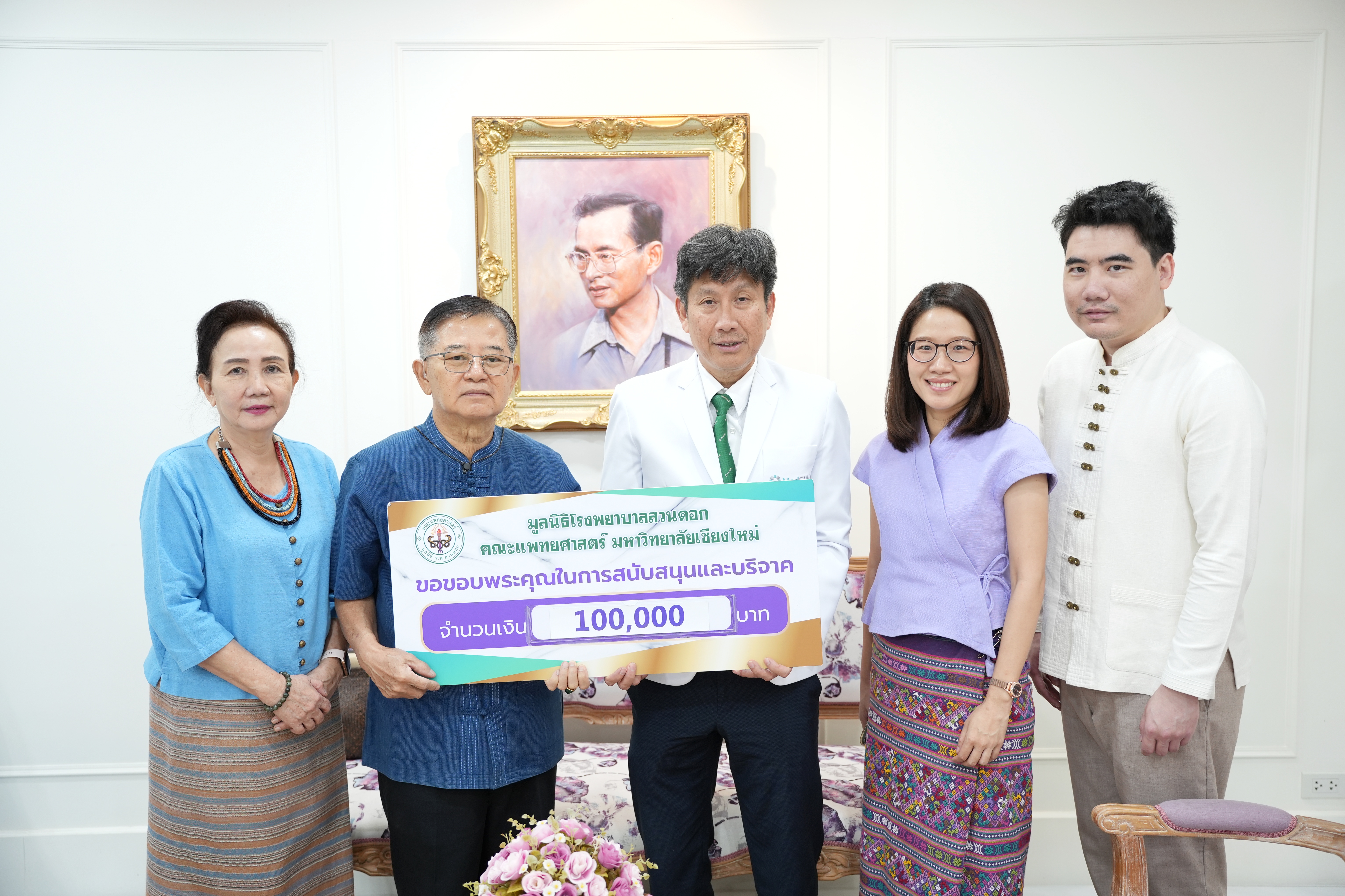 รศ.นพ.ณัฐพงศ์ โฆษชุณหนันท์ รองคณบดีคณะแพทยศาสตร์ มช.รับมอบเงินบริจาค จำนวน 100,000 บาท จากคุณสุรชัย จงรักษ์ พร้อมครอบครัว สมทบทุนมูลนิธิโรงพยาบาลสวนดอก เพื่อผู้ป่วยยากไร้ จำนวน 50,000 บาท และ สมทบทุนมูลนิธิโรงพยาบาลสวนดอก เพื่อพระภิกษุสงฆ์อาพาธ จำนวน 50,000 บาท ในวันที่ 25 ตุลาคม 2567 ณ ศาลาใต้ร่มพระบารมี ชั้น 1 อาคารสุจิณฺโณ คณะแพทยศาสตร์ มช.
