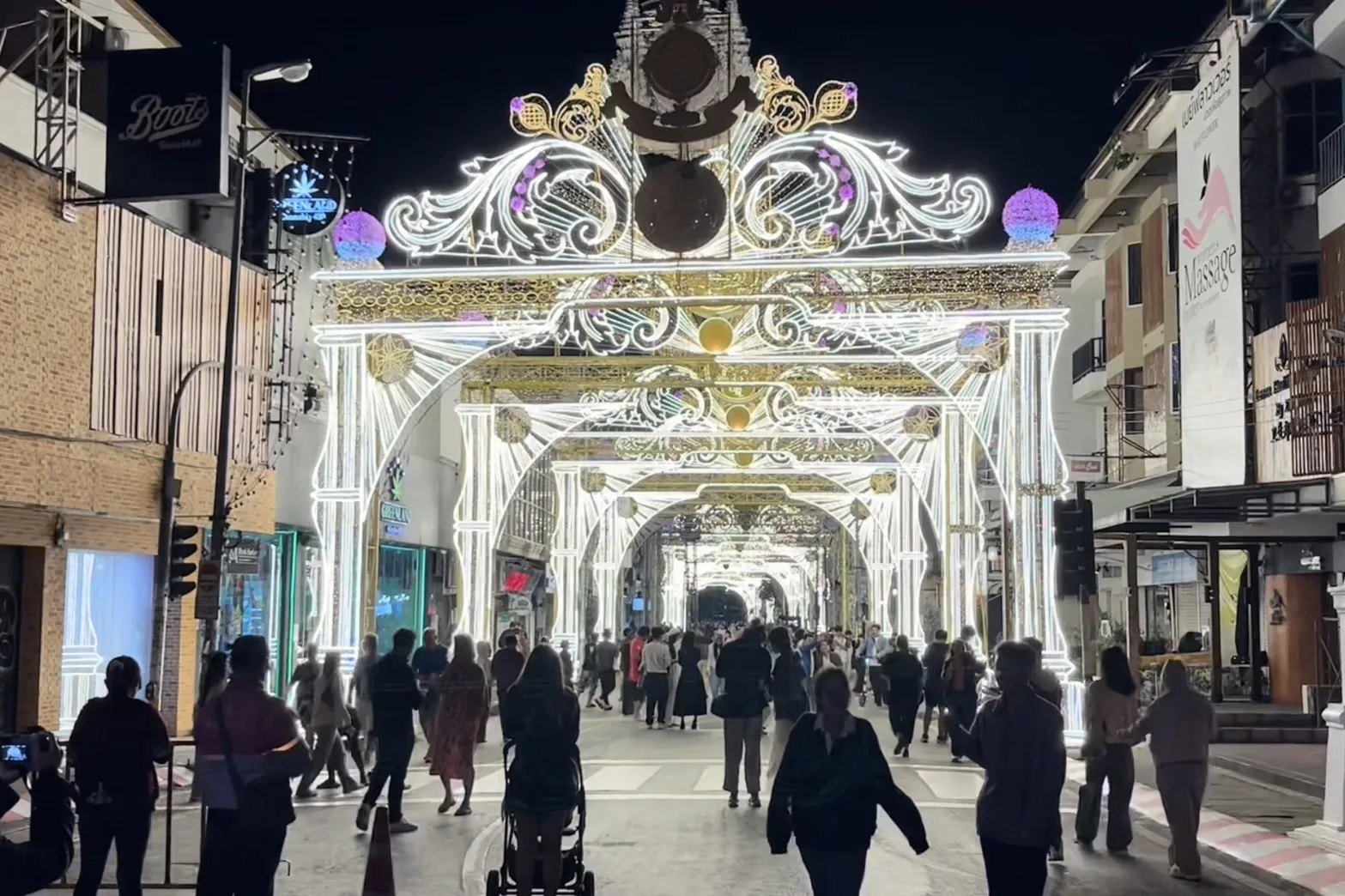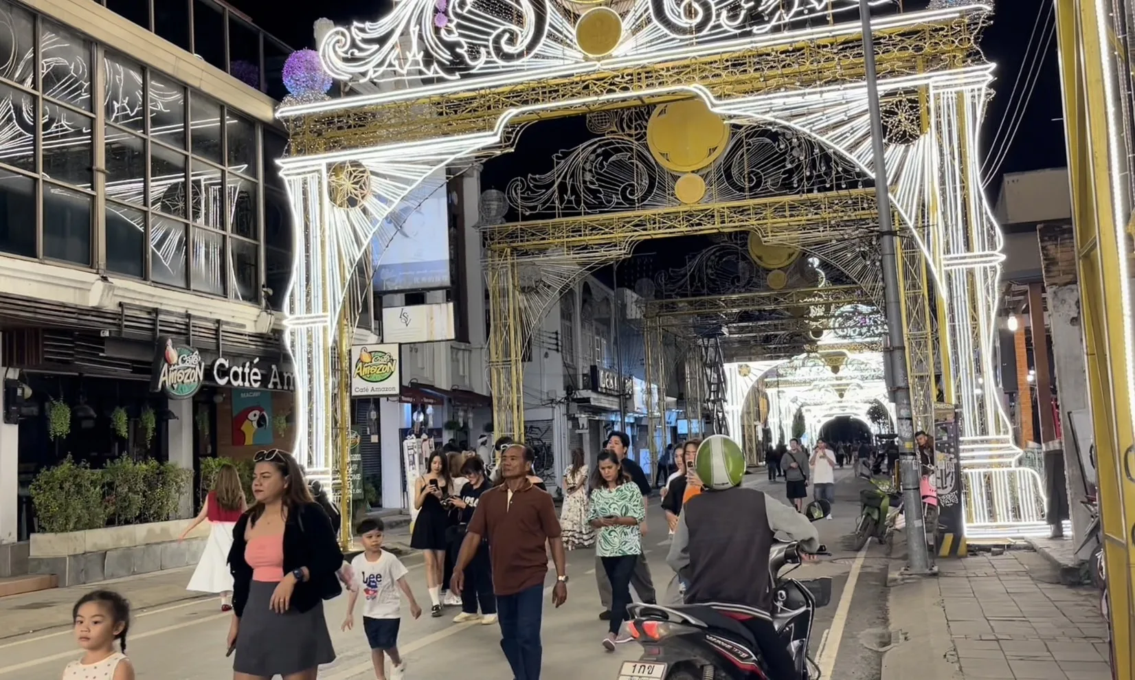 ช่วงค่ำคืนวันนี้ (8 พ.ย.67) บรรยากาศภายในตัวเมืองเชียงใหม่ ที่สภาพอากาศค่อนข้างเย็น หลังจากช่วง 2-3 วันที่ผ่านมา ในพื้นที่มีฝนตกลงมาอย่างต่อเนื่อง จนส่งผลทำให้อุณหภูมิลดฮวบ ขณะที่ในวันนี้ นักท่องเที่ยวที่มีทั้งคนไทยและต่างชาติพากันไปเดินชมและถ่ายภาพกับแสงสีและความสวยงามของซุ้มไฟ ที่มีการตกแต่งประดับประดาด้วยแสงไฟสวยงาม ตลอดถนนทั้งสาย ตั้งแต่แยกวัดอุปคุตไปจนถึงลานเอนกประสงค์ข่วงประตูท่าแพ ซึ่งเทศบาลนครเชียงใหม่ติดตั้งซุ้มไฟทั้งหมดนี้ เพื่อต้อนรับประเพณีเดือนยี่เป็งเชียงใหม่ประจำปี 2567 ที่จัดขึ้นระหว่างวันที่ 14-17 พฤศจิกายน นี้