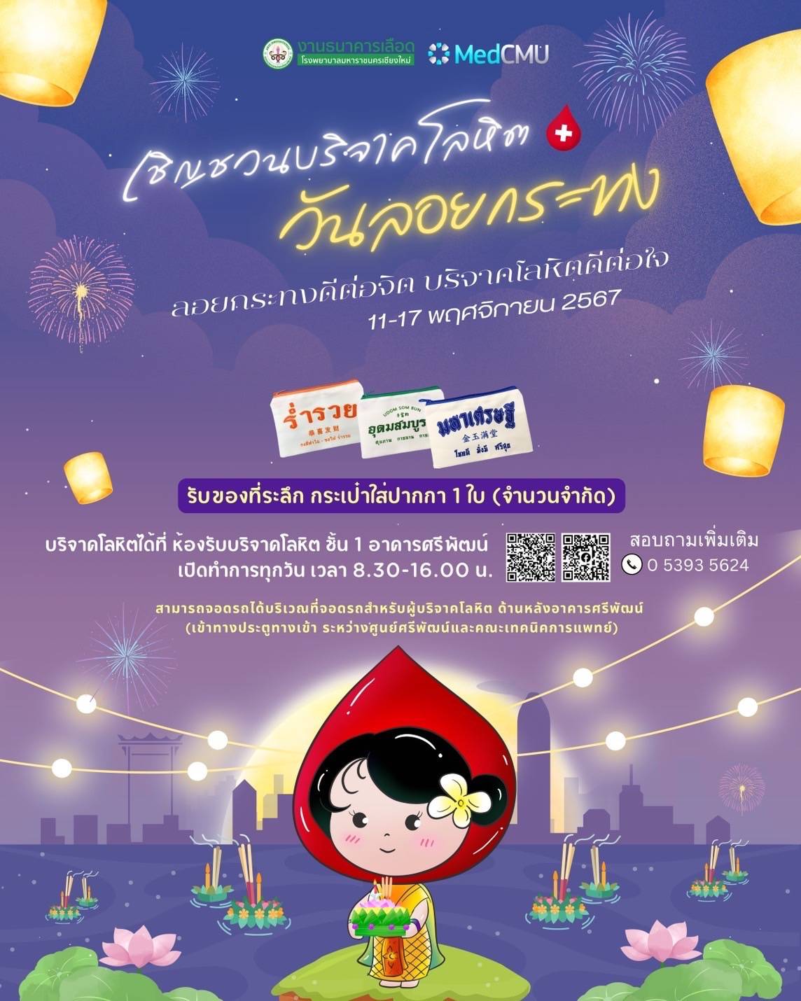 ขอเชิญผู้มีจิตศรัทธาร่วมบริจาคโลหิตเพื่อช่วยเหลือชีวิตผู้ป่วย เนื่องในวันลอยกระทง 2567