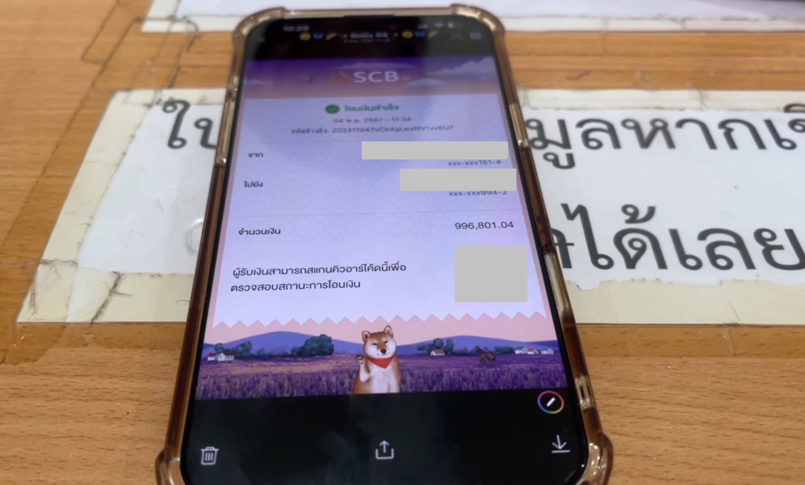 กระทั่งวันที่ 4 พ.ย. 67 ก็มีโทรศัพท์จากชายคนหนึ่งอ้างว่าเป็นตำรวจไซเบอร์ และบอกว่าสามารถจับกุมเจ้าของเพจดังกล่าวที่โกงเงินจากเธอได้แล้ว จากนั้นให้แอดไลน์ที่เป็นรูปตำรวจไซเบอร์ และยังบอกว่าหากมี @ ด้านหน้าจะเป็นไลน์โจร และไลน์นี้ไม่มี @ เป็นของจริง ชื่อไลน์ CYBER จากนั้นมีการพูดคุยกันและหลอกล่อต่าง ๆ นานา ว่าบัญชีของเธอพัวพันกับธุรกิจมืด เพราะอาจเกี่ยวข้องกับการเปิดบัญชีม้ากับนายนพกาย กระทั่งให้เธอโอนเงินจากบัญชีธนาคารไปตรวจสอบ ซึ่งในบัญชีมีเงินสดอยู่ประมาณ 9 หมื่นกว่าบาท และเงินโอดีจากแบงก์อีก 9 แสนบาท ซึ่งเธอก็โอนไปทั้งหมด