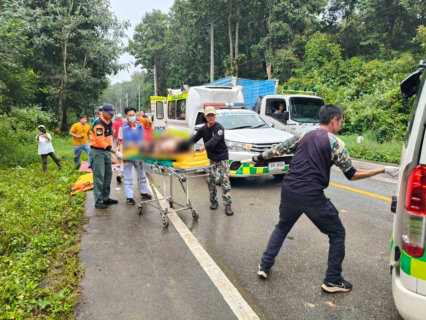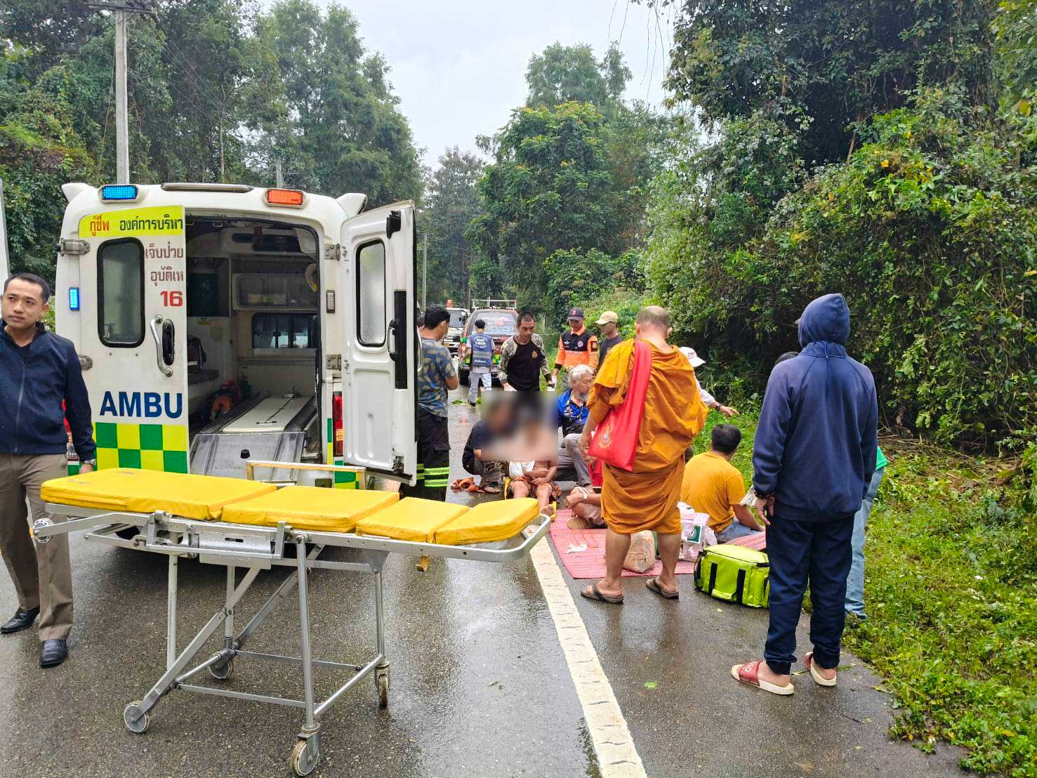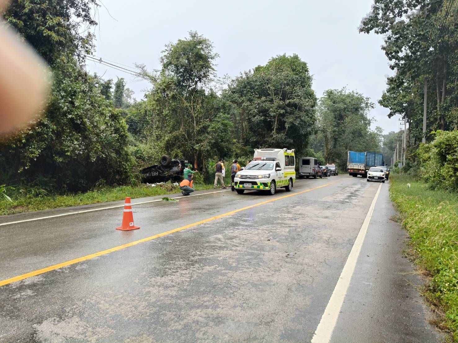 สาเหตุของอุบัติเหตุ: เจ้าหน้าที่คาดว่า สาเหตุของอุบัติเหตุเกิดจากฝนตกทำให้ถนนลื่น ประกอบกับเป็นทางโค้ง จึงทำให้รถเสียหลักพลิกคว่ำลงข้างทาง