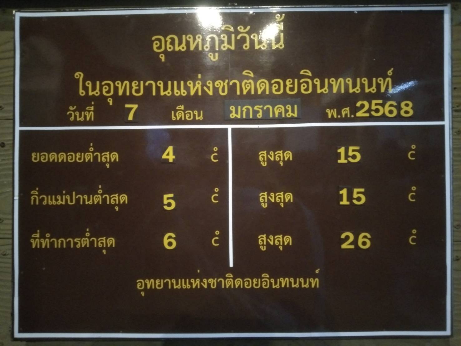อุณหภูมิต่ำสุด 3 องศาเซลเซียสที่กิ่วแม่ปาน (7.00 น.) อุณหภูมิต่ำสุดของหนาวปีนี้ -พบบริเวณ กิ่วแม่ปาน ลานจอดตรงข้ามพระมหาธาตุเจดีย์ (t=3°C)-พบบริเวณ หน่วยพิทักษ์อุทยานแห่งชาติดอยอินทนนท์ ที่ อน.5 (ยอดดอย) (t=7°C ,tยอดหญ้า=0.9 °C)