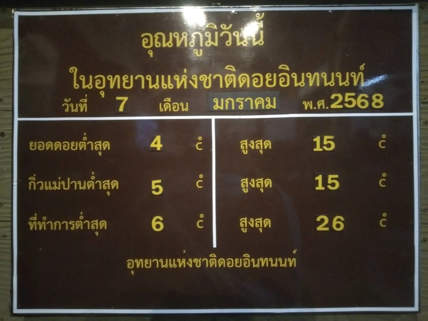 ครั้งที่ 8 วันที่ 29.12.2567 อุณหภูมิต่ำสุด 7 องศาเซลเซียส ที่ยอดดอย (7.00 น.) -พบบริเวณ หน่วยพิทักษ์อุทยานแห่งชาติดอยอินทนนท์ ที่ อน.5 (ยอดดอย) t=7°C ,tยอดหญ้า= -0.1°C)