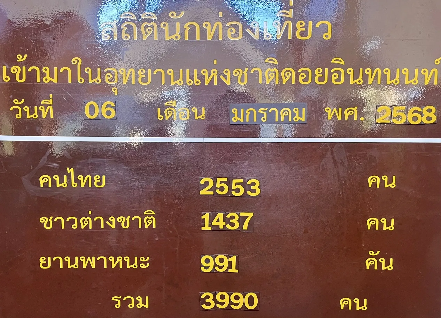 ส่วนสถิตินักท่อ่งงเที่ยวที่เข้ามาในเขตอุทยานแห่งชาติดอยอินทนนท์เมื่อวันที่ 6 ม.ค. 68 ที่ผ่านมา คนไทย 2,553 คน ชาวต่างชาติ 1,437 คน ยานพาหนะ 991 คัน รวม 3,990 คน