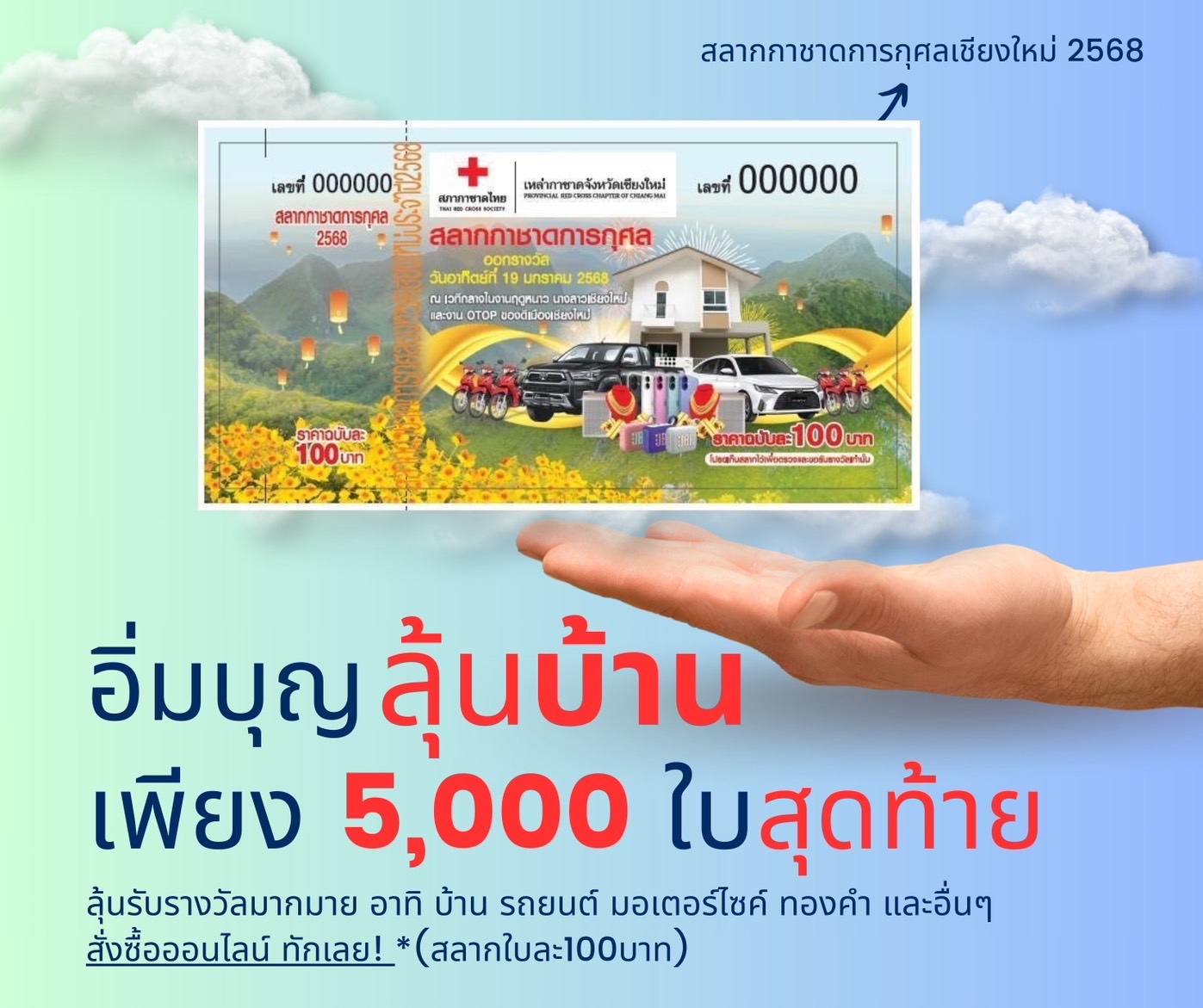 เงินเพียง 100 บาท ลุ้นบ้าน รางวัลใหญ่บ้านหลัง 3.4 ล้าน รถเก๋ง ทองคำ ไอโฟน ปีนี้จัดเต็ม สลากกาชาดการกุศลสามารถซื้อได้ไม่จำกัดจำนวน เพียงสแกน QR Cord การโอนเงิน ธนาคารกสิกรไทย เลขที่บัญชี 171 350 6253 ชื่อบัญชี : บจก.พาวเวอร์ซิคซ์ เท่านั้น (ตัวแทนจำหน่ายสลากกาชาดออนไลน์ ประจำปี 2568) และเตือนระวัง ! มิจฉาชีพแอบอ้าง หลอกโอนเงิน)