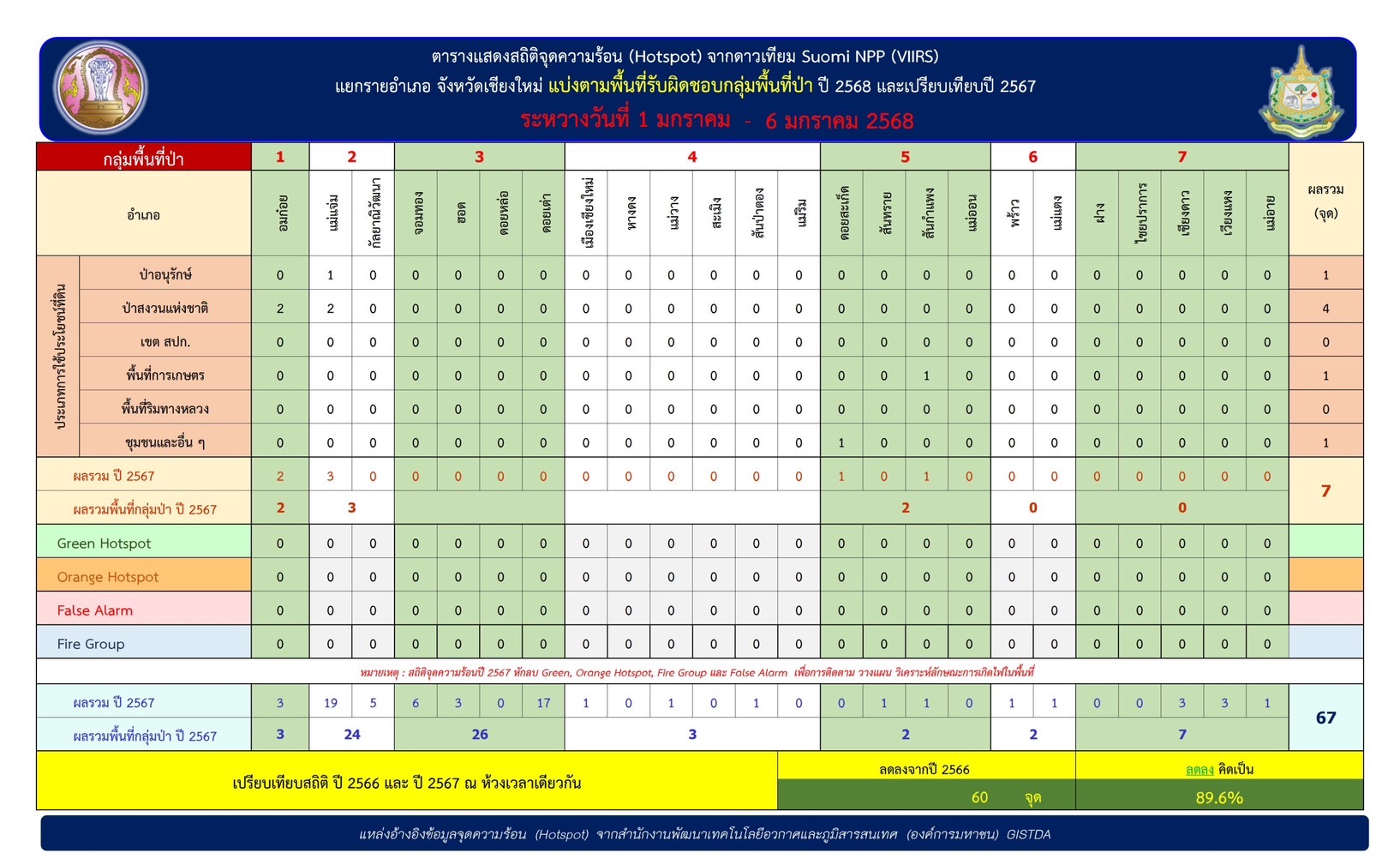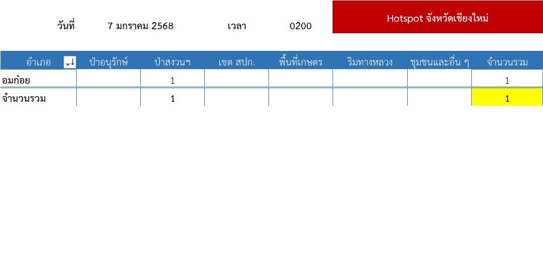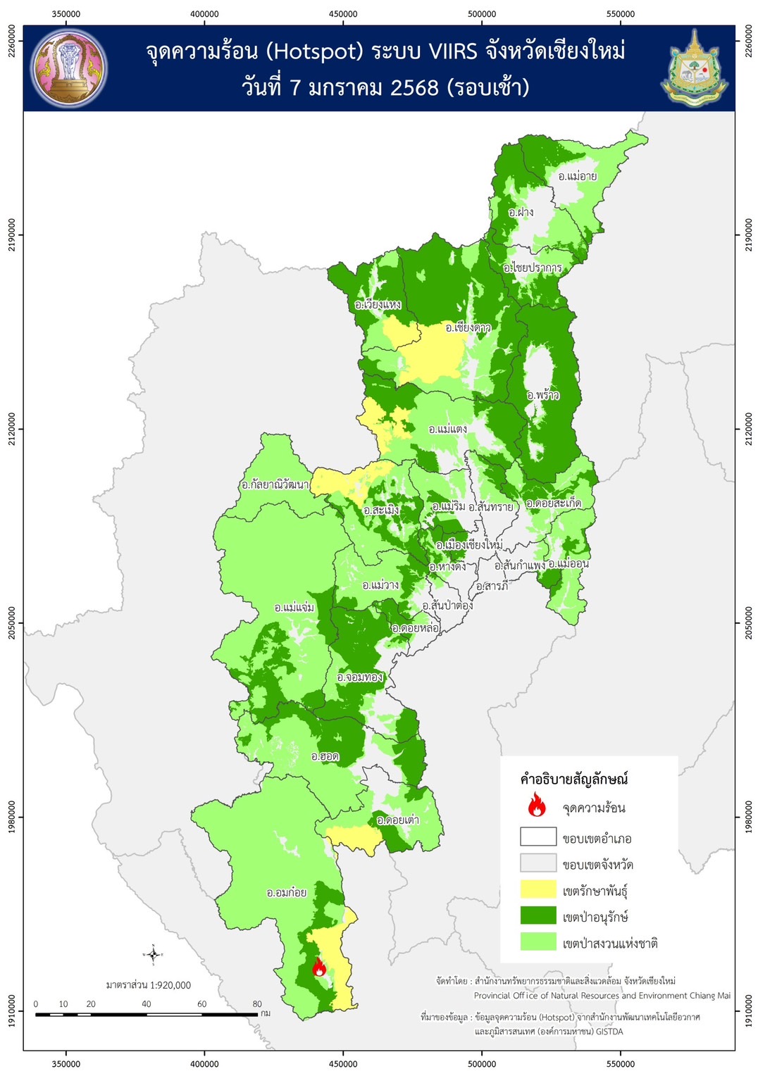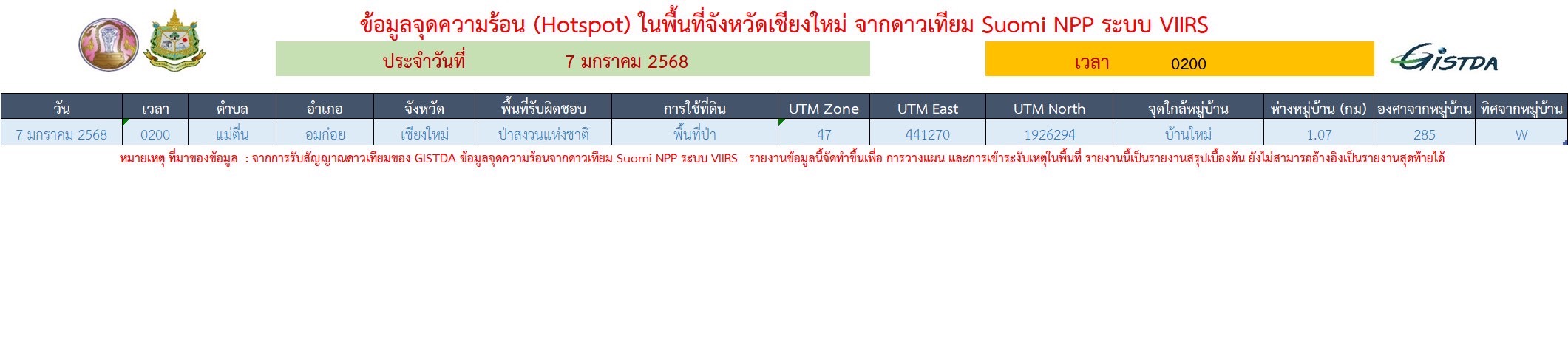 วันที่ 7 ม.ค. 68 ผู้สื่อข่าวรายงานมาว่า ข้อมูลจากการรายงานของศูนย์อำนวยการป้องกันและแก้ไขปัญหาไฟป่า หมอกควัน และฝุ่นละอองขนาดเล็ก (PM 2.5) จังหวัดเชียงใหม่ ได้รายงานจุดความร้อน (Hotspot)ประจำวันที่ 7 มกราคม 2568 รอบเช้าจังหวัดเชียงใหม่พบจุดความร้อนจำนวน 1 จุด พบที่อำเภออมก๋อย 1 จุด จุดความร้อนสะสมตั้งแต่วันที่ 1 ม.ค. 68 ถึงปัจจุบัน ทั้งหมดจำนวน 8 จุด
