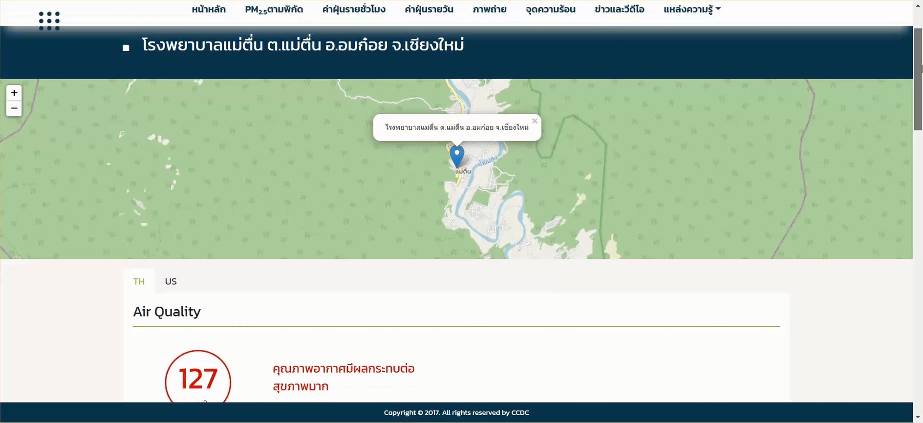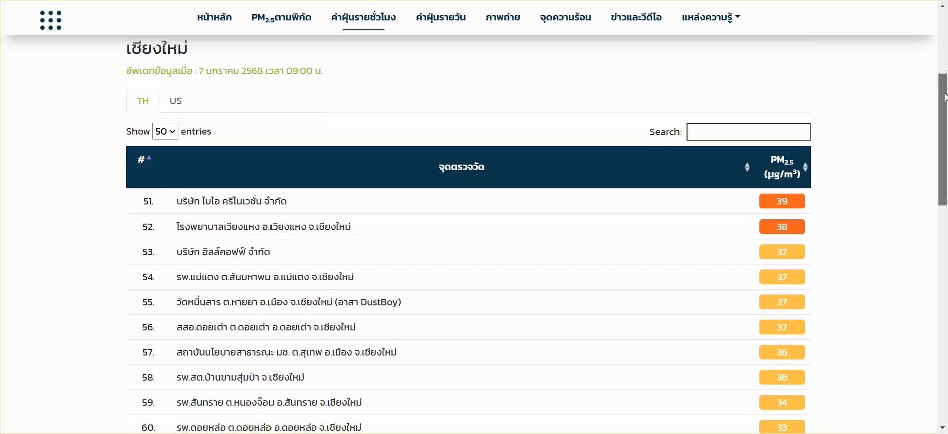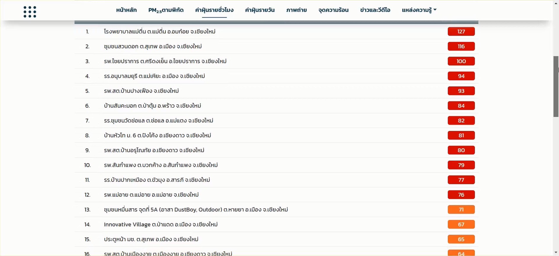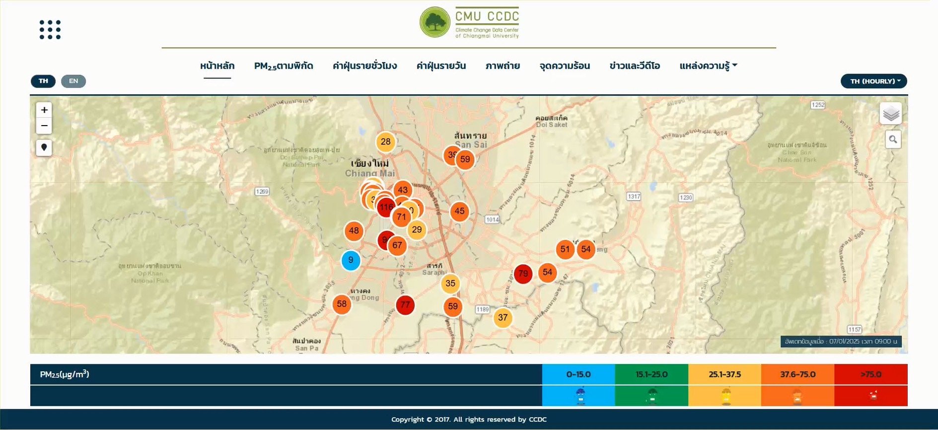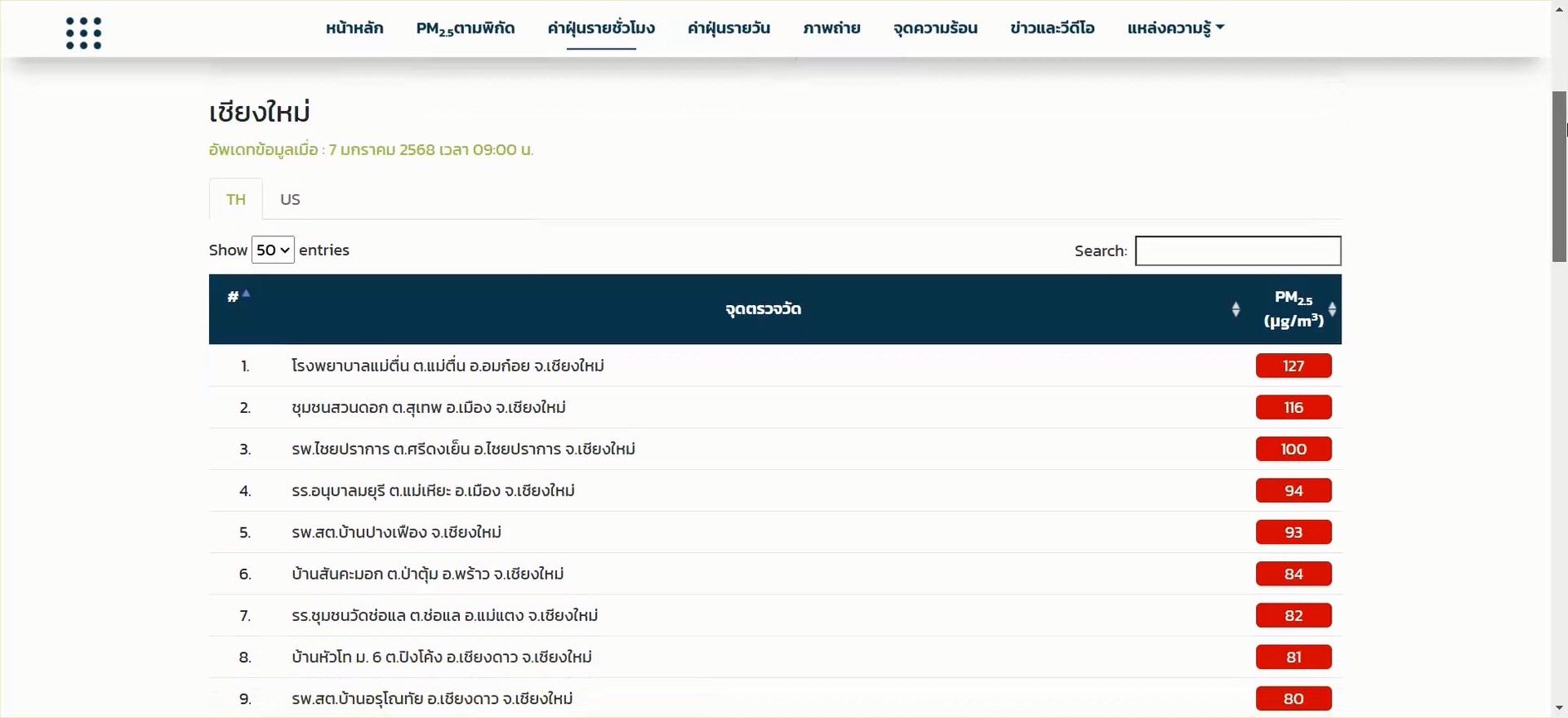 จากการตรวจข้อมูล ช่วงเวลา 09.00 น.จากเว็บไซด์ https://www.cmuccdc.org/ ของมหาวิทยาลัยเชียงใหม่ วันที่ 7 มกราคม 2568 ดัชนีคุณภาพอากาศของประเทศไทย จากสถานีเครื่องวัด ตรวจวัดค่าฝุ่น ฝุ่นละอองขนาดเล็ก PM2.5 เป็นรายชั่วโมงพื้นที่จังหวัดเชียงใหม่ จากการตรวจวัดจำนวน 85 จุด ส่วนการตรวจวัดค่าฝุ่นละอองขนาดเล็ก PM 2.5 จะต้องไม่เกิน 37.5 พบจำนวน 52 จุดตรวจวัด ตั้งแต่ 38 – 127 ไมโครกรัมต่อลูกบาศก์เมตร พบสูงสุดเป็นสีแดง 12 จุดตรวจวัด มีค่าฝุ่นละอองขนาดเล็ก PM2.5 เกินจาก 100 ไมโครกรัมต่อลูกบาศก์เมตร จำนวน 3 จุด โดยจุดที่ 1.โรงพยาบาลแม่ตื่น ต.แม่ตื่น อ.อมก๋อย จ.เชียงใหม่ วัดได้ 127 ไมโครกรัมต่อลูกบาศก์เมตร