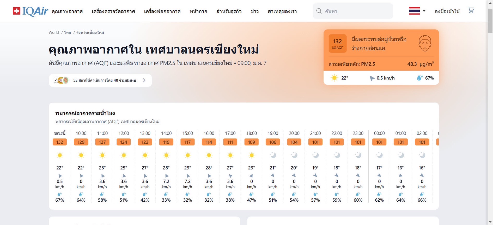 ห่วงเวลาเดียวข้อมูลการตรวจวัดคุณภาพอากาศของประเทศไทย ผ่านเว็บไซด์ iqair.com ของการจัดอันดับเมืองที่มีคุณภาพอากาศแย่ที่สุดของโลก US.AQI วัดได้ 132 ไมโครกรัมต่อลูกบาศก์เมตร อยู่อันดับที่ 25 ของโลก