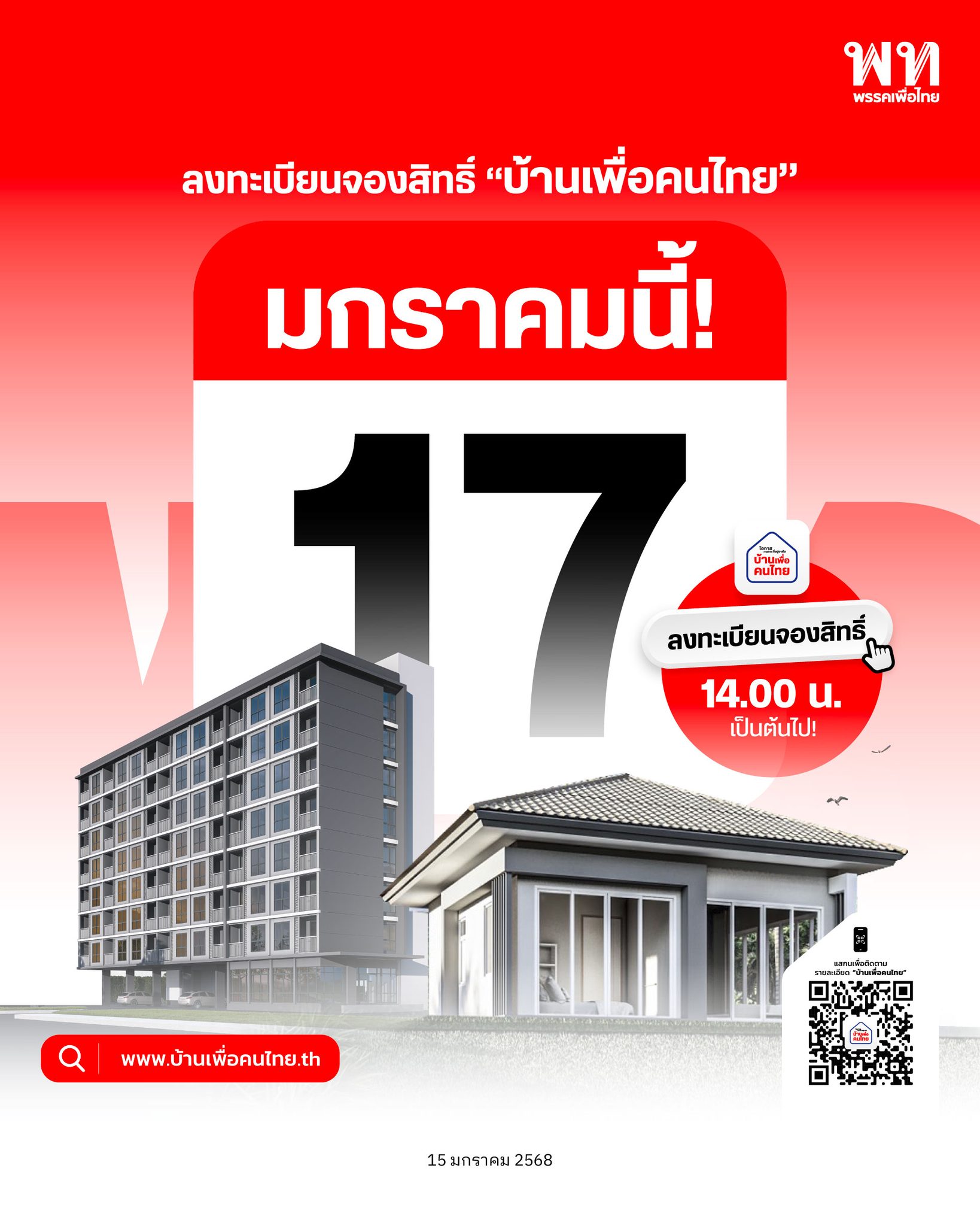 16 ม.ค. 68 เฟซบุ๊กแฟนเพจ พรรคเพื่อไทย เผยการลงทะเบียนจองสิทธิ์ “บ้านเพื่อคนไทย” 17 ม.ค. นี้ หนึ่งในนโยบายจากรัฐบาลเพื่อพัฒนาที่อยู่อาศัยราคาประหยัด โดยมีเป้าหมายให้คนไทยได้เข้าถึงที่พักอาศัยคุณภาพดี ทำเลสวย เดินทางสะดวก เข้าถึงง่าย โดยประชาชนสามารถเลือกได้ 2 ประเภท