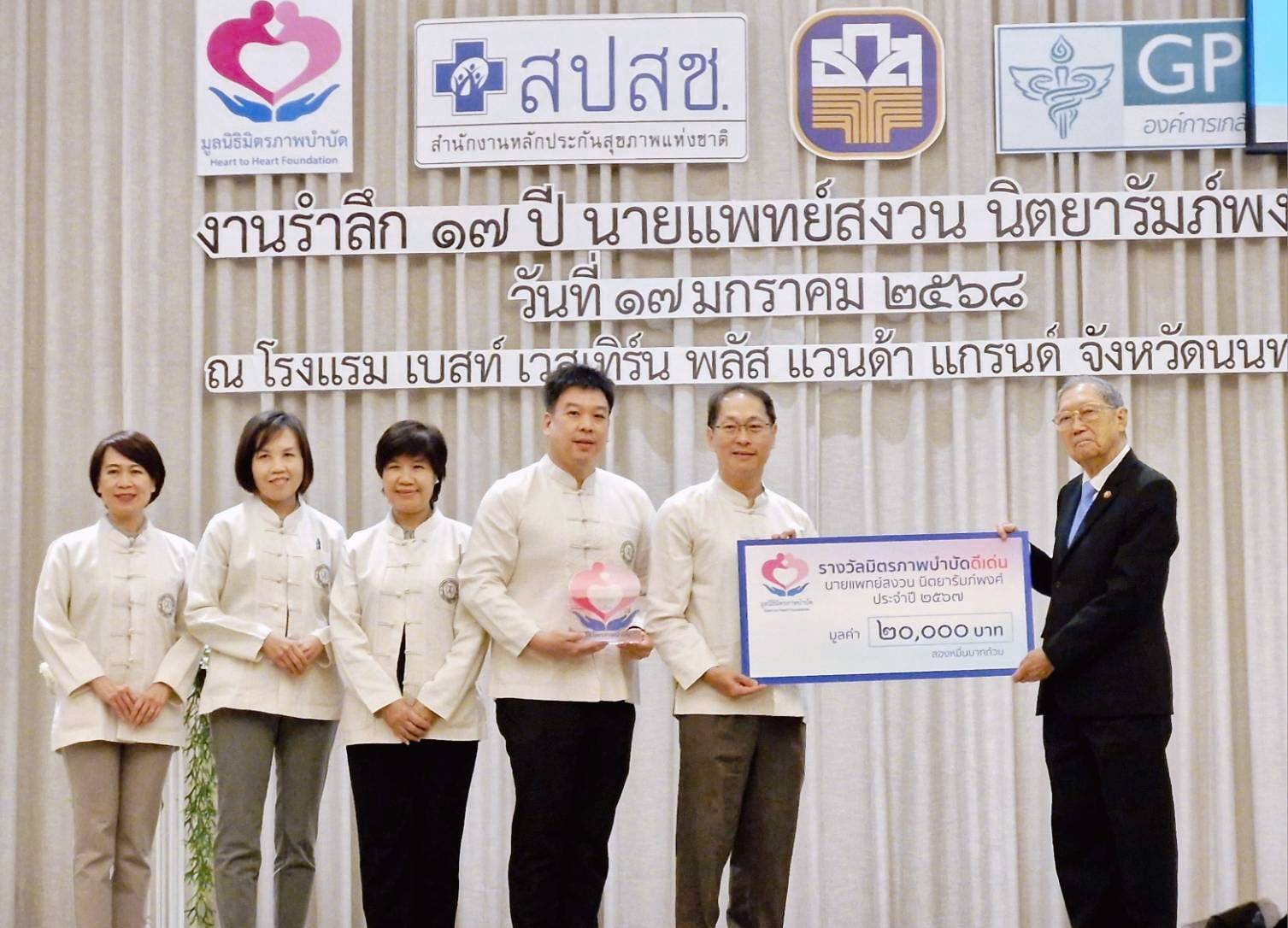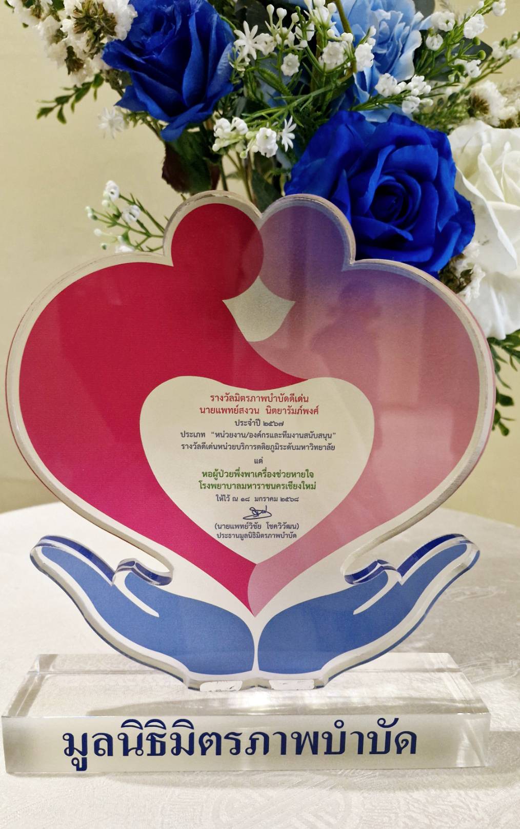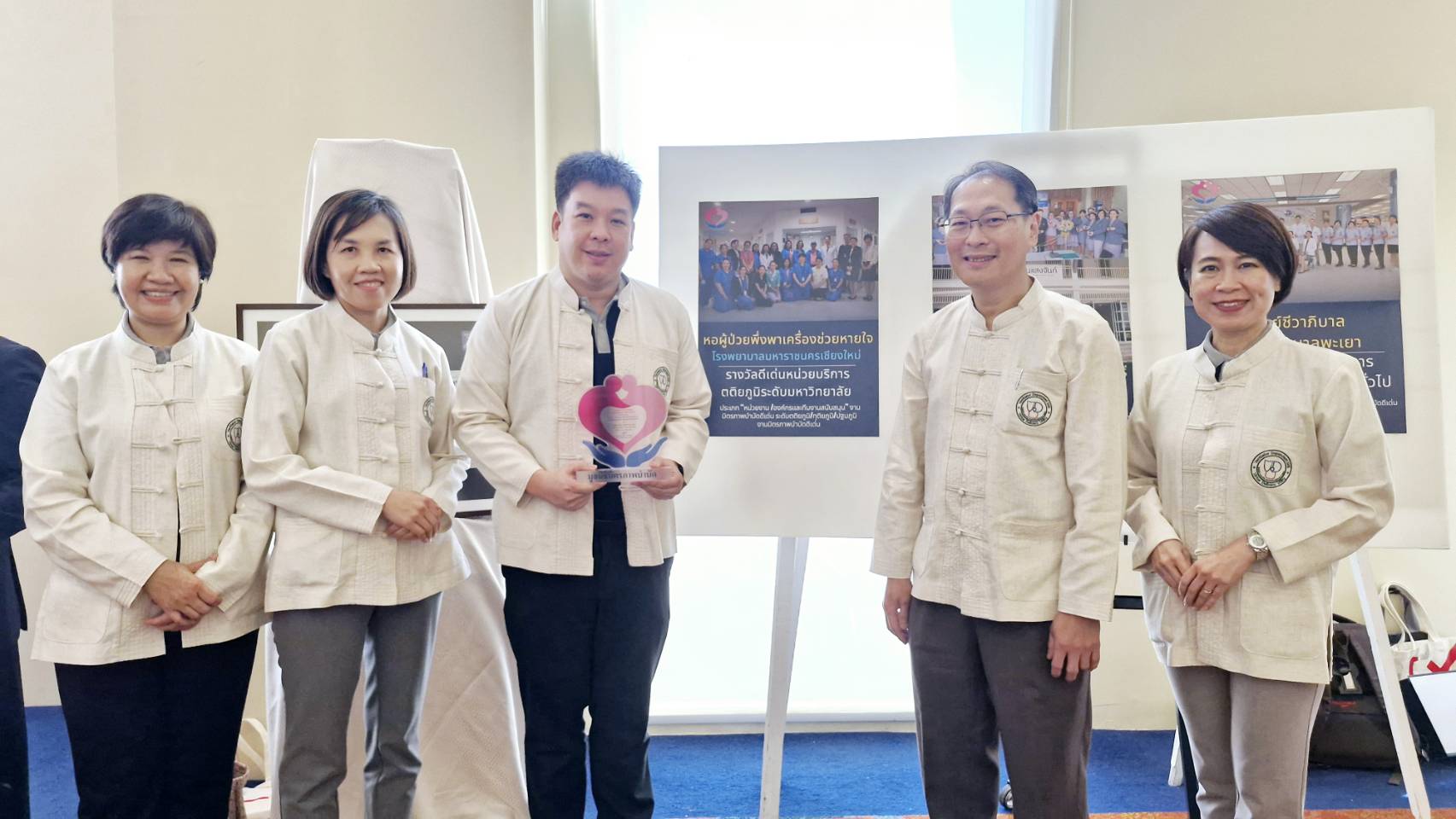 รศ.นพ.เฉลิม ลิ่วศรีสกุล หัวหน้าภาควิชาอายุรศาสตร์ คณะแพทยศาสตร์ มช. พร้อมด้วย ผศ.ดร.นพ.ภาสกร สวัสดิรักษ์ รองผู้อำนวยการโรงพยาบาลมหาราชนครเชียงใหม่ และคณะฯ ร่วมรับรางวัลมิตรภาพบำบัด ระดับดีเด่น ประเภท หน่วยบริการตติยภูมิระดับมหาวิทยาลัย แก่ หอผู้ป่วยพึ่งพาผู้ช่วยหายใจระยะยาว (Ventilator Dependent Unit: VDU) โรงพยาบาลมหาราชนครเชียงใหม่ ในงานรำลึก 17 ปี นายแพทย์สงวน นิตยารัมภ์พงศ์ ในวันที่ 17 มกราคม 2568 ณ ห้องประชุมแวนด้า แกรนด์ บอลรูม เอ ชั้น 5 โรงแรมเบสต์ เวสเทิน แจ้งวัฒนะ กรุงเทพมหานคร