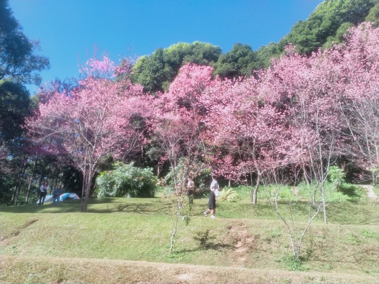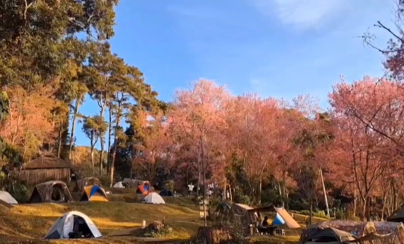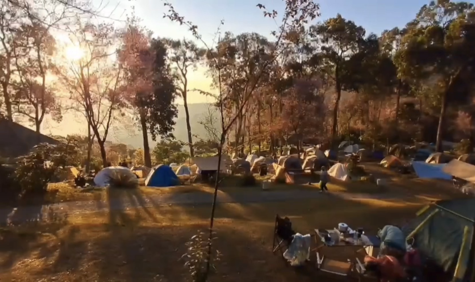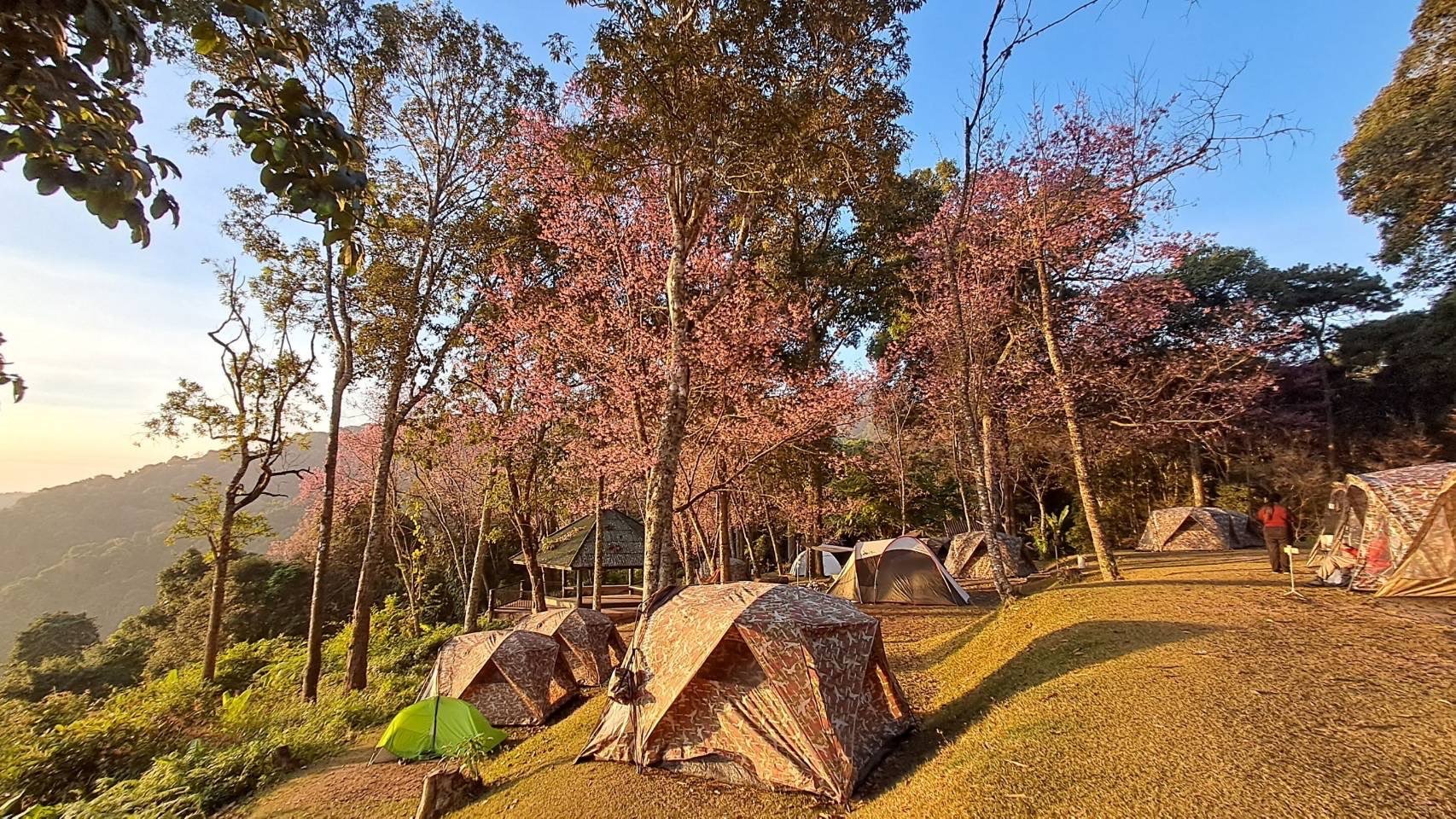 นักท่องเที่ยวสุดฟิน กางเต็นท์นอนชมดอกนางพญาเสือโคร่ง เบ่งบานอวดสีชมพูสวยงามเต็มต้น ที่ลานกางเต็นท์ดอยปุย