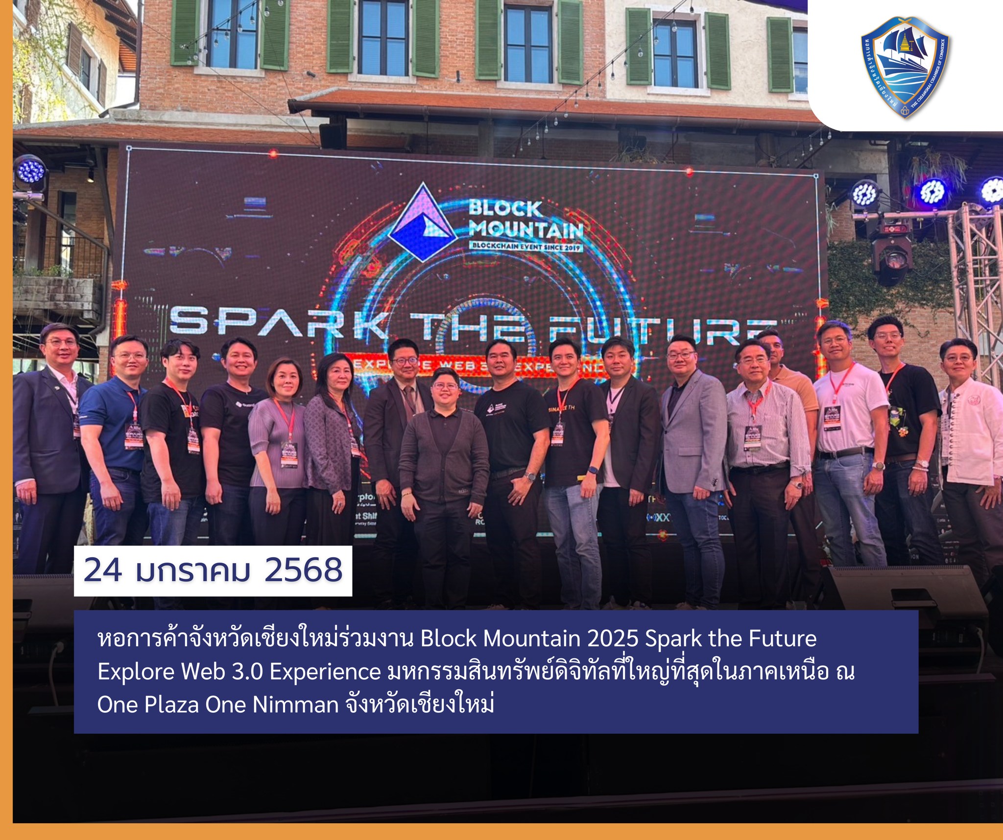 วันที่ 24 มกราคม 2568 ผู้แทนหอการค้าจังหวัดเชียงใหม่ นำโดย ดร.กอบกิจ อิสรชีววัฒน์ รองประธานกรรมการ พร้อมด้วย นายปรกฤษฎิ์ สายหัสดี กรรมการเลขาธิการ และนายสันติ เหล่าพาณิชย์กุล กรรมการนายทะเบียน ร่วมเป็นเกียรติในงาน Block Mountain 2025 Spark the Future Explore Web 3.0 Experience มหกรรมสินทรัพย์ดิจิทัลที่ใหญ่ที่สุดในภาคเหนือ ณ One Plaza One Nimman จังหวัดเชียงใหม่