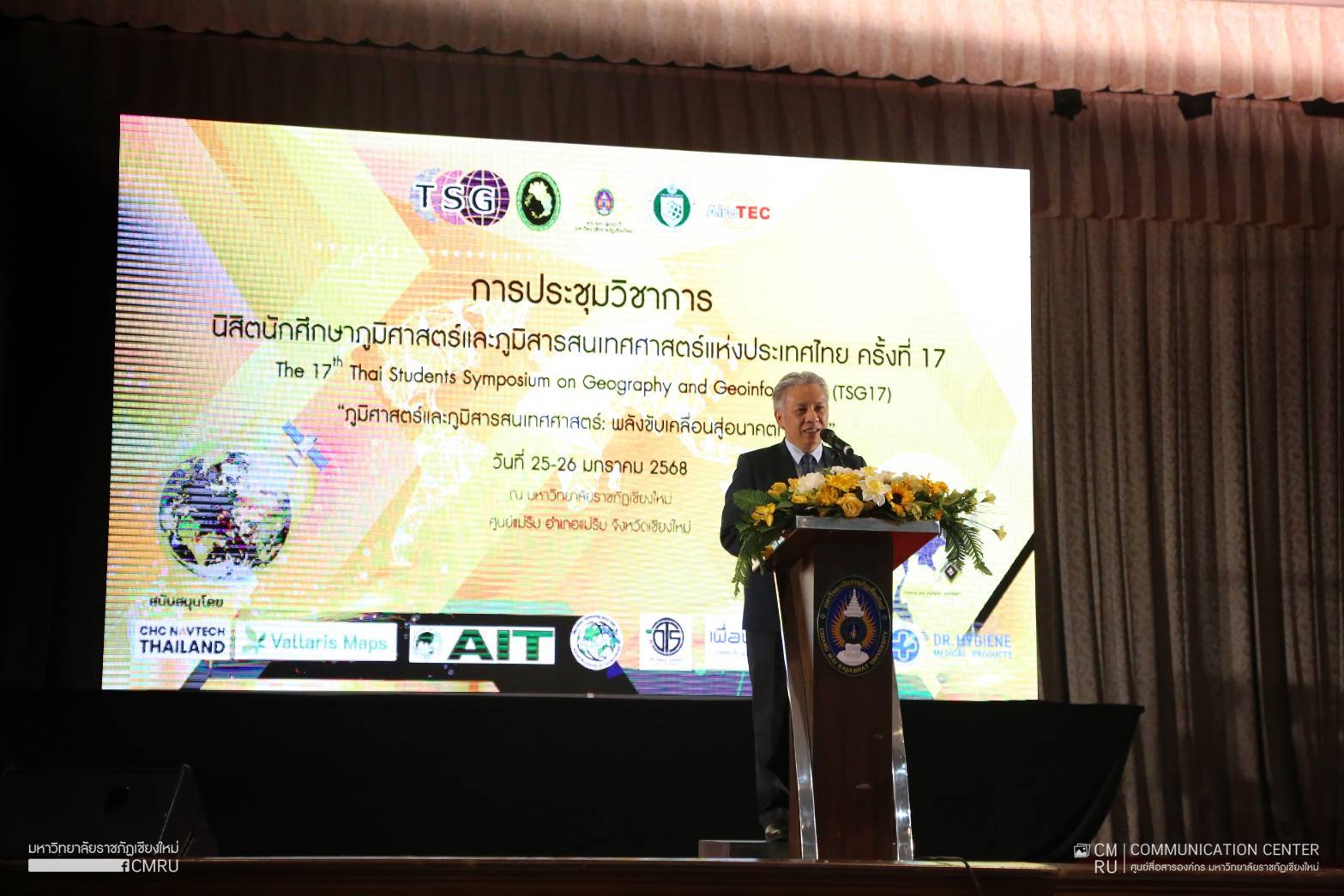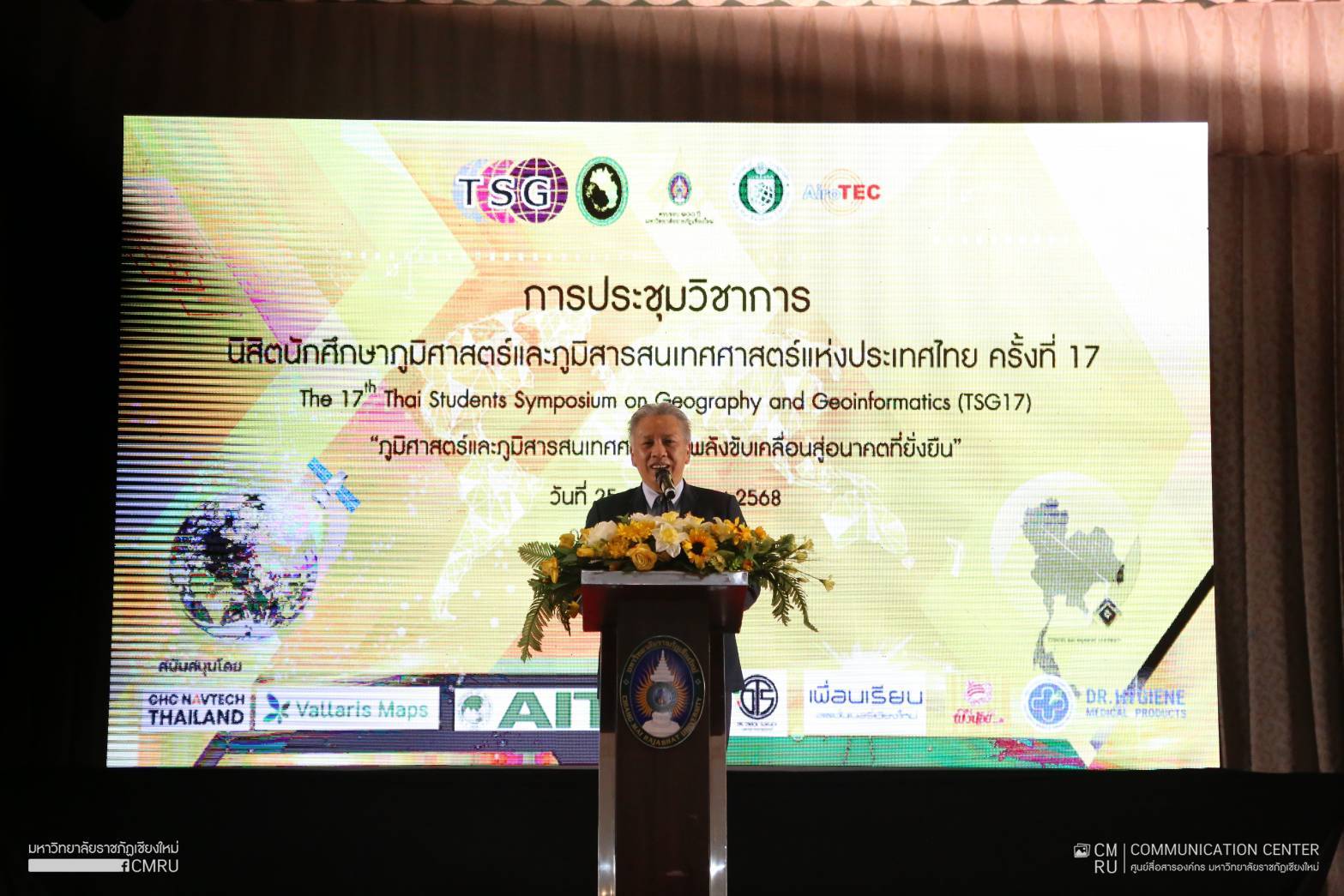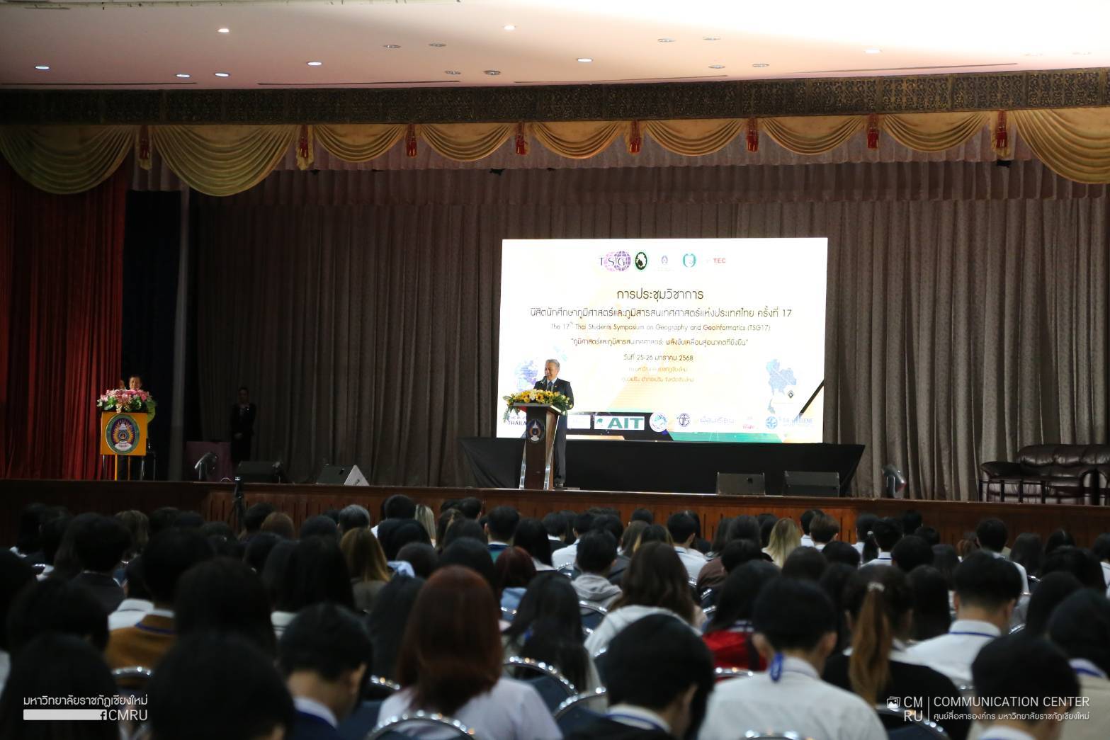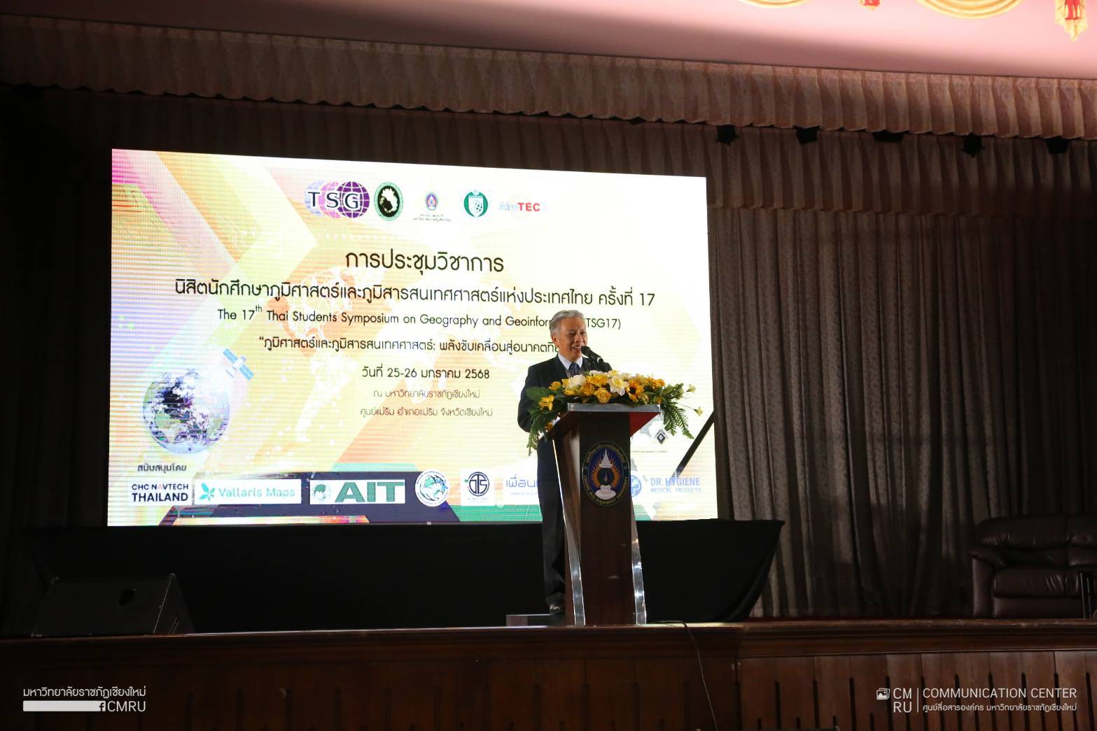 วันที่ 25 มกราคม 2568 รองศาสตราจารย์ ดร.ชาตรี มณีโกศล รักษาราชการแทนอธิการบดีมหาวิทยาลัยราชภัฏเชียงใหม่ เป็นประธานเปิดการประชุมวิชาการนิสิต นักศึกษาภูมิศาสตร์และภูมิสารสนเทศศาสตร์แห่งประเทศไทย ครั้งที่ 17 The 17th Thai Students Symposium on Geography and Geoinformatics (TSG17) “ภูมิศาสตร์และภูมิสารสนเทศศาสตร์ : พลังขับเคลื่อนสู่อนาคตที่ยั่งยืน” ซึ่งจัดขึ้นระหว่างวันที่ 25 – 26 มกราคม 2568 โดยมีสาขาวิชาภูมิศาสตร์และภูมิสารสนเทศ คณะมนุษยศาสตร์และสังคมศาสตร์ มหาวิทยาลัยราชภัฏเชียงใหม่ เป็นเจ้าภาพจัดการประชุม เพื่อเป็นเวทีแลกเปลี่ยนองค์ความรู้และประสบการณ์ ตลอดจนเสริมสร้างศักยภาพในการวิจัย การประยุกต์ใช้เทคโนโลยี การแก้ปัญหาเชิงพื้นที่ รวมถึงการพัฒนาคุณภาพการศึกษาการวิจัยด้านภูมิศาสตร์และภูมิสารสนเทศ สร้างเครือข่ายความร่วมมือที่เข้มแข็ง ซึ่งเป็นรากฐานสำคัญที่จะนำไปสู่การพัฒนาประเทศอย่างยั่งยืนในอนาคต