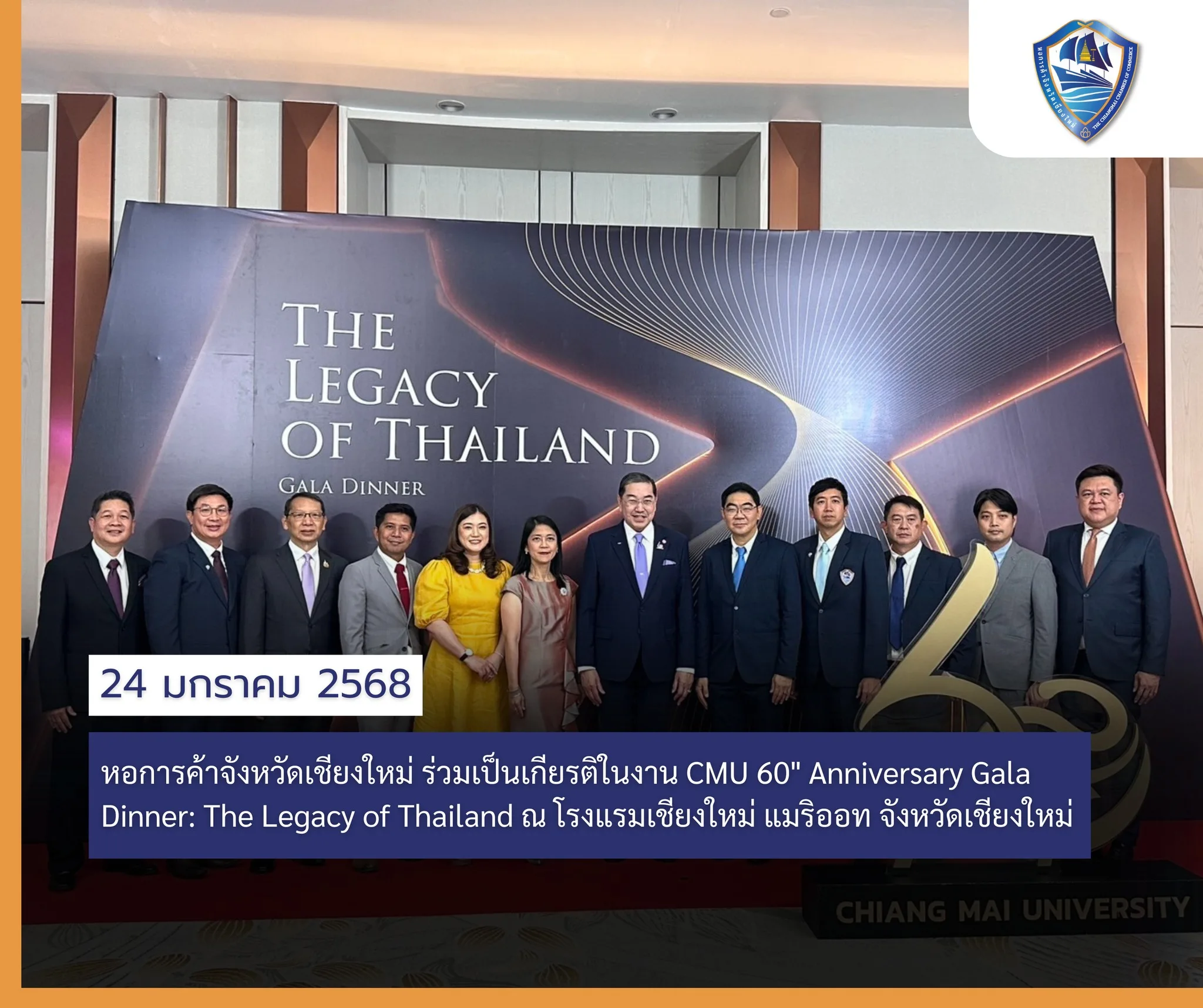 วันที่ 24 มกราคม 2568 หอการค้าจังหวัดเชียงใหม่ ร่วมเป็นเกียรติในงาน CMU 60″ Anniversary Gala Dinner: The Legacy of Thailand เนื่องในโอกาสครบรอบ 60 ปี แห่งการสถาปนามหาวิทยาลัยเชียงใหม่ ประจำปี พ.ศ. 2568 ณ โรงแรมเชียงใหม่ แมริออท จังหวัดเชียงใหม่