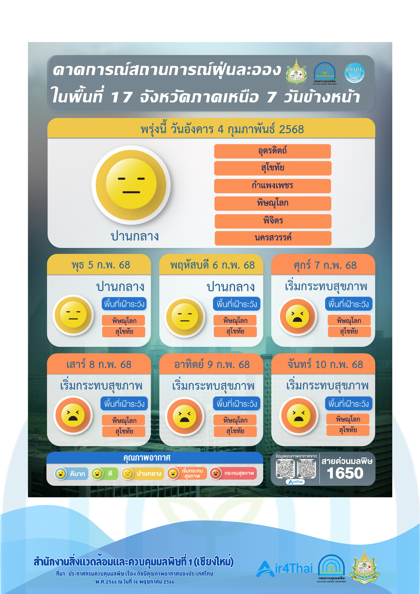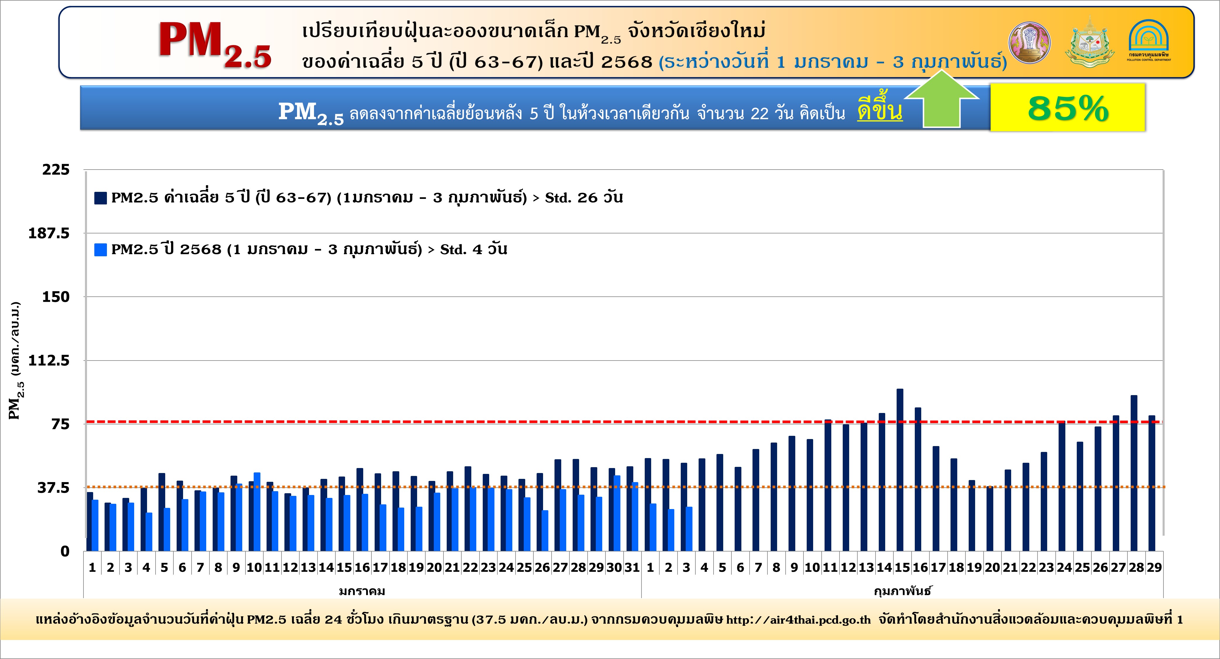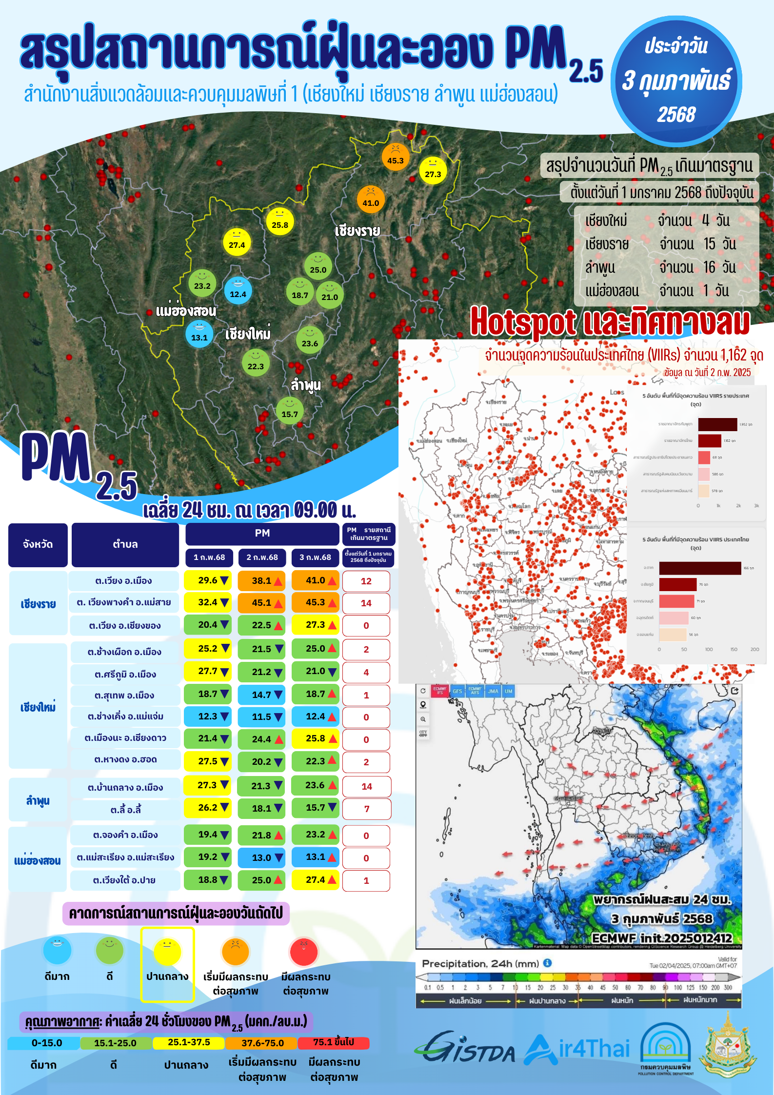 📢 สรุปสถานการณ์ฝุ่น PM2.5 ประจำวันที่ 3 กุมภาพันธ์ 2568 ในพื้นที่รับผิดชอบของสำนักงานสิ่งแวดล้อมและควบคุมมลพิษที่ 1 (เชียงใหม่ เชียงราย ลำพูน แม่ฮ่องสอน)