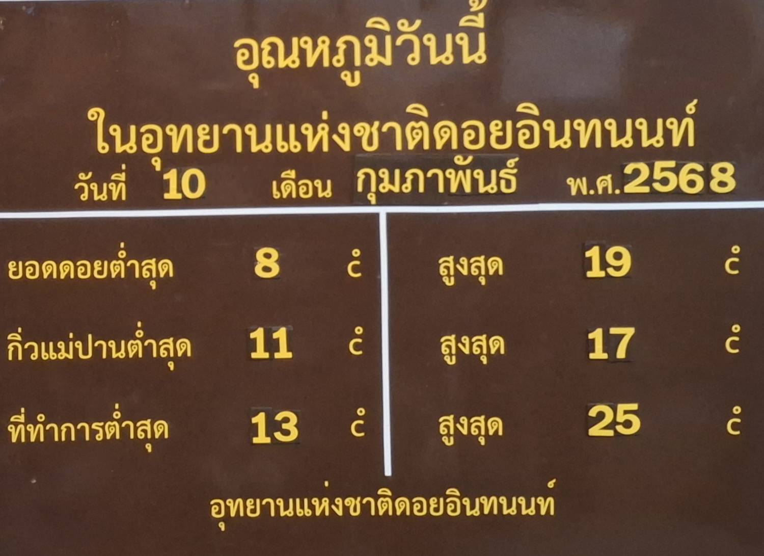 วันที่ 10 ก.พ. 68 ทางอุทยานแห่งชาติดอยอินทนนท์ อ.จอมทอง โดยนายเกรียงไกร ไชยพิเศษ หัวหน้าอุทยานแห่งชาติดอยอินทนนท์ ได้รายงานมาว่า บรรยากาศ เช้าวันที่ 10 ก.พ. 68 เวลา 07.00 น. วันนี้ยอดดอยและกิ่วแม่ปานอากาศปิด คุณภาพอากาศดีมาก อุณหภูมิต่ำสุด ยอดดอย 8 c กิ่วแม่ปาน 11 c ที่ทำการ 13 c ค่าฝุ่น ยอดดอย ค่า pm 2.5= 17 ที่ทำการ ค่า pm 2.5 = 27 อุณหภูมิเพิ่มขึ้น แต่บนดอยอินทนนท์ ยังคงหนาวอยู่ นักท่องเที่ยวยังสามารถสัมผัสความหนาวเย็นแบบสบาย ๆ และชมดอกไม้ฤดูหนาว ช่วงนี้อากาศเปลี่ยนแปลง ทำให้เกิดหมอกหนา นักท่องเที่ยวยังคงได้เดินศึกษาชมธรรมชาติตามขุดต่าง ๆ ได้อยู่