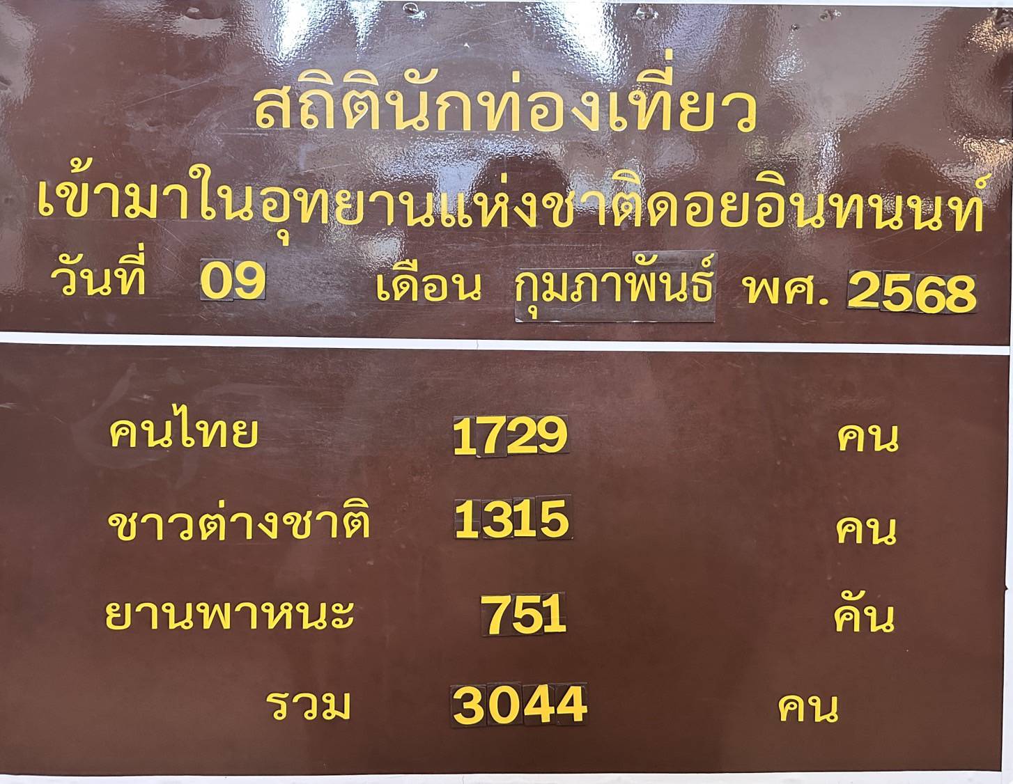 สถิตินักท่องเที่ยวที่เข้ามาในเขตอุทยานแห่งชาติดอยอินทนนท์ เมื่อวันที่ 9 ก.พ. 68 คนไทย 1,729 คน ชาวต่างชาติ 1,315 คน ยานพาหนะ 751 คัน รวม 3,044 คน ฝากเตือน การขับขี่รถบนดอยยังคงต้องระมัดระวังในการขับรถขึ้นดอย และใช้เกียร์ต่ำ