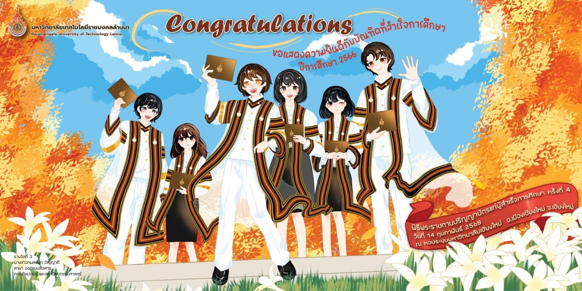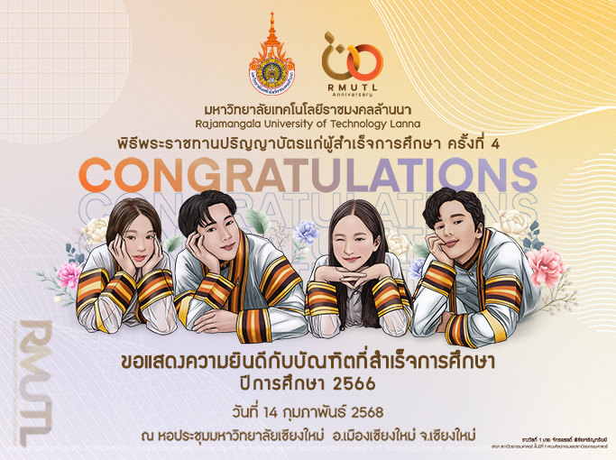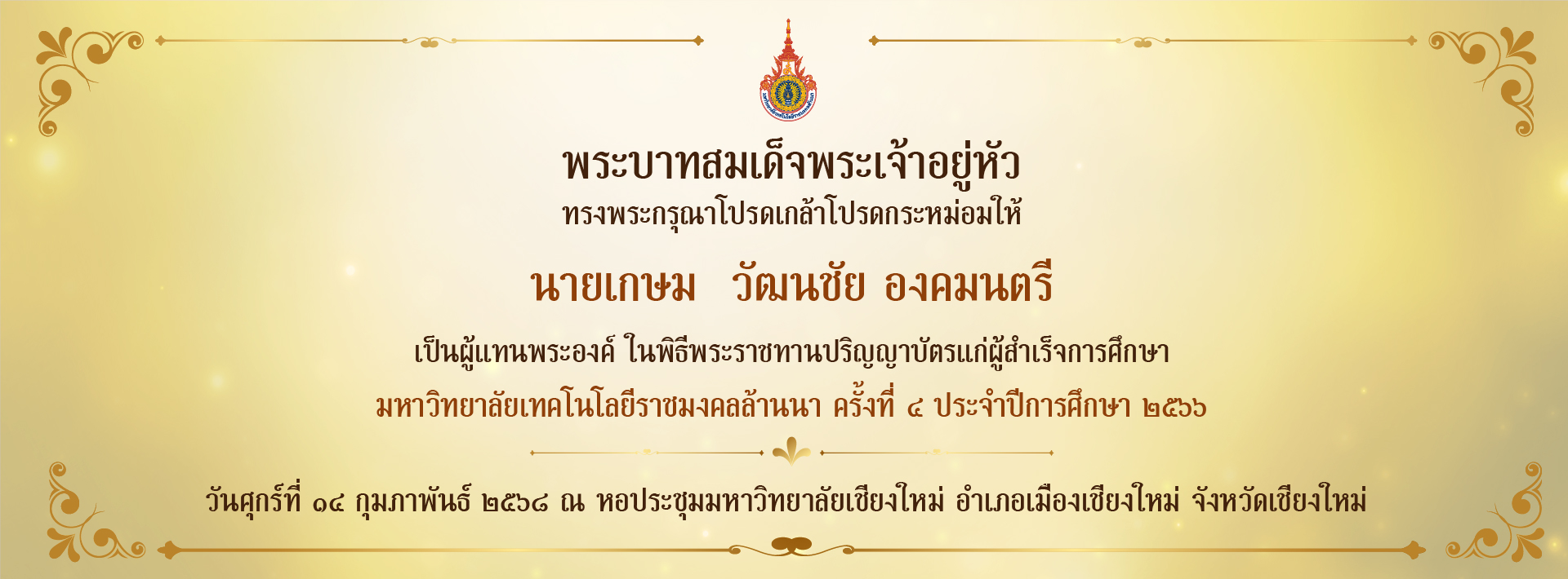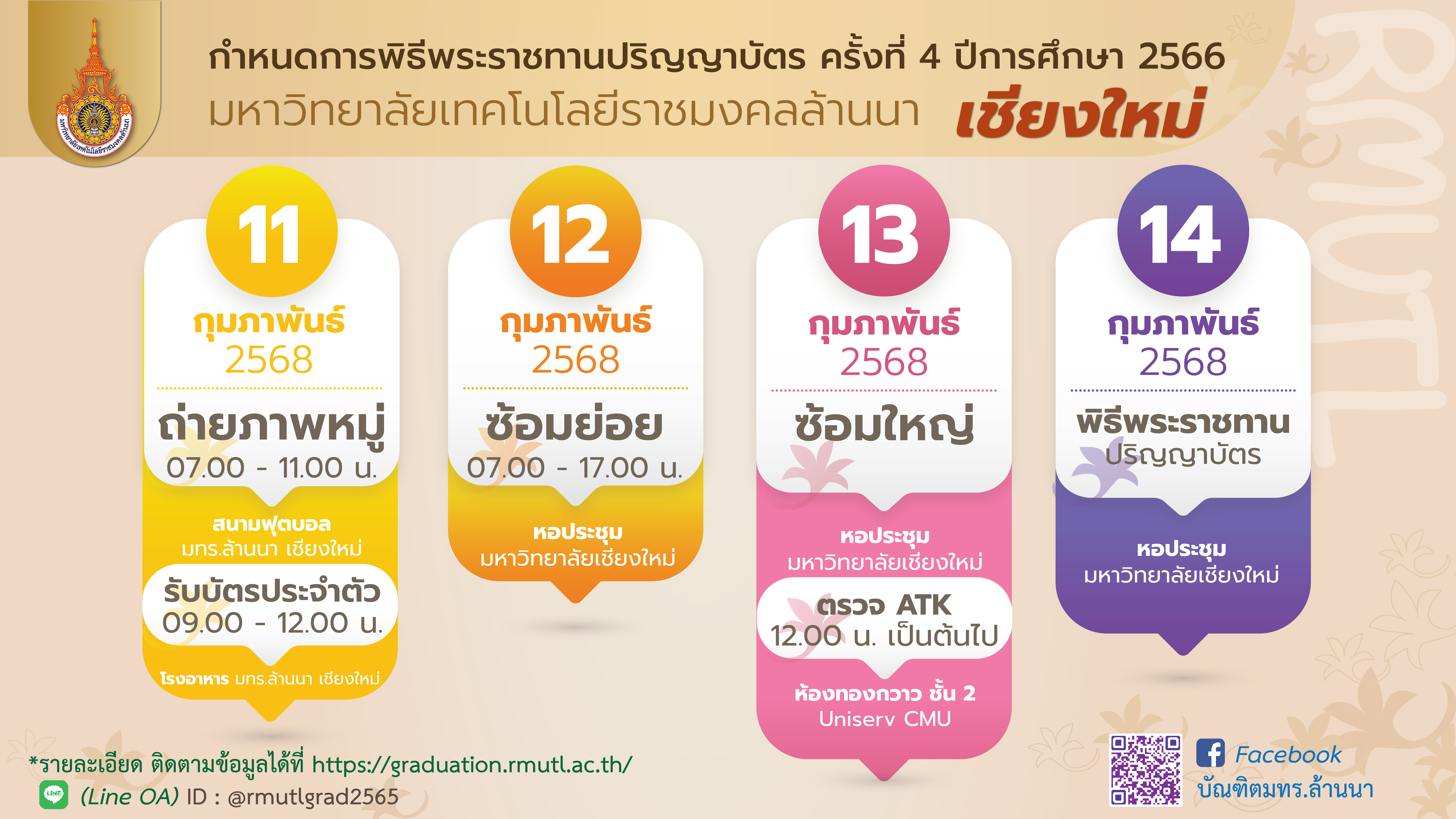 มหาวิทยาลัยเทคโนโลยีราชมงคลล้านนา จัดพิธีพระราชทานปริญญาบัตรแก่ผู้สำเร็จการศึกษา ครั้งที่ 4 ประจำปีการศึกษา 2566 ในวันศุกร์ที่ 14 กุมภาพันธ์ 2568 ณ หอประชุมมหาวิทยาลัยเชียงใหม่ อำเภอเมืองเชียงใหม่ จังหวัดเชียงใหม่ โดยมีกำหนด ดังนี้