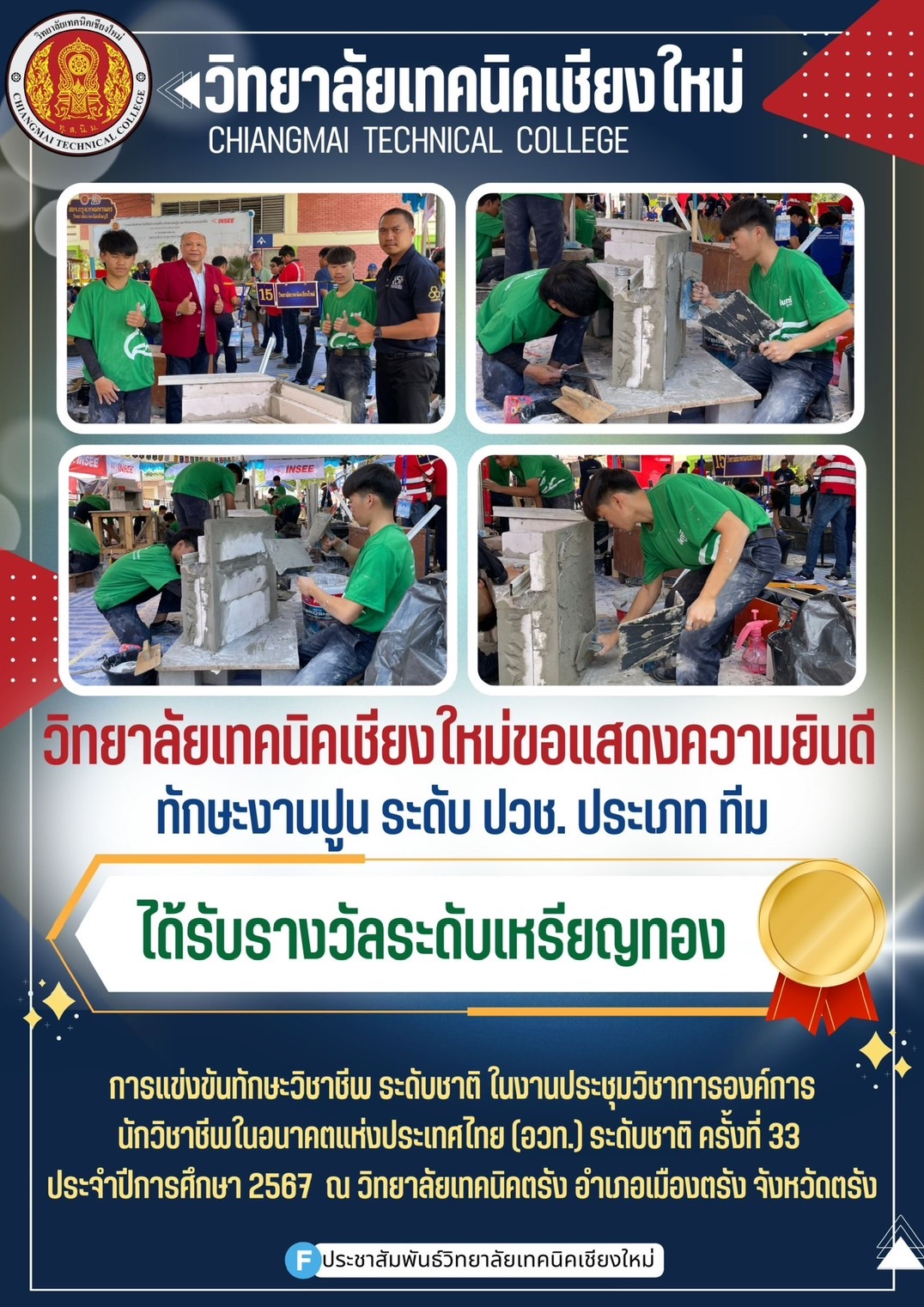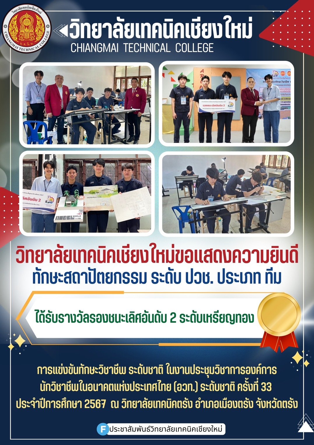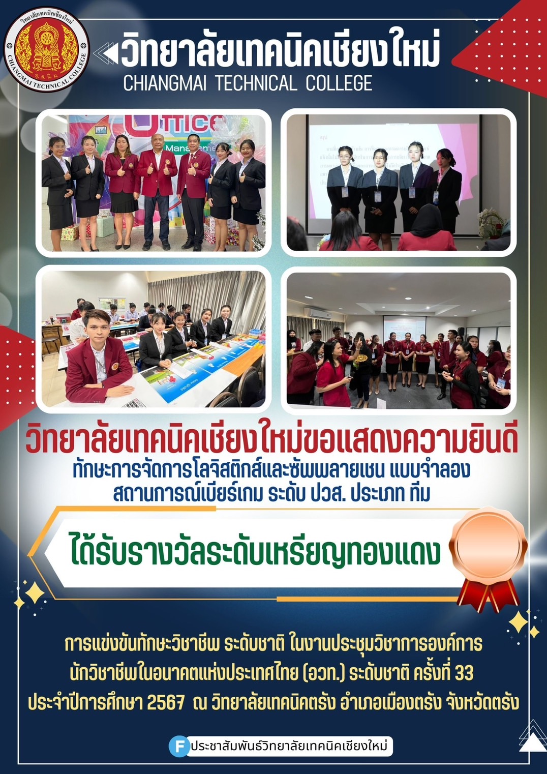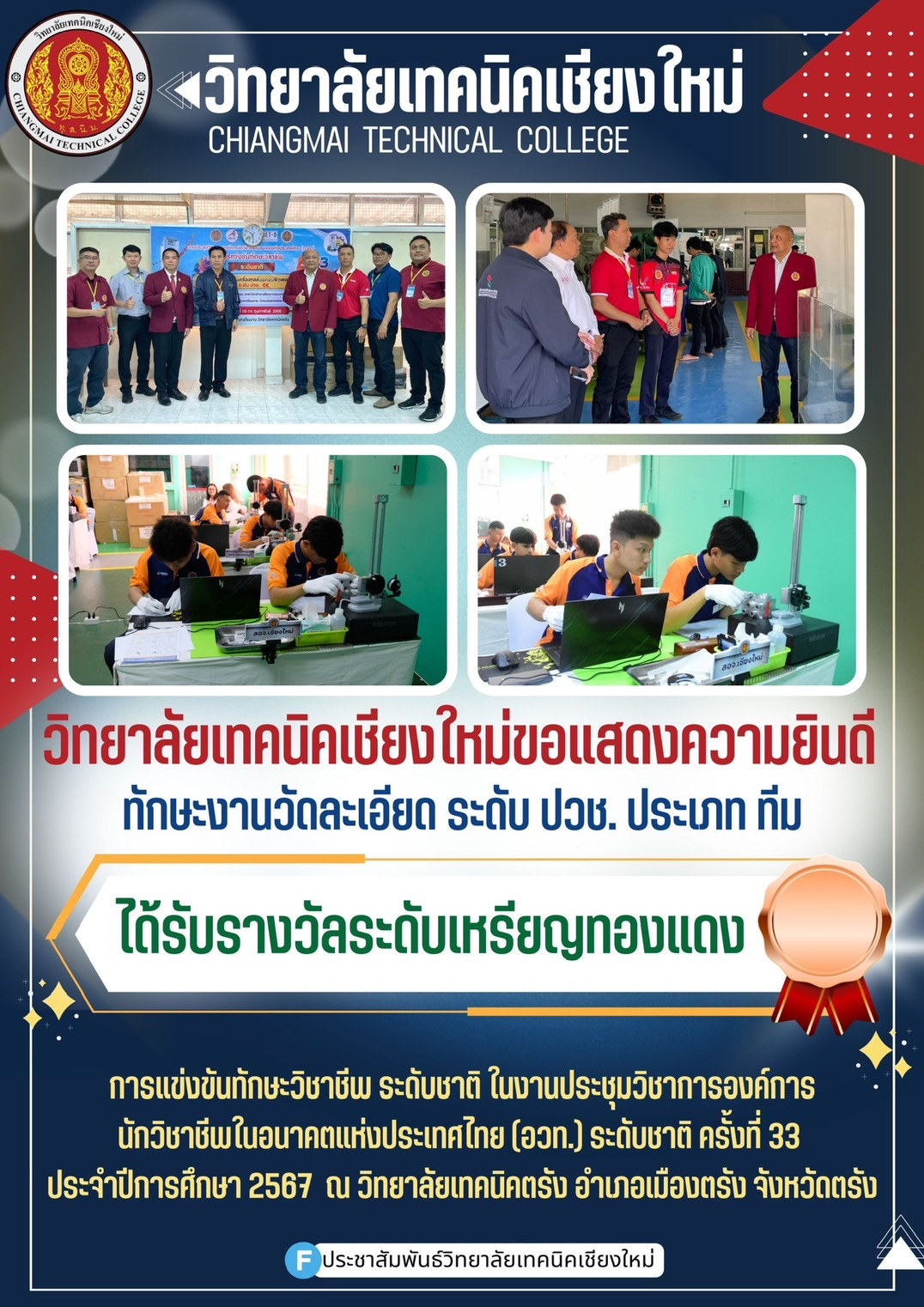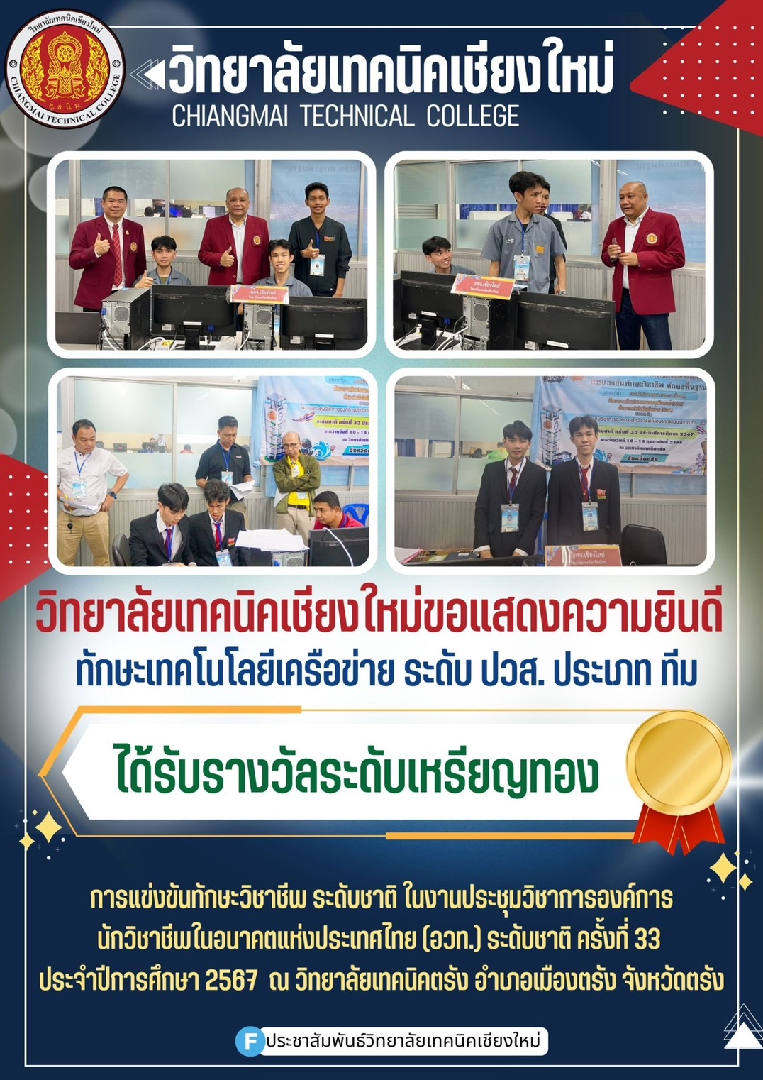 ในหว่างวันที่ 10-14 กุมภาพันธ์ 2568 ดร.วัชรพงศ์ ฝั้นติ๊บ ผู้อำนวยการวิทยาลัยเทคนิคเชียงใหม่ ปฏิบัติหน้าที่ ผู้อำนวยการสำนักงานอาชีวศึกษาจังหวัดเชียงใหม่ มอบหมายให้แผนกวิชา เข้าร่วมการแข่งขันทักษะวิชาชีพ ระดับชาติ ในงานประชุมวิชาการองค์การนักวิชาชีพในอนาคตแห่งประเทศไทย (อวท.) ระดับชาติ ครั้งที่ 33 ประจำปีการศึกษา 2567 ณ วิทยาลัยเทคนิคตรัง อำเภอเมืองตรัง จังหวัดตรัง มีรายการที่ได้รับรางวัล ดังนี้
