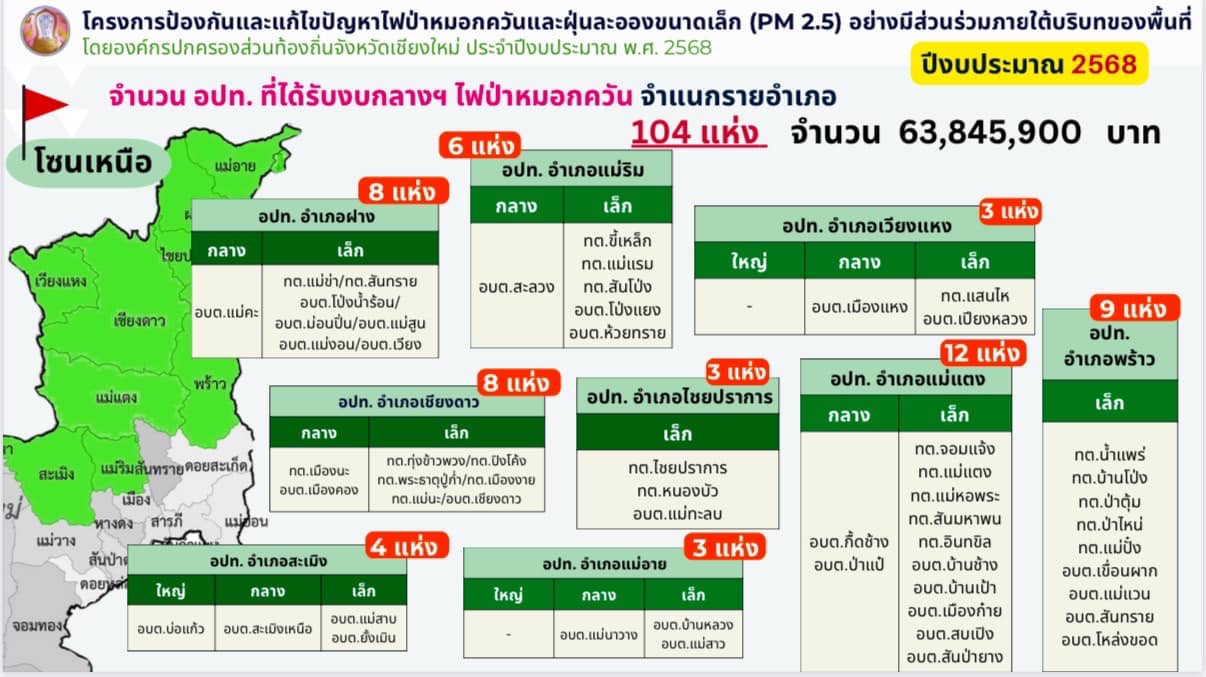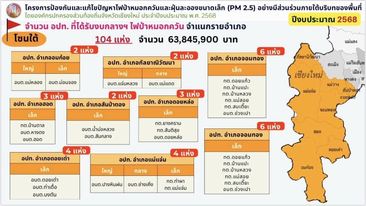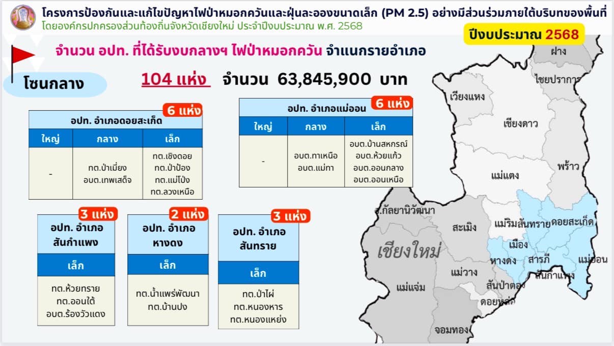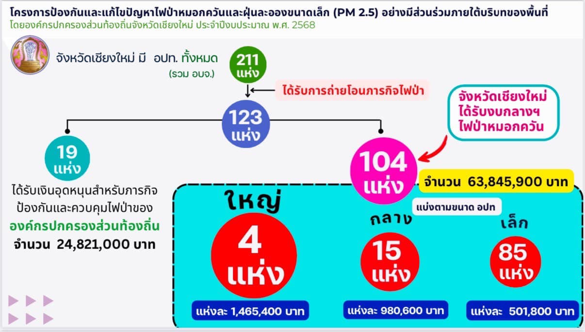 โดยจังหวัดเชียงใหม่ มีองค์กรปกครองส่วนท้องถิ่นที่ได้รับการถ่ายโอนภารกิจไฟป่า รวมจำนวนทั้งสิ้น 123 แห่ง โดยก่อนหน้านี้มี อปท. ที่ได้รับเงินอุดหนุนสำหรับภารกิจป้องกันและควบคุมไฟป่าขององค์กรปกครองส่วนท้องถิ่นไปแล้ว 19 แห่ง เป็นเงินกว่า 24.82 ล้านบาท และในวันนี้จังหวัดเชียงใหม่ได้รับการจัดสรรงบประมาณงบกลางฯ เพื่อที่จะสนับสนุนในภารกิจการป้องกันและแก้ไขปัญหาไฟป่าหมอกควัน และฝุ่นละอองขนาดเล็ก PM 2.5 ให้กับองค์กรปกครองส่วนท้องถิ่นในจังหวัดเชียงใหม่ในส่วนที่เหลืออีก จำนวน 104 แห่ง ครอบคลุม 23 อำเภอ รวมเป็นเงินทั้งสิ้นกว่า 63.84 ล้านบาท ซึ่งได้มีการจัดสรรลงไปให้กับ อปท. ทั้ง 104 แห่งแล้วในวันนี้ (19 ก.พ. 68)