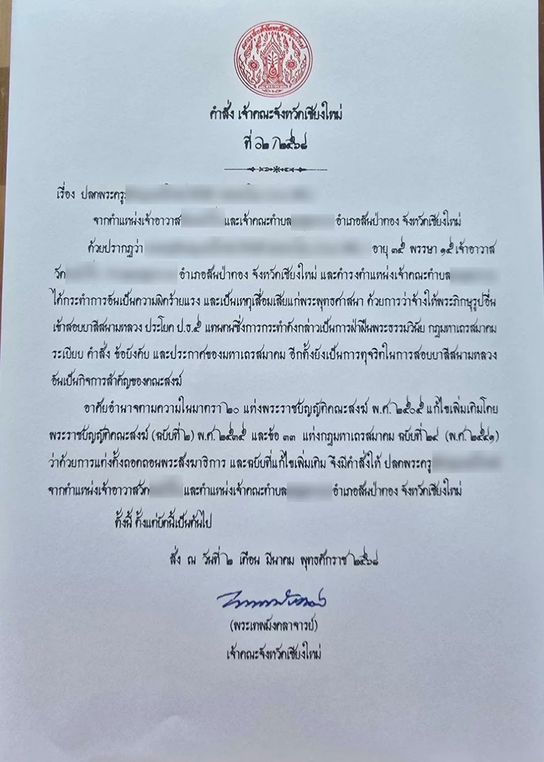 ข่าวคืบหน้า วันที่ 2 มี.ค. 68 ทางพระเทพมังคลาจารย์ เจ้าคณะจังหวัดเชียงใหม่ ซึ่งได้รับรายงานเรื่องดังกล่าวแล้ว และได้มีหนังสือคำสั่ง ปลดพระสงฆ์ดังกล่าว ออกจากตำแหน่งเจ้าอาวาสวัด และตำแหน่งเจ้าคณะตำบลแล้ว เป็นความผิดร้ายแรง