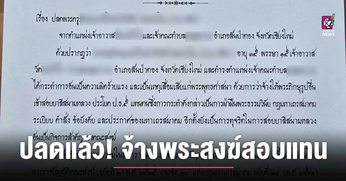เจ้าคณะจังหวัดเชียงใหม่ มีคำสั่งปลด เจ้าอาวาสวัดดังเชียงใหม่และตำแหน่งเจ้าคณะตำบลพ้นจากตำแหน่ง มีความผิดร้ายแรง จ้างพระสงฆ์ไปสอบแทน เปรียญ 5 ประโยค