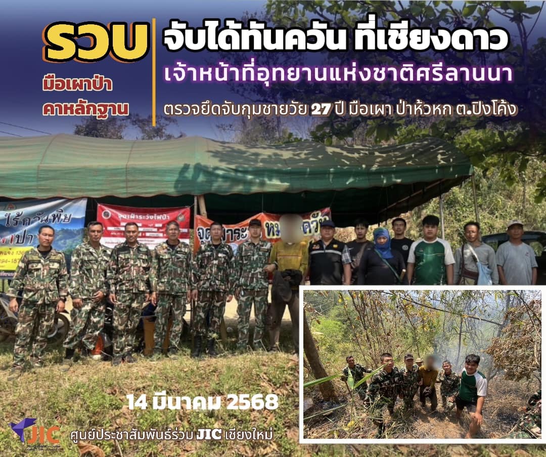วันนี้ (วันที่ 14 มีนาคม 2568) เวลาโดยประมาณ 10:30 น. นายอานนท์ กุลนิล นักวิชาการป่าไม้ชำนาญการ หัวหน้าอุทยานแห่งชาติศรีลานนา พร้อมหน่วยพิทักษ์อุทยานแห่งชาติฯ ที่ ศล.2 (ปางมะเยา) , สายตรวจส่วนกลางอุทยานแห่งชาติ , ฝ่ายปกครอง ตำบลปิงโค้ง , จุดเฝ้าระวังไฟป่า (งบปกติ) บ้านกิ่วไฮ อำเภอเชียงดาว ร่วมกันออกตรวจลาดตระเวนการกระทำผิดเกี่ยวกับกฎหมายการป่าไม้ และออกตรวจลาดตระเวนป้องกันไฟป่า ซึ่งได้รับแจ้งจากผู้หวังดีไม่ประสงค์ออกนาม แต่หวังรางวัลสินบนนำจับ แจ้งว่ามีการลักลอบเผาป่า บริเวณป่าห้วยหก หมู่ที่ 11 ตำบลปิงโค้ง อำเภอเชียงดาว จังหวัดเชียงใหม่ ขณะออกตรวจลาดตระเวนถึงบริเวณดังกล่าว ได้พบชายหนึ่งคนกำลังเผาป่าบริเวณป่าห้วยหก หมู่ที่ 11 ตำบลปิงโค้ง อำเภอเชียงดาว คณะเจ้าหน้าที่ฯ จึงได้แสดงตนเข้าทำการจับกุมเป็นชาย อายุ 27 ปี อาศัยอยู่ หมู่ที่ 11 ตำบลปิงโค้ง อำเภอเชียงดาว จังหวัดเชียงใหม่