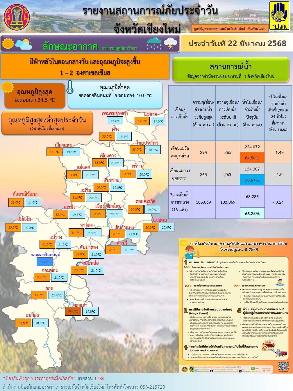 22 มีนาคม 2568 – ศูนย์บัญชาการเหตุการณ์จังหวัดเชียงใหม่ รายงานสถานการณ์อากาศและภัยพิบัติประจำวันที่ 22 มีนาคม 2568 พบว่าเชียงใหม่ยังคงเผชิญกับอากาศร้อนจัดในช่วงกลางวัน ขณะที่หมอกควันและฝุ่นละออง PM2.5 ยังคงเป็นปัญหาสำคัญในหลายพื้นที่