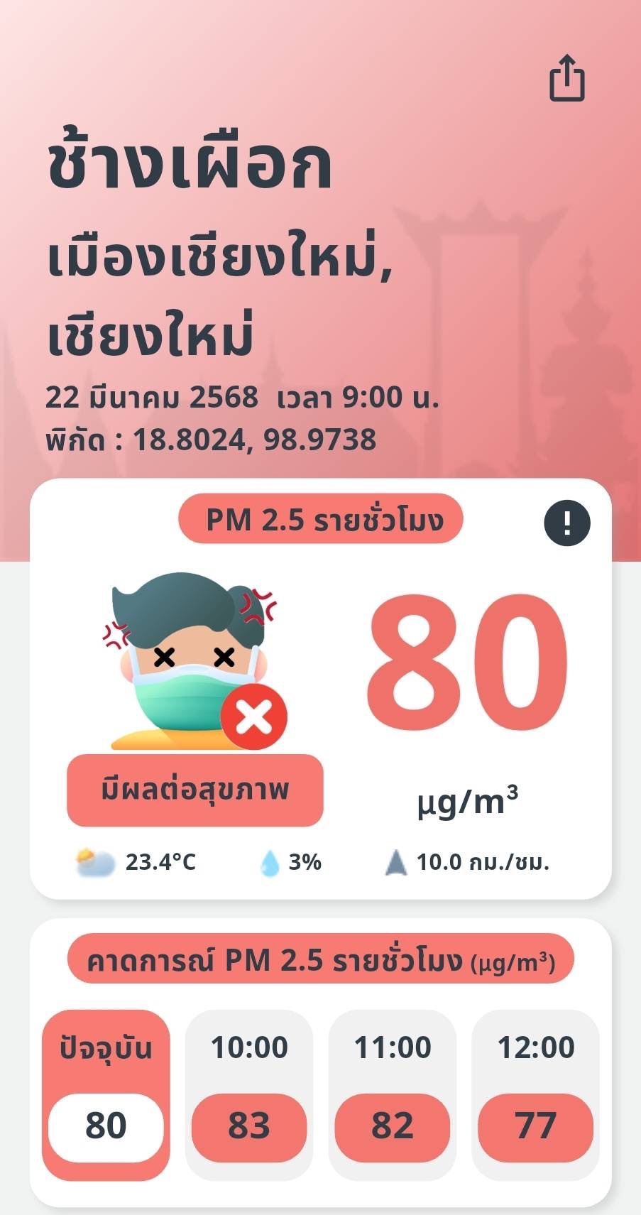ช่วงเวลา 09.00 น. 22 มี.ค. 68 จังหวัดเชียงใหม่ขึ้นอันดับ 5 ของโลกอากาศแย่ที่สุด ทั้งจังหวัด PM2.5 เกินค่ามาตรฐาน พบอำเภอฮอดPM2.5 สูงสุด 144 มคก./ลบ.ม. วันนี้มวลอากาศเย็นอ่อนแรงลงส่งผลให้การระบายอากาศได้ลดลง สภาวะอากาศที่มีผลต่อการสะสมฝุ่นละอองในระยะนี้
