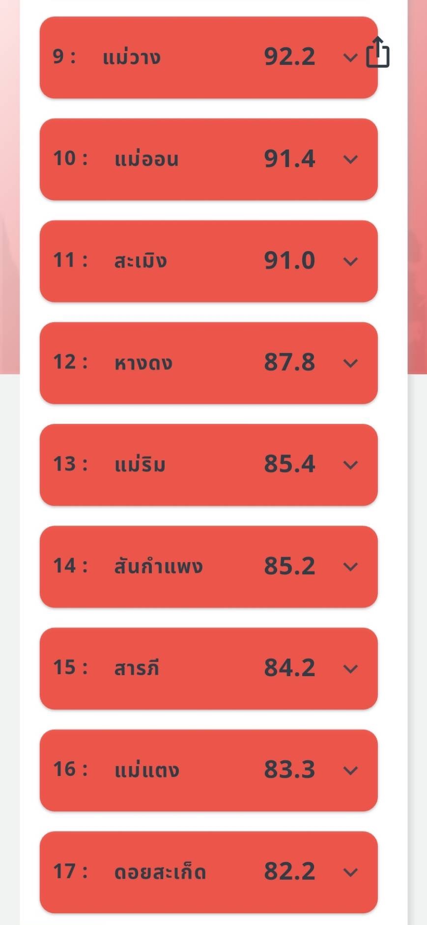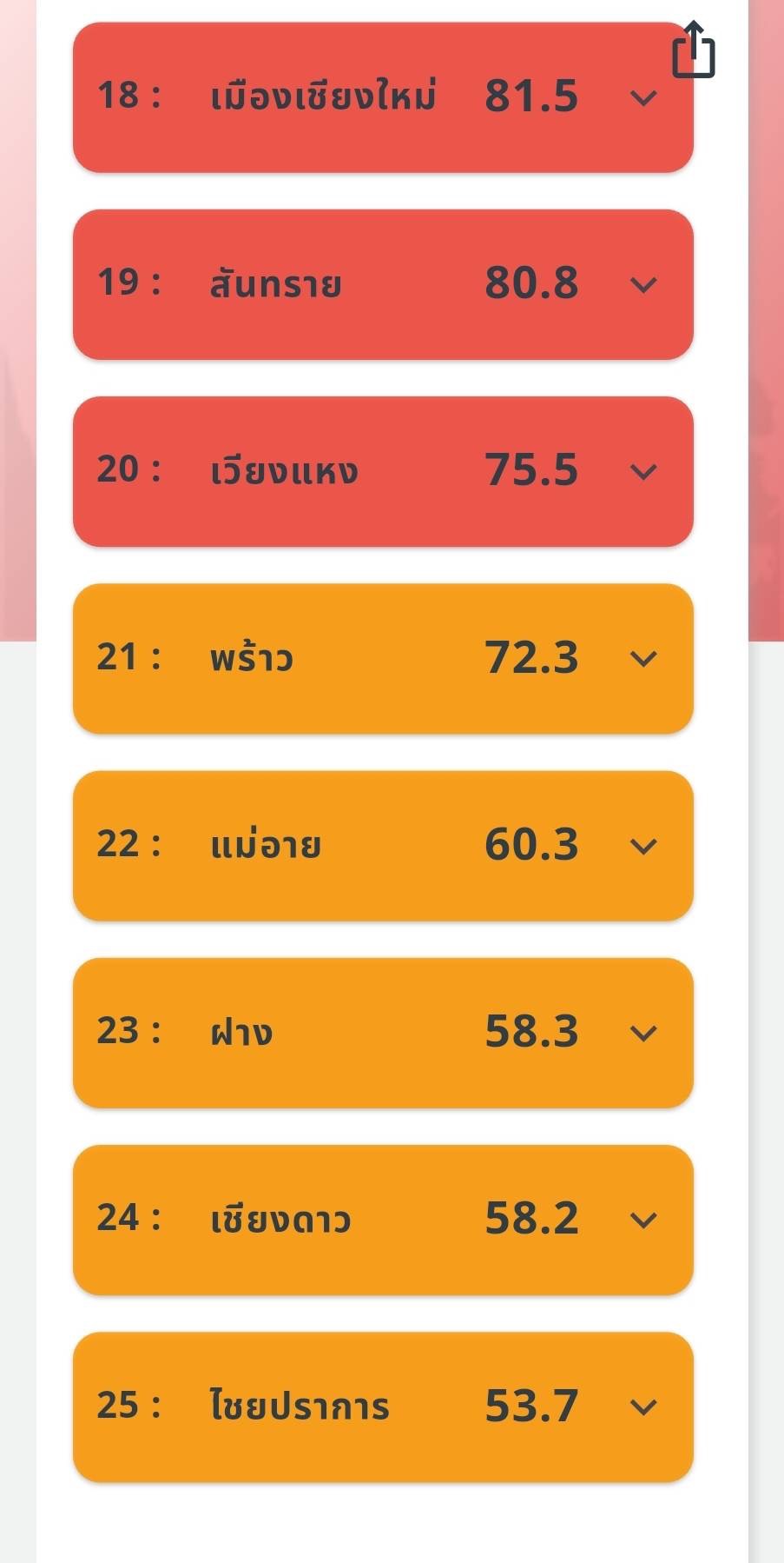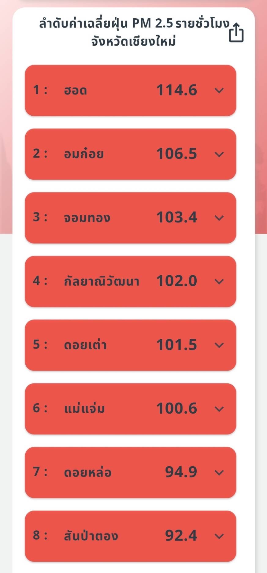 จากสำนักงานพัฒนาเทคโนโลยีอวกาศและภูมิสารสนเทศ (องค์การมหาชน) ผ่านทางแอพพลิเคชั่น เช็คฝุ่น ระบบติดตาม PM2.5 เวลา 09.00 น. ของวันที่ 22 มีนาคม 2568 จำนวน 25 อำเภอของจังหวัดเชียงใหม่ ค่าฝุ่นละอองขนาดเล็ก PM2.5 เกินค่ามาตรฐาน 37.5 ไมโครกรัมต่อลูกบาศก์เมตร มีค่าตั้งแต่ 53.7 -144.6 ไมโครกรัมต่อลูกบาศก์เมตร เป็นสีแดง 20 อำเภอ เป็นสีส้ม 5 อำเภอ ข้อมูลรายอำเภอของจังหวัดเชียงใหม่ 5 อันดับสูงสุด พบมากที่สุดที่อำเภอฮอด เป็นสีแดง วัดได้ 144.6 ไมโครกรัมต่อลูกบาศก์เมตร .อันดับ 2 อำเภออมก๋อย วัดได้ 106.5 ไมโครกรัมต่อลูกบาศก์เมตร ,อันดับ 3 อำเภอจอมทอง วัดได้ 103.4 ไมโครกรัมต่อลูกบาศก์เมตร ,อันดับ 4 อำเภอกัลยาณิวัฒนา วัดได้ 102.0 ไมโครกรัมต่อลูกบาศก์เมตร และอันดับ 5 อำเภอดอยเต่า วัดได้ 101.5 ไมโครกรัมต่อลูกบาศก์เมตร