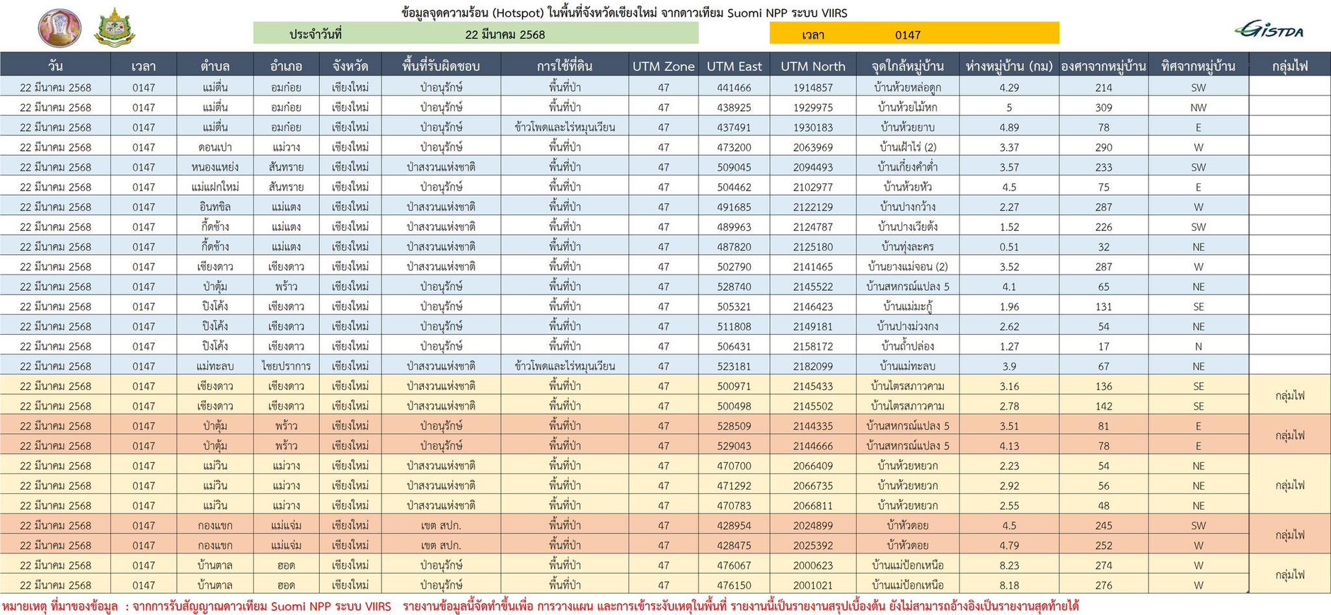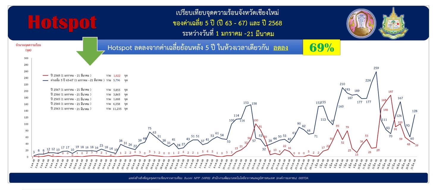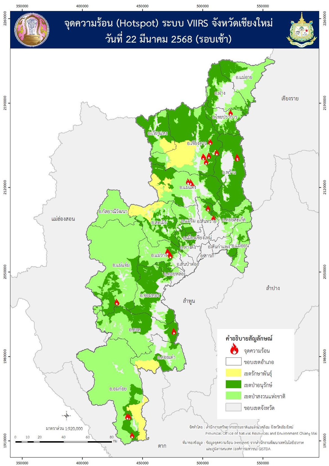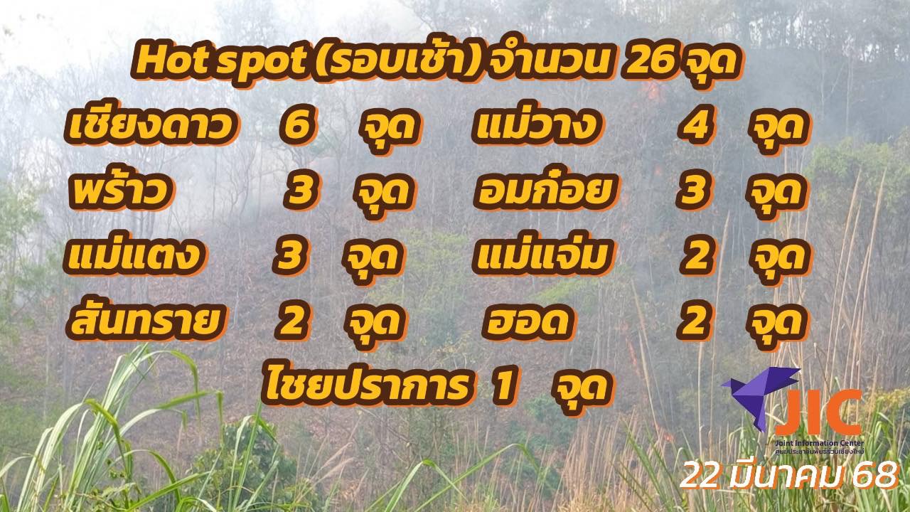 จากการรายงาน ศูนย์อำนวยการป้องกันและแก้ไขปัญหาไฟป่า หมอกควัน และฝุ่นละอองขนาดเล็ก (PM 2.5) จังหวัดเชียงใหม่ รายงานจุดความร้อน (Hotspot) จาก GISTDA ประจำวันที่ 22 มีนาคม 2568 (รอบเช้า) ข้อมูลจาก suomi-NPP เวลา 01.47 น. จำนวน 26 จุด จำนวน 9 อำเภอ มากที่สุดอำเภอเชียงดาว 6 จุด ,อำเภอแม่วาง 4 จุด ,อำเภอพร้าว 3 จุด ,อำเภออมก๋อย 3 จุด ,อำเภอแม่แตง 3 จุด ,อำเภอแม่แจ่ม 2 จุด ,อำเภอสันทราย 2 จุด ,อำเภอฮอด 2 จุดและอำเภอไชยปราการ 1 จุด ส่วนจุดความร้อนสะสมตั้งแต่วันที่ 1 ม.ค. – 21 มี.ค. 2568 ทั้งหมดจำนวน 1,822 จุด (ข้อมูลสรุปจาก NASA Firm )