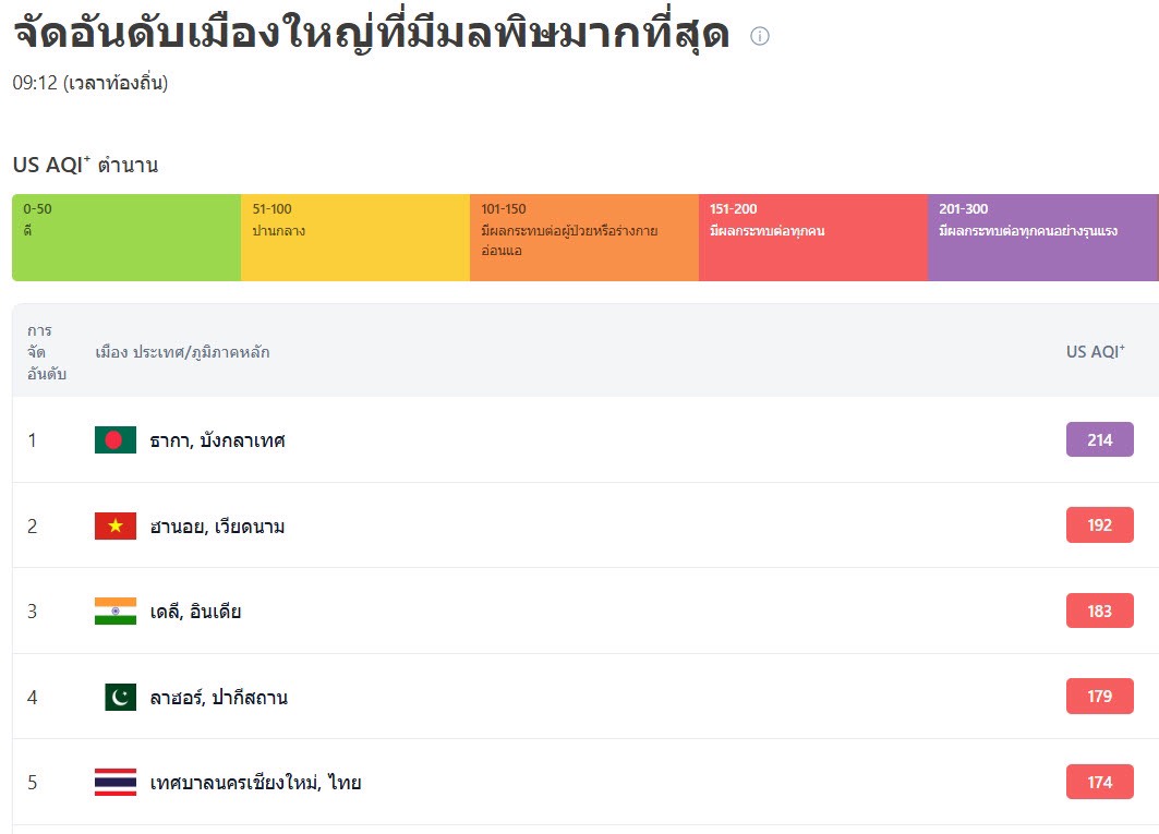 ล่าสุด ตามเวลาแบบเรียลไทม์ ช่วงเวล 09.00 น. ผู้สื่อข่าวได้ตรวจสอบ ข้อมูลจากการตรวจวัดคุณภาพอากาศของประเทศไทย ผ่านเว็บไซด์ iqair.com ของการจัดอันดับเมืองที่มีคุณภาพอากาศแย่ที่สุดของโลก US.AQI ดัชนีคุณภาพอากาศ แบบเรียลไทม์ US.AQI วัดได้ 174 ไมโครกรัมต่อลูกบาศก์เมตร ขึ้นมาอันดับ ที่ 5 ของโลก มีผลกระทบต่อทุกคน และมลพิษทางอากาศ PM2.5 ใน เทศบาลนครเชียงใหม่ วัดได้ 88 ไมโครกรัมต่อลูกบาศก์เมตร ความเข้มข้น PM2.5 ขณะนี้เป็น 17.8 เท่าของค่าแนวทาง PM2.5 ประจำปีขององค์การอนามัยโลก มีผลกระทบต่อทุกคน หลีกเลี่ยงการออกกำลังกายนอกบ้าน ปิดหน้าต่างของคุณเพื่อหลีกเลี่ยงอากาศภายนอกบ้านที่สกปรก สวมหน้ากากภายนอกบ้านและเปิดเครื่องฟอกอากาศ