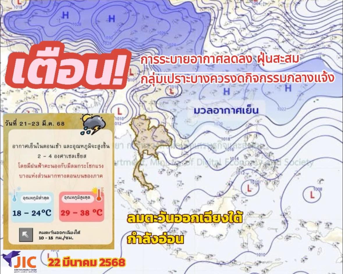 ส่วนศูนย์อุตุนิยมวิทยาภาคเหนือ รายงานสภาพอากาศ วันที่ 22 มี.ค. 68 บริเวณความกดอากาศสูงหรือมวลอากาศเย็นกำลังค่อนข้างแรงที่ปกคลุมประเทศไทยตอนบนมีกำลังอ่อนลง ลักษณะเช่นนี้ทำให้บริเวณดังกล่าวจะมีอุณหภูมิสูงขึ้น แต่ยังคงทำให้ภาคเหนือ ภาคตะวันออกเฉียงเหนือ และภาคกลางมีอากาศเย็นในตอนเช้า ขอให้ประชาชนบริเวณประเทศไทยตอนบนดูแลรักษาสุขภาพจากสภาพอากาศที่เปลี่ยนแปลง สภาวะอากาศที่มีผลต่อการสะสมฝุ่นละอองในระยะนี้: การสะสมของฝุ่นละออง/หมอกควันบริเวณประเทศไทยตอนบนอยู่ในเกณฑ์ปานกลางถึงค่อนข้างมาก เนื่องจากมีลมที่พัดปกคลุมมีกำลังอ่อนลง ออกประกาศ 22 มีนาคม 2568 ภาคเหนือ อากาศเย็นในตอนเช้า และอุณภูมิจะสูงขึ้น 1 – 3 องศาเซลเซียส กับมีอากาศร้อนในตอนกลางวันอุณหภูมิต่ำสุด 18-23 องศาเซลเซียส อุณหภูมิสูงสุด 30-37 องศาเซลเซียส