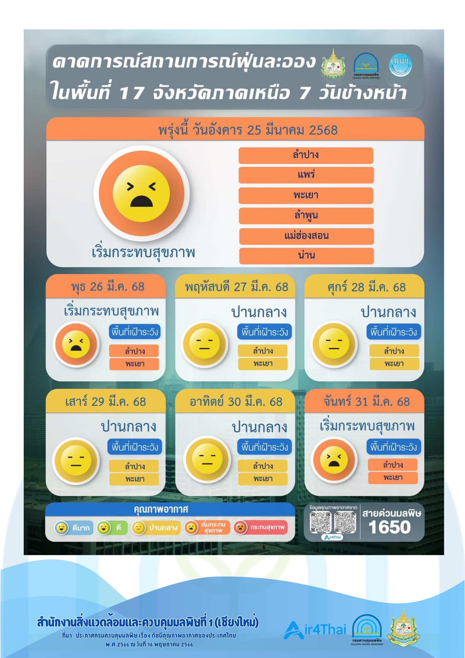 📢 สรุปสถานการณ์ฝุ่น PM2.5 ประจำวันที่ 24 มีนาคม 2568 ในพื้นที่รับผิดชอบของสำนักงานสิ่งแวดล้อมและควบคุมมลพิษที่ 1 (เชียงใหม่ เชียงราย ลำพูน แม่ฮ่องสอน)