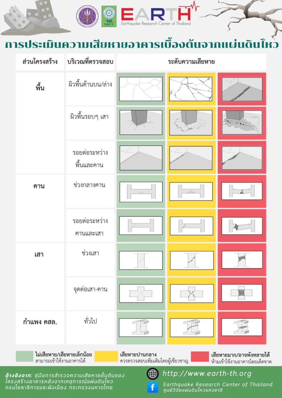 ดังนั้นเมื่อมีการสำรวจความเสียหายเบื้องต้นของโครงสร้างอาคารหลังจากเหตุการณ์แผ่นดินไหว ตามคู่มือของกรมโยธาธิการและผังเมือง และได้แนะนำโดยศูนย์วิจัยแผ่นดินไหวแห่งชาติ และสำนักงานการวิจัยแห่งชาติ (วช) ของโครงสร้างหลัก คือ เสา คาน กำแพงคอนกรีตเสริมเหล็ก และพื้นอาคาร แล้ว ไม่พบความเสียหาย หรือเสียหายเล็กน้อย (ดูภาพประกอบ) สามารถเข้าไปใช้อาคารได้โดยปลอดภัย