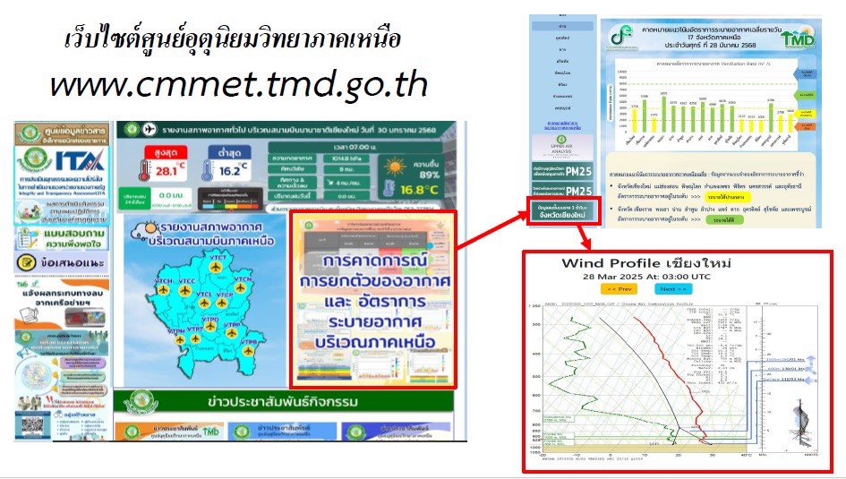 วันนี้ (1 เม.ย. 68) ดร.สุกฤษฎิ์ เกิดแสง ผู้อำนวยการศูนย์อุตุนิยมวิทยาภาคเหนือ ได้เปิดเผยต่อสื่อมวลชน ในการแถลงข่าวสื่อมวลชนจังหวัดเชียงใหม่ ครั้งที่ 12/2568 ของสำนักงานประชาสัมพันธ์จังหวัดเชียงใหม่ ที่ ห้องประชุมชั้น 3 ศาลากลางจังหวัดเชียงใหม่ เกี่ยวกับการรายงานสภาพอากาศและการคาดการณ์สถานการณ์ฝุ่นละอองขนาดเล็ก PM2.5 ในเดือนเมษายน 2568 โดยระบุว่า ขณะนี้กระแสลมถือว่ามีอิทธิพลต่อจังหวัดเชียงใหม่เป็นอย่างมาก โดยในเดือนมีนาคมที่ผ่านมาได้รับผลกระทบจากกระแสลมจากทางตอนใต้และทางตะวันตกเฉียงใต้ที่ได้พัดพาฝุ่น PM2.5 มาจากพื้นที่รอบข้างของจังหวัด โดยเฉพาะจากประเทศเพื่อนบ้าน ทั้งพม่าและลาว ประกอบกับอัตราการระบายอากาศถูกจัดอยู่ในระดับสีแดง จึงส่งผลให้มีทัศนวิสัยไม่ดี มีฝุ่น PM2.5 ปกคลุมหนาแน่นในจังหวัดเชียงใหม่ และส่งผลให้ฝุ่นเกินค่ามาตรฐานต่อเนื่องหลายวัน