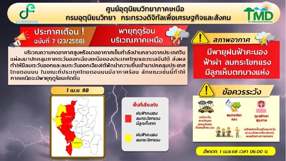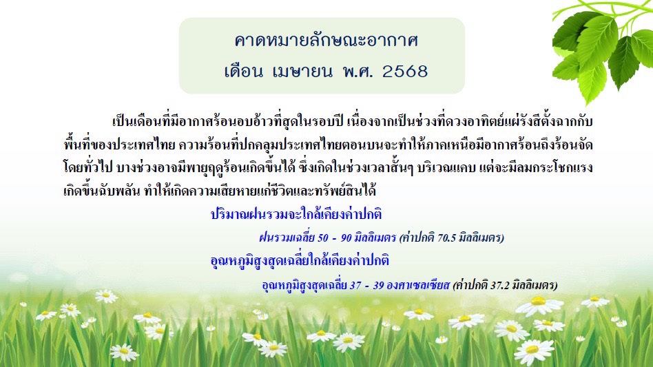 สำหรับลักษณะอากาศในช่วงเดือนเมษายนนี้ ทางศูนย์อุตุนิยมวิทยาภาคเหนือได้คาดการณ์ว่า จะเป็นช่วงเดือนที่มีอากาศร้อนอบอ้าวมากที่สุดในรอบปี เนื่องจากเป็นช่วงที่ดวงอาทิตย์แผ่รังสีตั้งฉากกับพื้นที่ของประเทศไทย ความร้อนที่ปกคลุมประเทศไทยตอนบนจะทำให้ภาคเหนือมีอากาศร้อนถึงร้อนจัดโดยทั่วไป บางช่วงอาจมีพายุฤดูร้อน มีลมกระโชกแรงเกิดขึ้นฉับพลัน หรือมีพายุลูกเห็บเกิดขึ้น ซึ่งอาจส่งผลต่อความเสียหายแก่ชีวิตและทรัพย์สินได้ ก็ขอให้ประชาชนเฝ้าระวังในเรื่องของสิ่งก่อสร้างที่มีความสูง เลี่ยงการออกในที่โล่ง และดูพืชผลการเกษตรให้ดี ซึ่งกรมอุตุนิยมวิทยาได้มีการออกประกาศแจ้งเตือนไปเรียบร้อยแล้ว