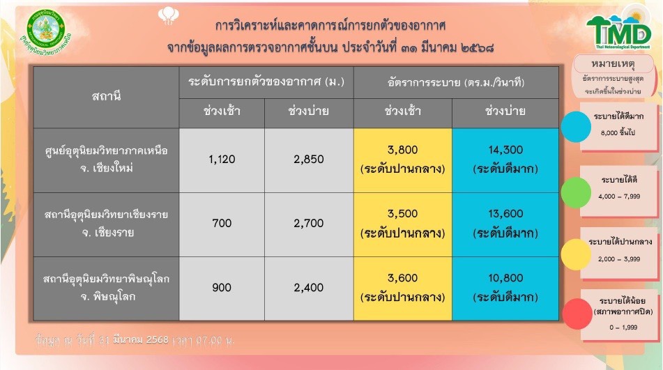 โดยในเช้าวันนี้ (1 เม.ย. 68) ซึ่งเป็นวันเริ่มต้นของเดือนเมษายน อัตราการระบายอากาศในตัวเมืองเชียงใหม่เริ่มดีขึ้น อยู่ในระดับสีเหลือง นั่นคือ มีการยกตัวของอากาศดีขึ้น มีลมระบายมากขึ้น และช่วยให้ค่าของฝุ่น PM2.5 ในอากาศลดลงเล็กน้อย อย่างไรก็ตามในภาพรวมทั้งเดือนเมษายนนี้ ยังคงได้รับผลกระทบจากกระแสลมข้ามถิ่นที่พัดพาฝุ่นเข้ามาในจังหวัดได้อยู่