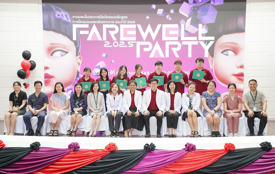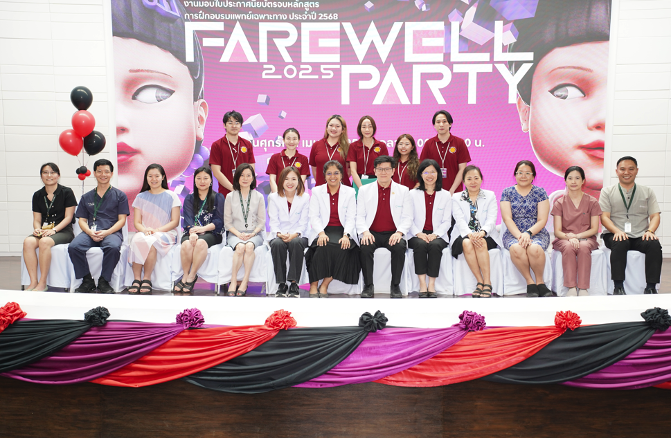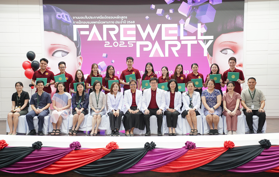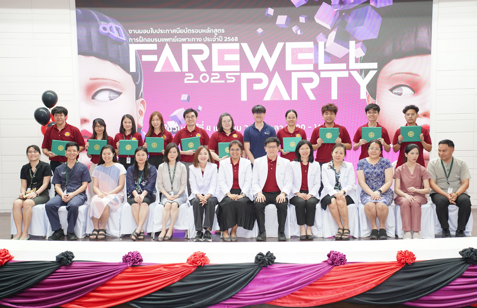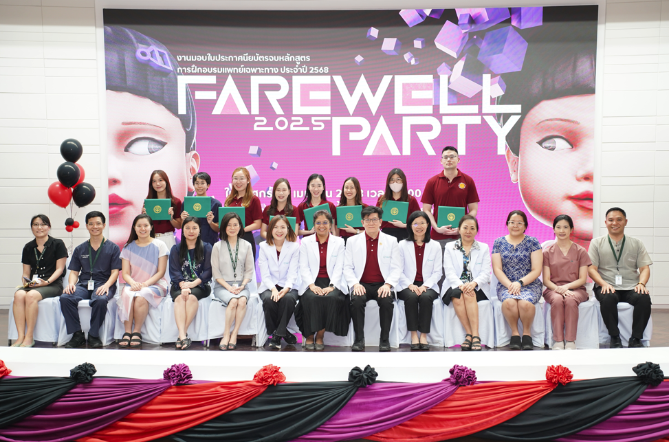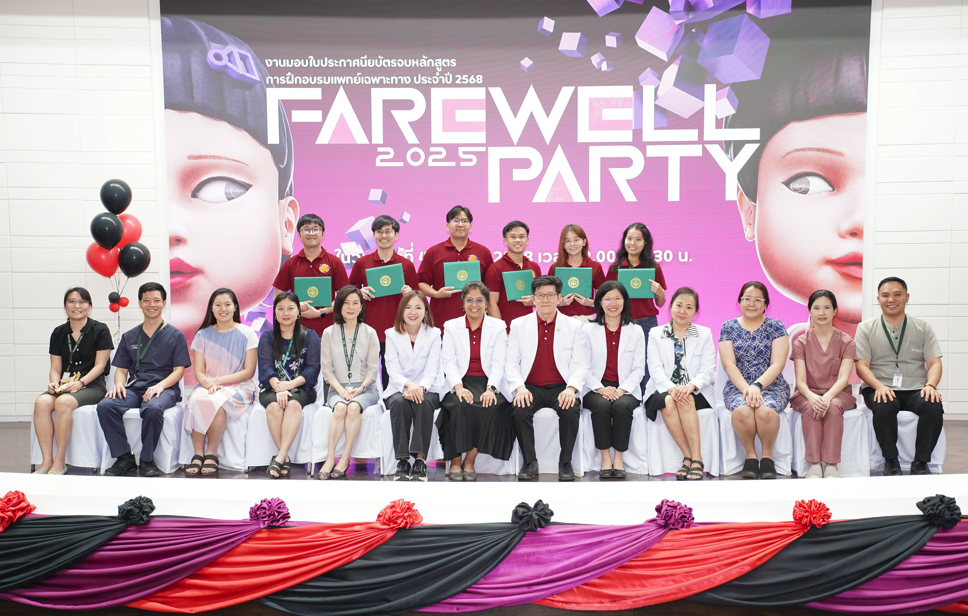 รศ.นพ.นเรนทร์ โชติรสนิรมิต คณบดีคณะแพทยศาสตร์ มช. เป็นประธานในพิธีเปิดงานมอบใบประกาศนียบัตรจบหลักสูตรการฝึกอบรมแพทย์เฉพาะทาง ประจำปี 2568 “Farewell Party 2025” โดยมี รศ.พญ.อรินทยา พรหมินธิกุล ผู้อำนวยการโรงพยาบาลมหาราชนครเชียงใหม่ พร้อมด้วย รศ.ดร.พญ.จิราภรณ์ โกรานา รองคณบดีด้านการฝึกอบรมแพทย์เฉพาะทาง และ รศ.พญ.ณัฐรุจี วิวรรธนดิฐกุล ผู้ช่วยคณบดีด้านการฝึกอบรมแพทย์เฉพาะทาง ร่วมกล่าวต้อนรับ และรศ.ดร.นพ.อภิชาติ ตันตระวรศิลป์ รองคณบดีด้านการศึกษาหลังปริญญา ร่วมภายในงาน โดยภายในงานได้จัดให้มีการมอบใบประกาศนียบัตรให้แก่ แพทย์เฉพาะทางที่จบหลักสูตร จำนวน 216 คน ในวันที่ 4 เมษายน 2568 ณ ห้องประชุมชั้น 2 อาคารเรียนรวม คณะแพทยศาสตร์ มช.