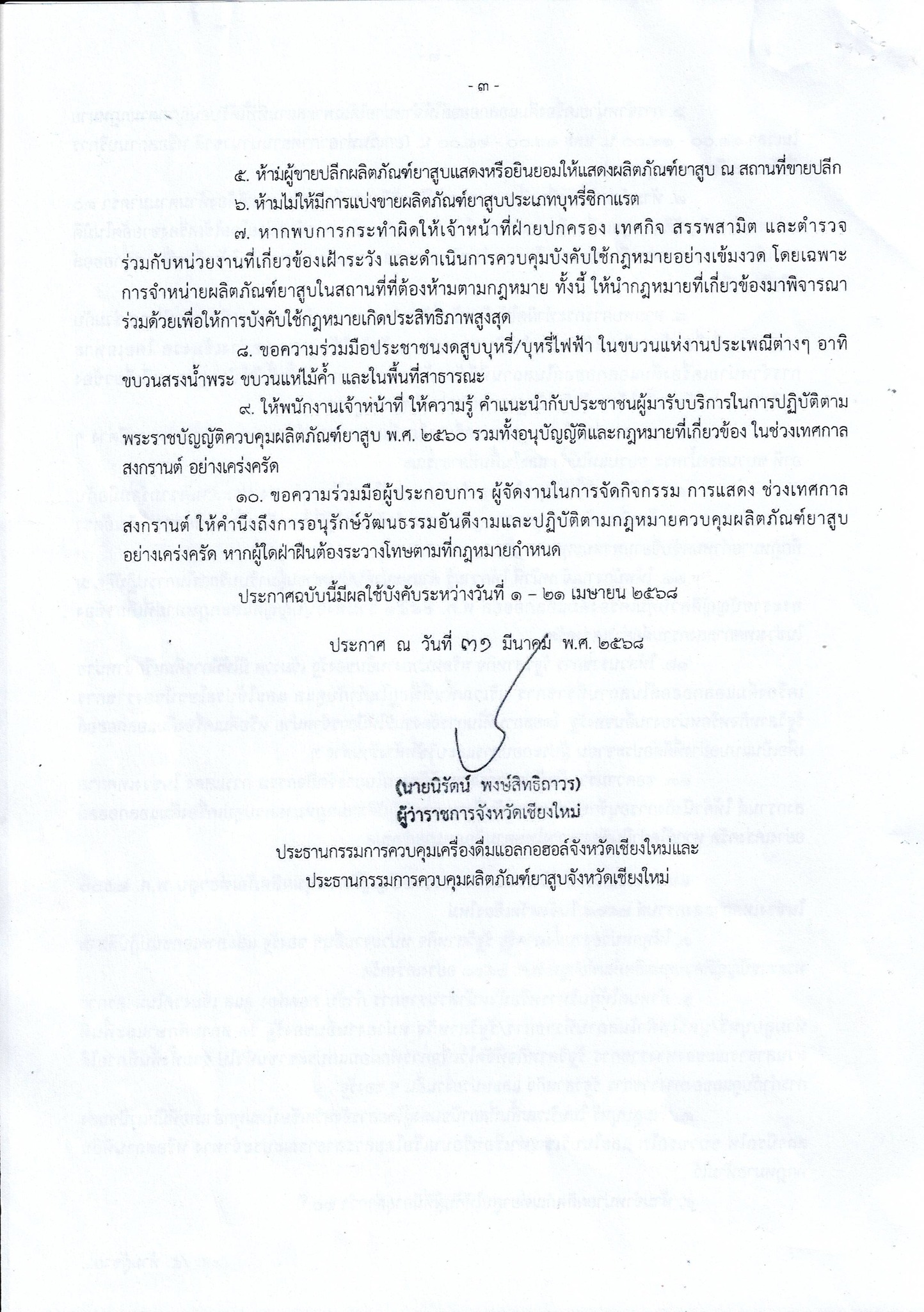 31 มี.ค. 68 นายนิรัตน์ พงษ์สิทธิถาวร ผู้ว่าราชการจังหวัดเชียงใหม่ ประธานกรรมการคณะกรรมการควบคุมเครื่องดื่มแอลกอฮอล์จังหวัดเชียงใหม่และคณะกรรมการควบคุมผลิตภัณฑ์ยาสูบจังหวัดเชียงใหม่ ออกประกาศกำหนดแนวทางในการดำเนินงานตามพระราชบัญญัติควบคุมเครื่องดื่มแอลกอฮอล์และผลิตภัณฑ์ยาสูบ ในช่วงเทศกาลสงกรานต์ ระหว่างวันที่ 1 – 21 เมษายน 2568 นี้