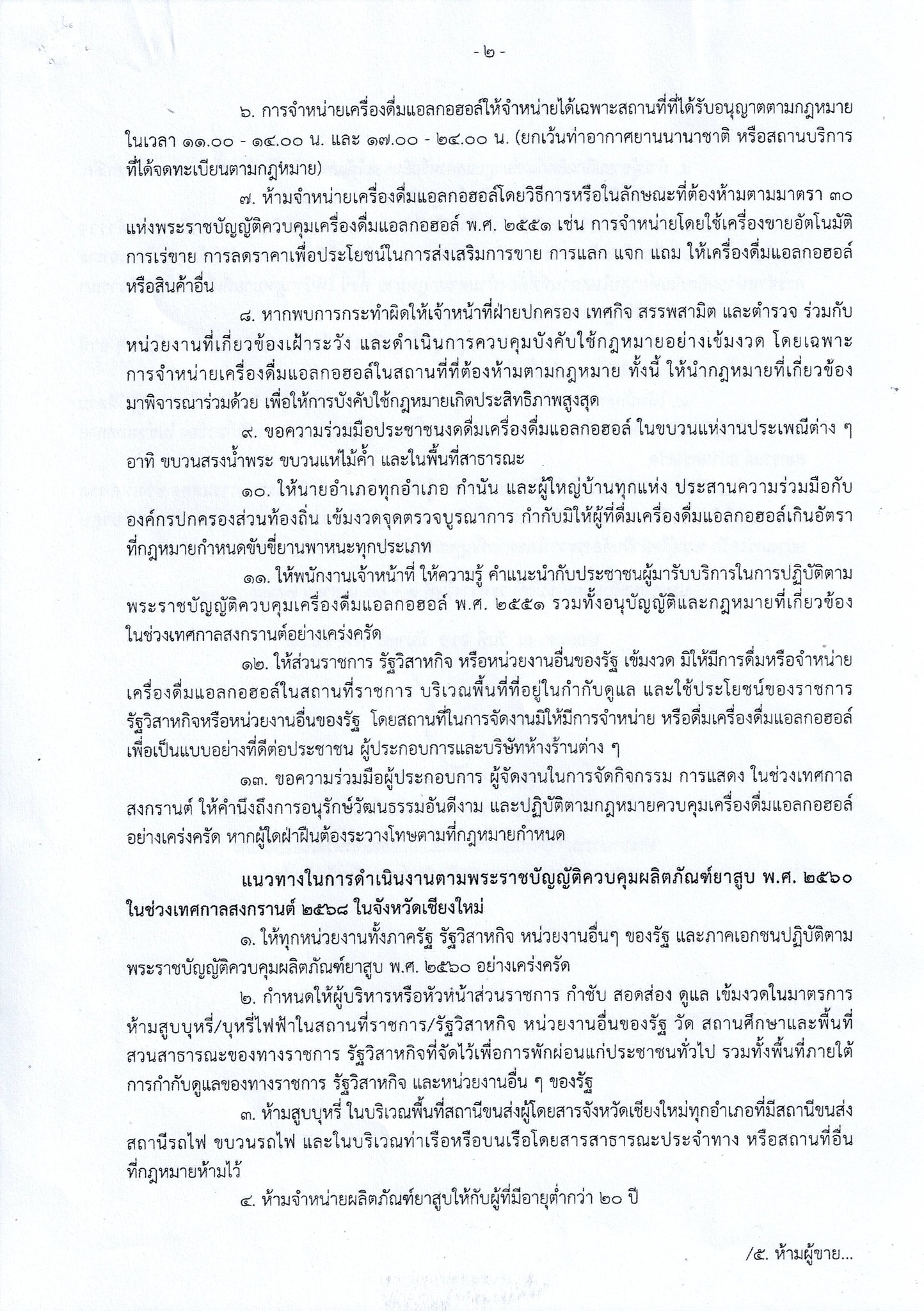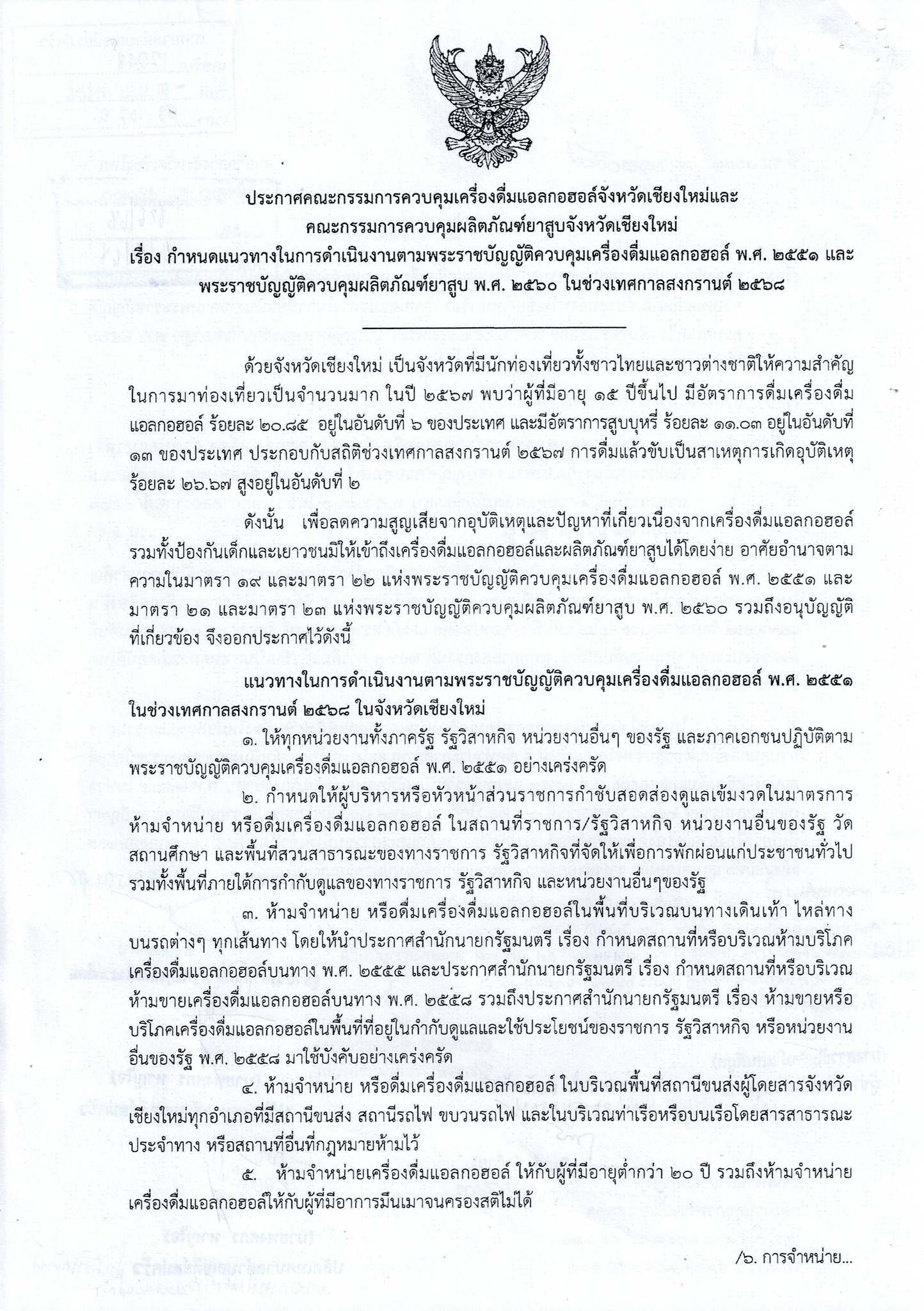 เชียงใหม่ ออกประกาศคณะกรรมการควบคุมเครื่องดื่มแอลกอฮอล์ฯ ช่วงเทศกาลสงกรานต์