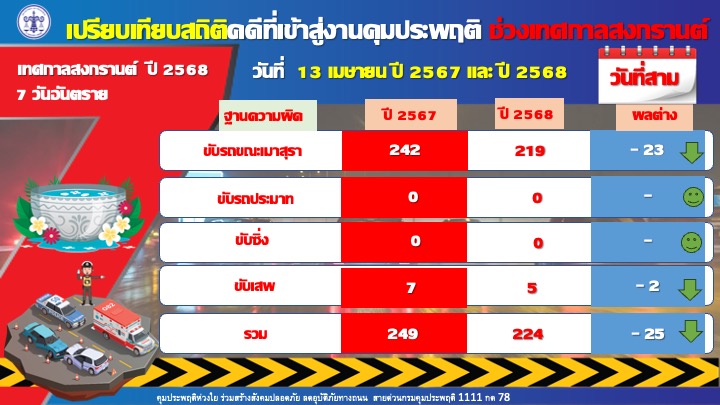 จังหวัดที่มีคดีเมาขับสูงสุด ได้แก่ เชียงใหม่ 136 คดี รองลงมาคือ สมุทรปราการ 123 คดี และกรุงเทพมหานคร 118 คดี ทั้งนี้ เมื่อเปรียบเทียบสถิติคดีเข้าสู่คุมประพฤติในวันที่ 3 ของปี 2567 พบว่า คดีขับรถขณะเมาสุรา จำนวน 242 คดี และ ปี 2568 จำนวน 219 คดี ลดลง 23 คดี