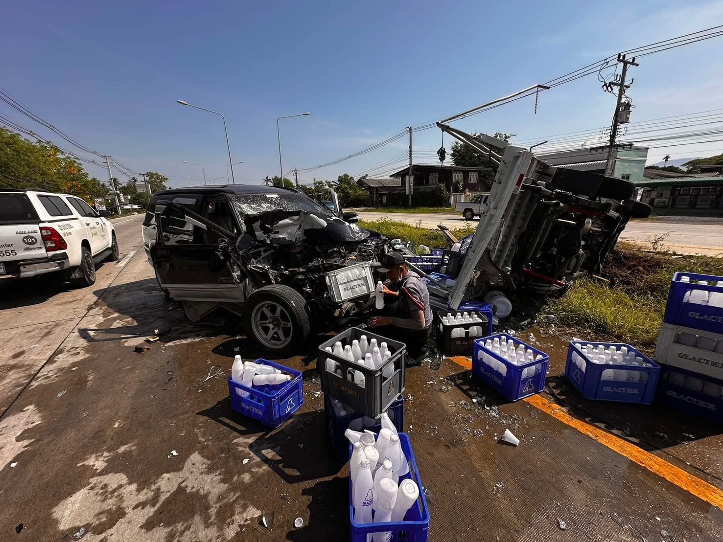 รถยนต์ชนท้ายกระบะส่งลังน้ำบริเวณยูเทิร์นป่าบง ขวดน้ำกระจายตกขวางถนน จนท.กู้ภัยช่วยเหลือคนเจ็บเคลียร์พื้นที่จนปลอดภัย