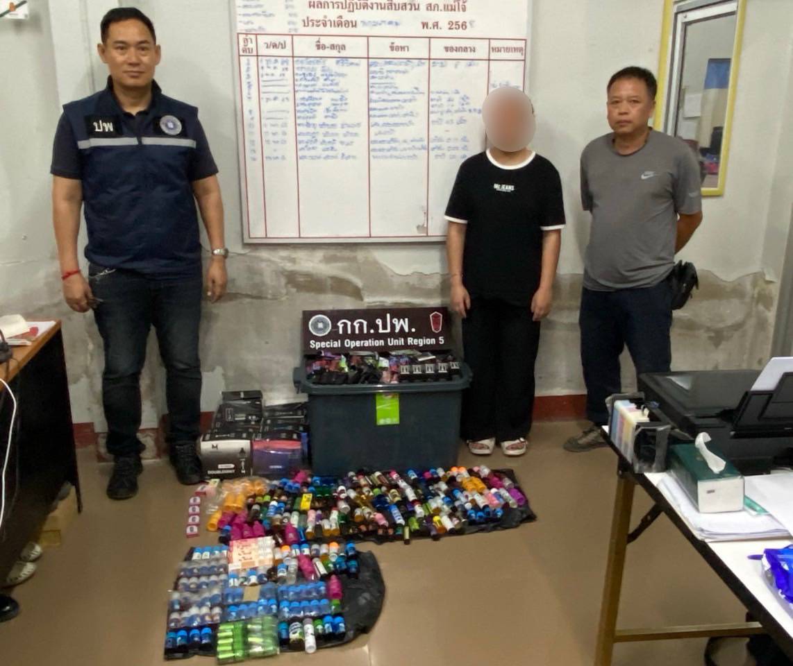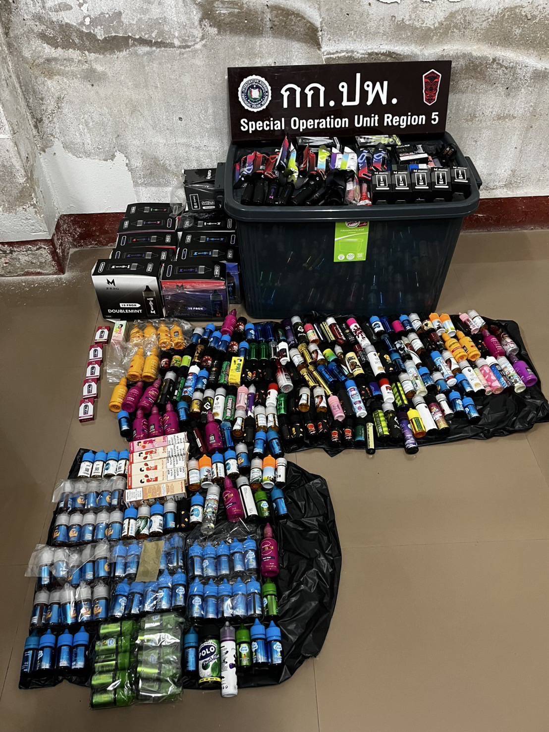 การจับกุมครั้งนี้ เจ้าหน้าที่ได้รับแจ้งมีการลักลอบจำหน่ายบุหรี่ไฟฟ้ามอมเมาเยาวชน โดยขายทางเพจเฟซบุ๊ก จึงส่งสายไปติดต่อล่อชื้อโดยนัดส่งของกันที่บริเวณลานจอดรถของหอพักแห่งหนี่งใน ต.หนองหาร อ.สันทราย จ.เชียงใหม่ จนพบเจอผู้ต้องหาเอาบุหรี่ไฟฟ้ามาส่งหนึ่งอัน จึงจับกุมตัวไว้และขึ้นไปค้นในห้องพักของหอพักดังกล่าว พบของกลางจำนวนมากจึงจับกุมดำเนินคดีตามกฏหมาย