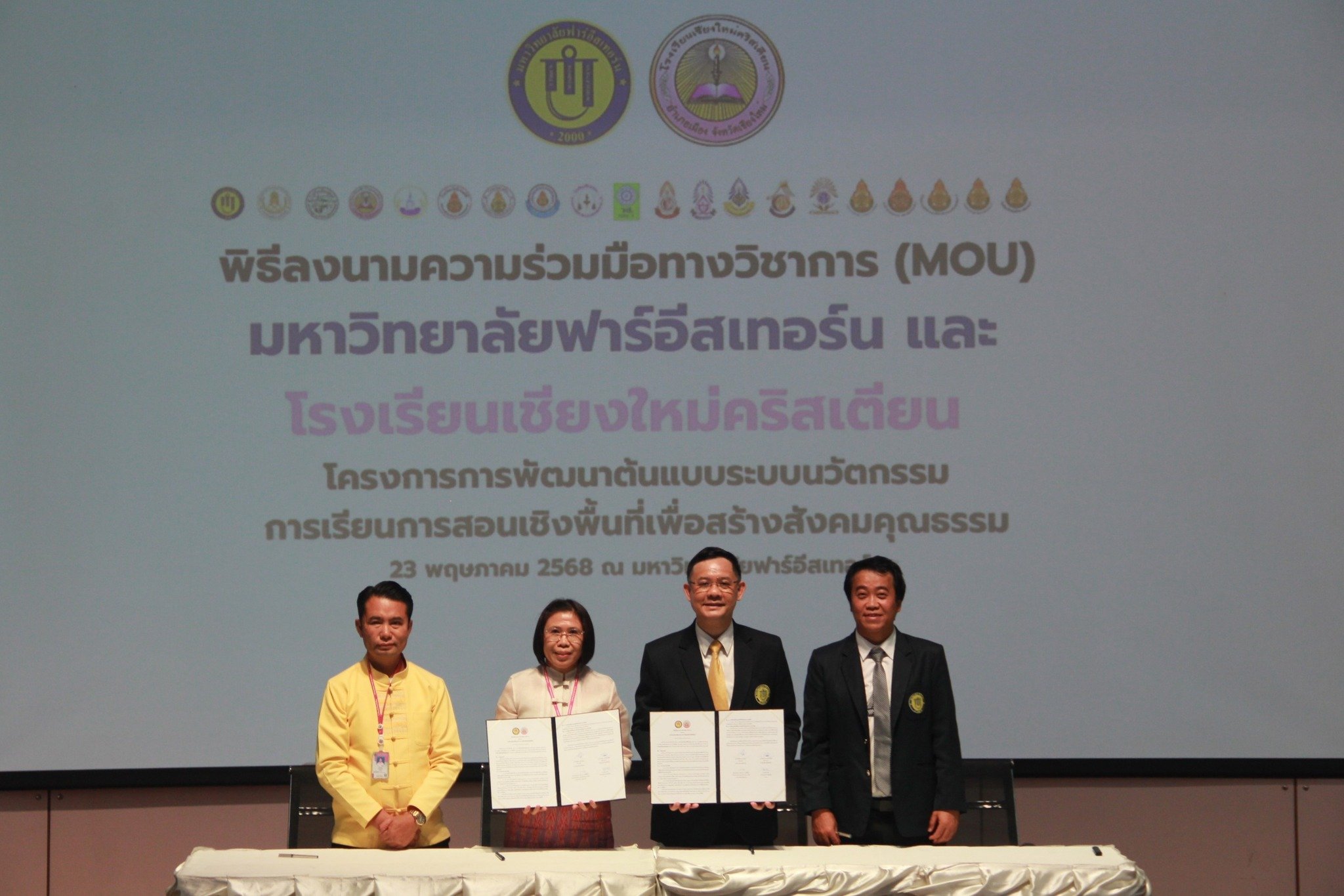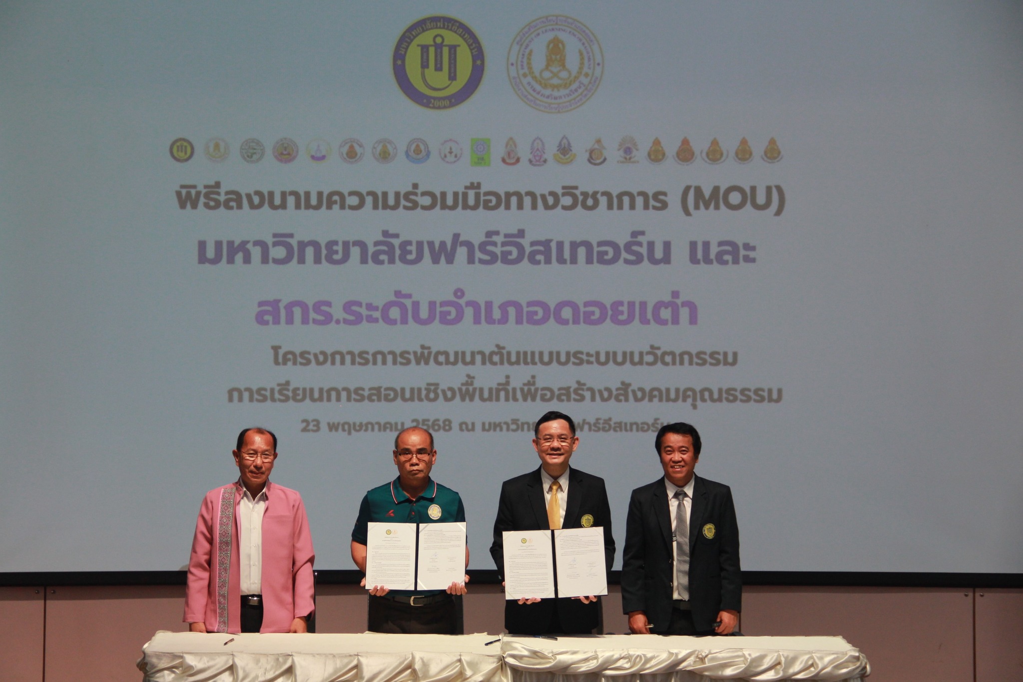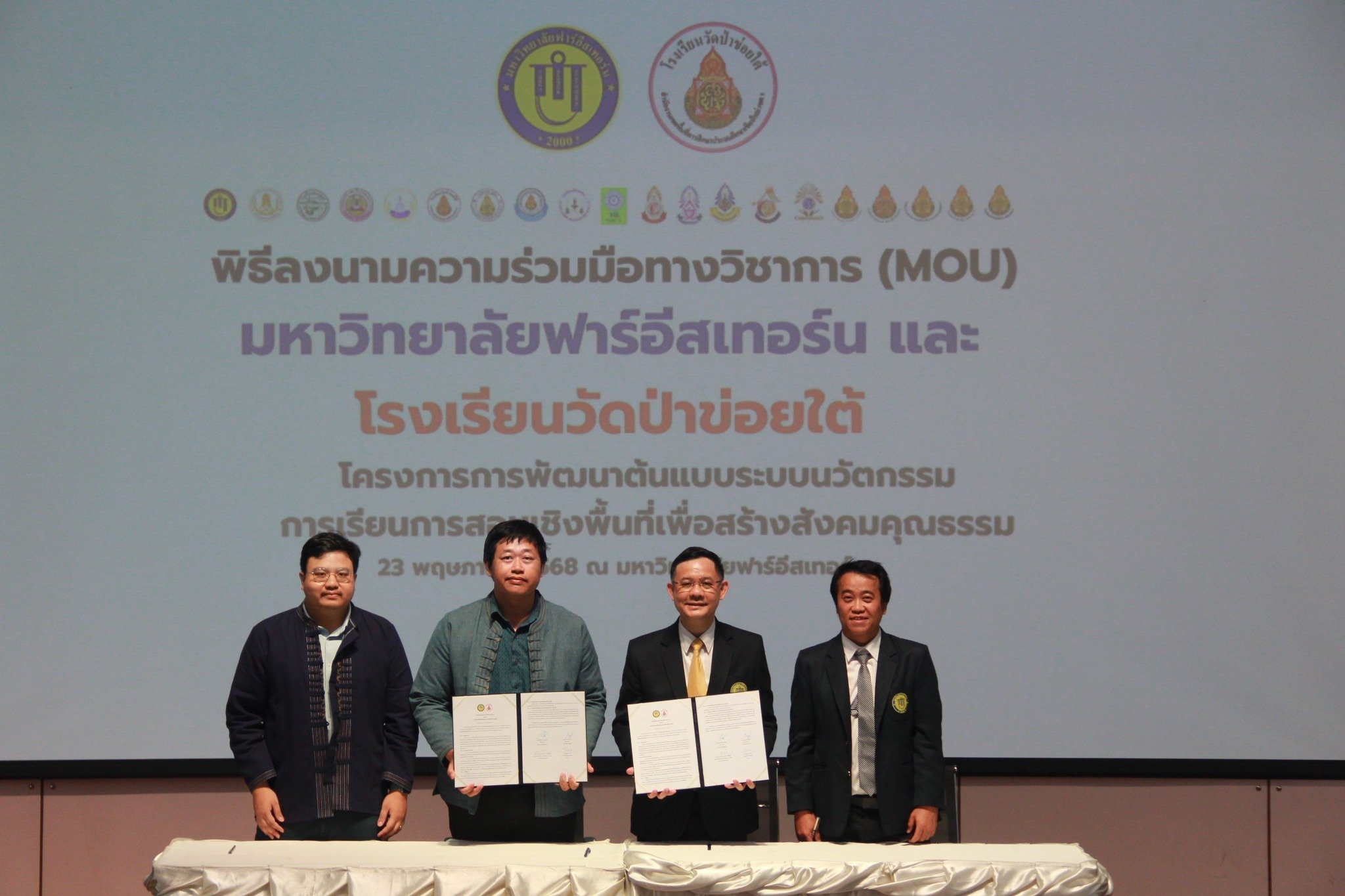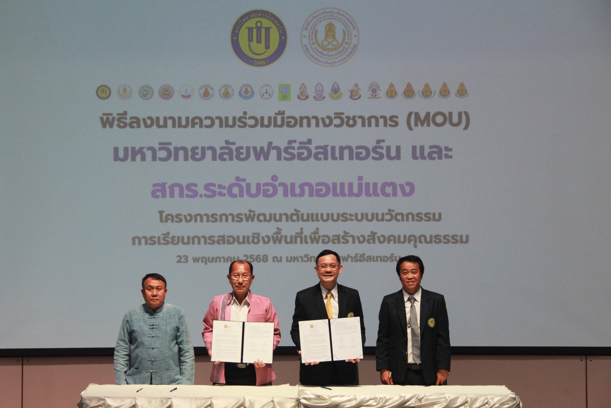 ดร.กิตติพัฒน์ สุวรรณชิน อธิการบดีมหาวิทยาลัยฟาร์อีสเทอร์น นำทีมนักวิจัยมหาวิทยาลัยฟาร์อีสเทอร์น ลงนามบันทึกข้อตกลงความร่วมมือ (MOU) กับ 24 สถานศึกษาในจังหวัดเชียงใหม่ ภายใต้โครงการวิจัย “การพัฒนาต้นแบบระบบนวัตกรรมการเรียนการสอนเชิงพื้นที่เพื่อสร้างสังคมคุณธรรม” โดยได้รับทุนสนับสนุนการวิจัยจากสำนักงานการวิจัยแห่งชาติ (วช.)